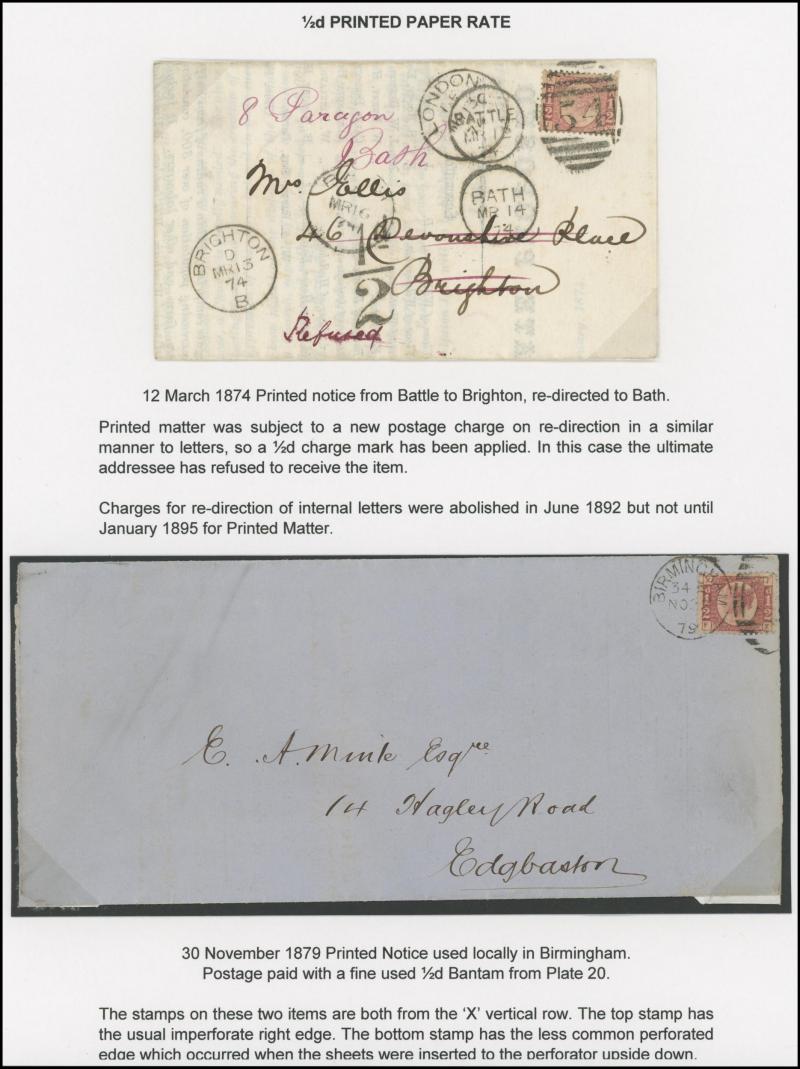 boxed handstamp and '1D'-in-circle tax handstamp, 1874 'Polegate Proposed Church' folded notice from Battle to Brighton re-directed to Bath with '½'[d] tax handstamp but refused, 1877 large-part folded notice with Scotland 'ALLOA - 7' duplex cancel