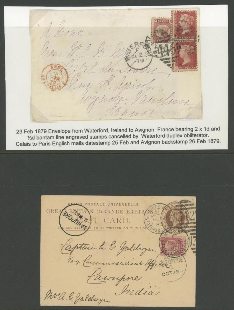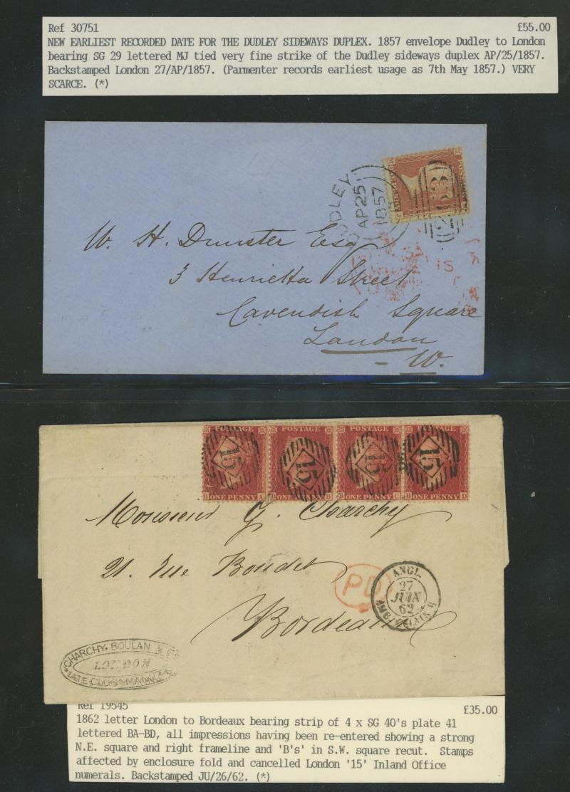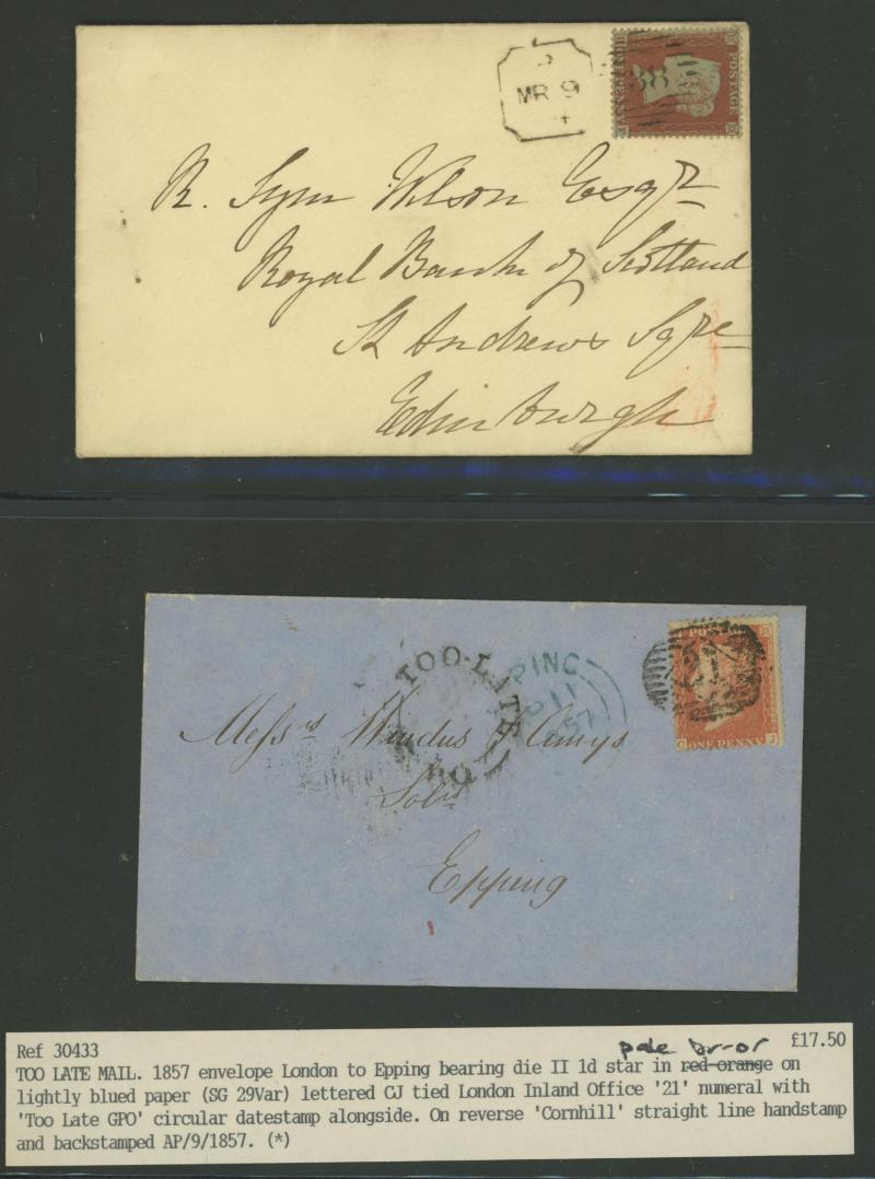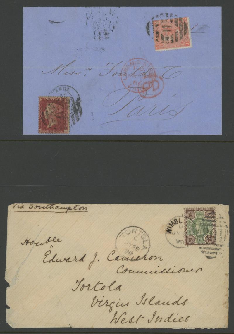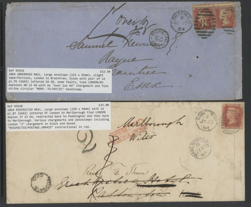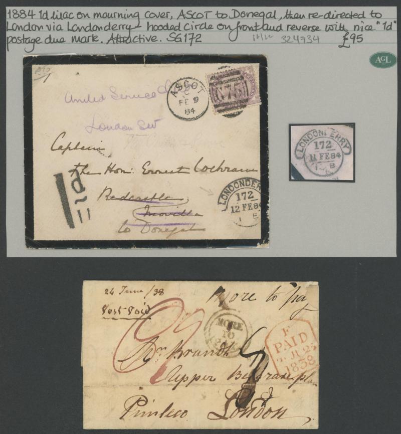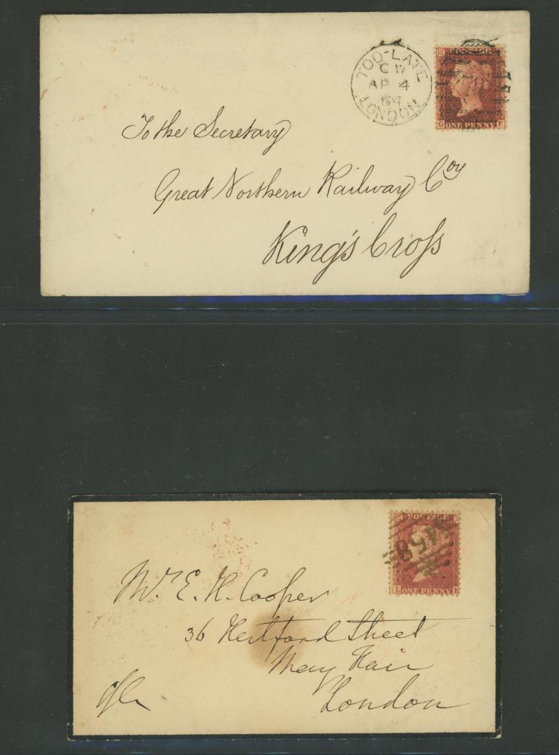 and other markings noted 'TOO LATE/LONDON' 1864 duplex, Ballisodare, Ireland very fine Numeral '458' with fine backstamp, Dublin 'POSTED SINCE 5PM/TnRECr/LAST NIGHT' backstamps on three 1856-57 envelopes, 'DUDLEY - 263' sideways duplex, Edinburgh