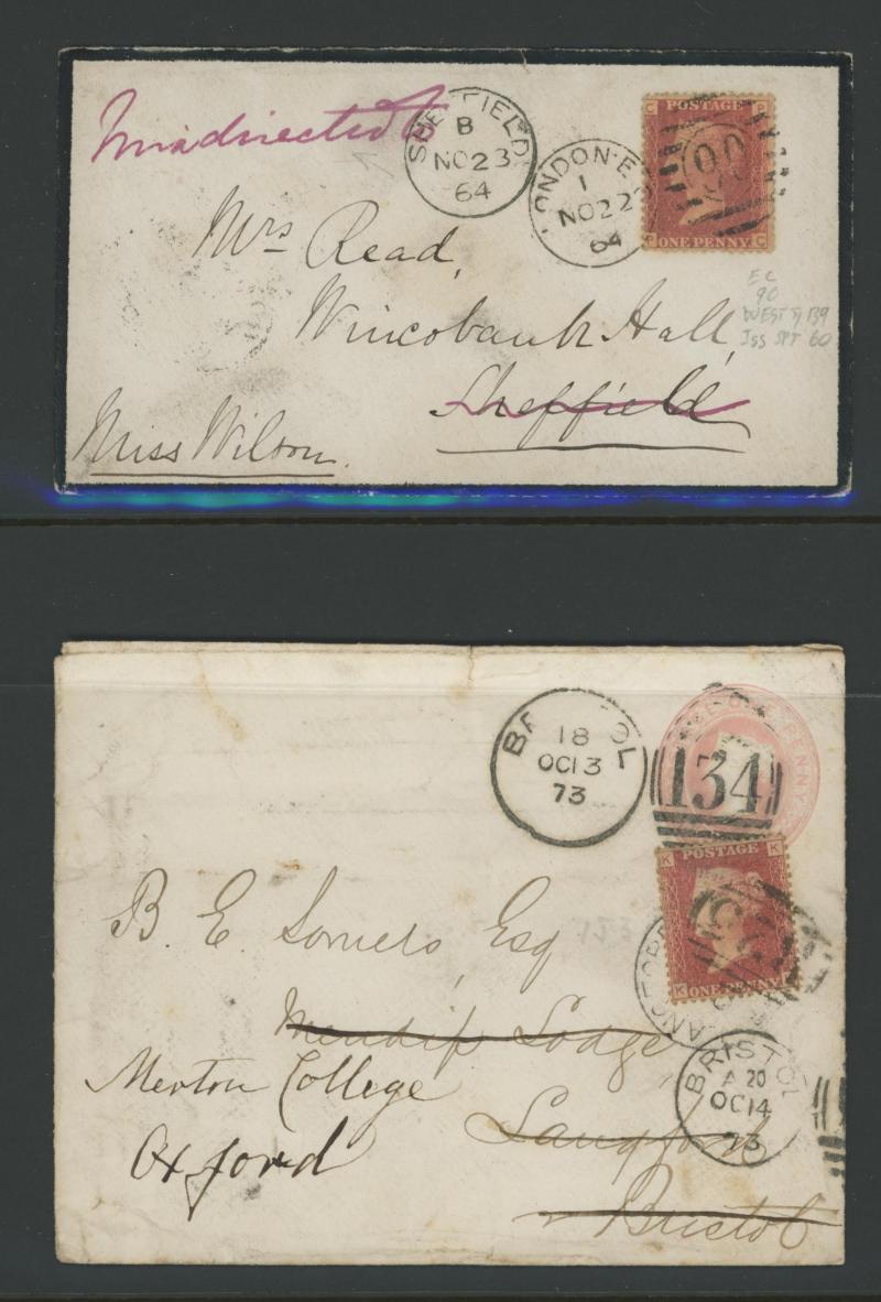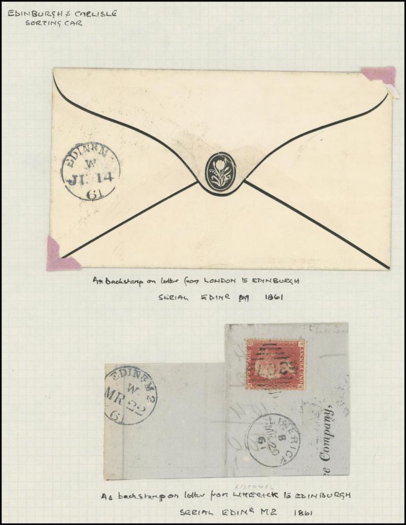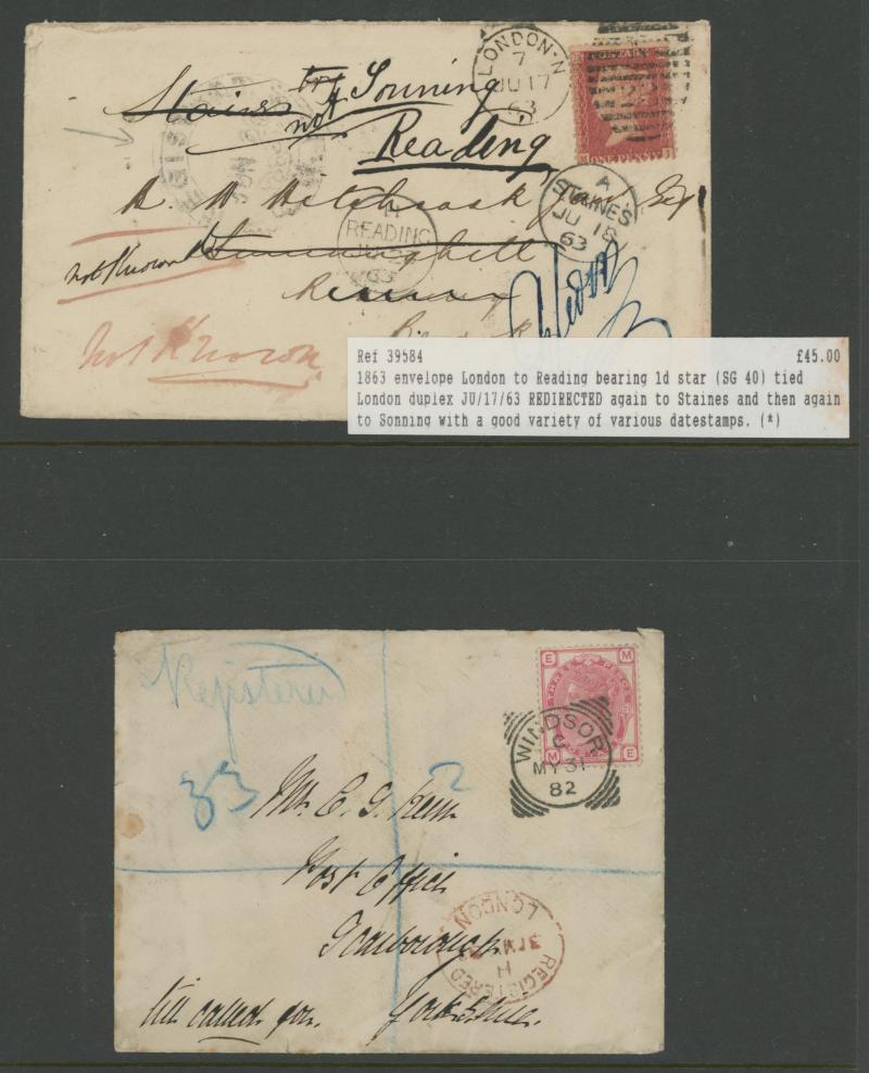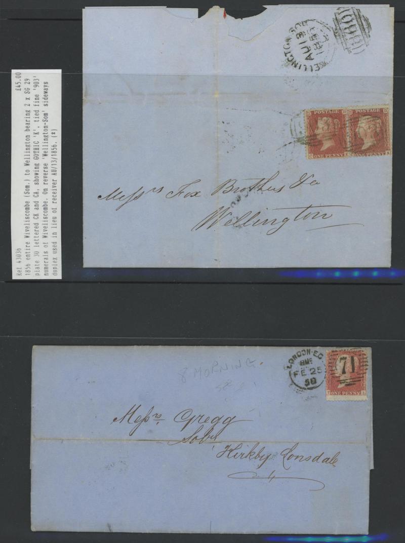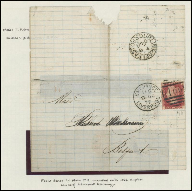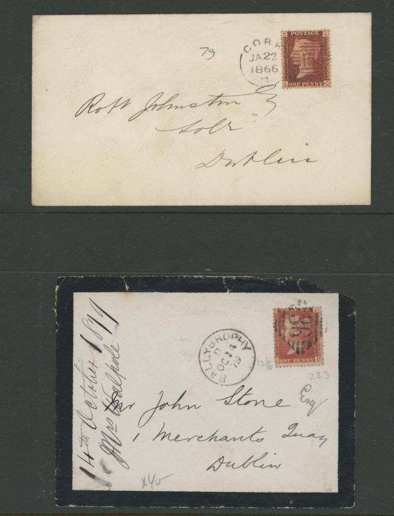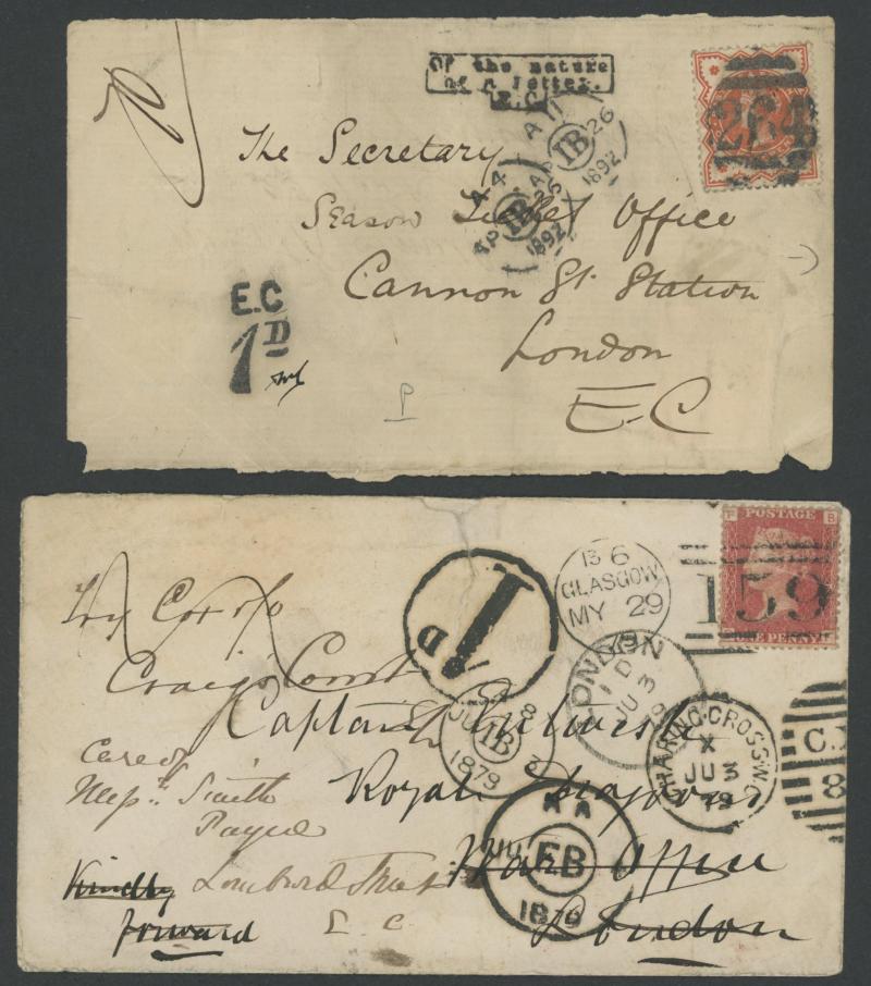 and other markings noted 'TOO LATE/LONDON' 1864 duplex, Ballisodare, Ireland very fine Numeral '458' with fine backstamp, Dublin 'POSTED SINCE 5PM/TnRECr/LAST NIGHT' backstamps on three 1856-57 envelopes, 'DUDLEY - 263' sideways duplex, Edinburgh