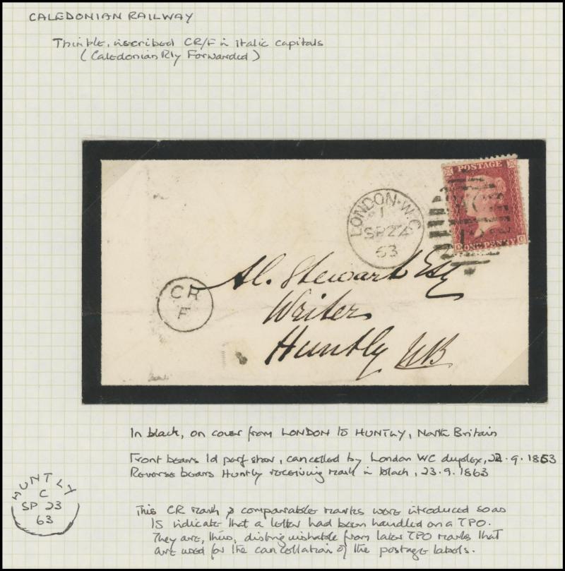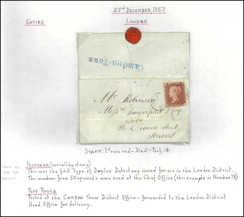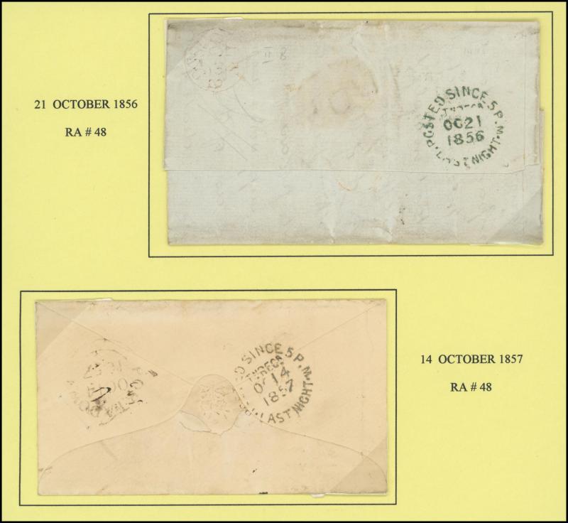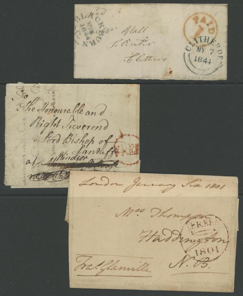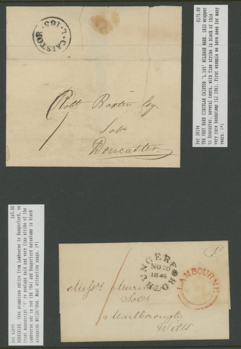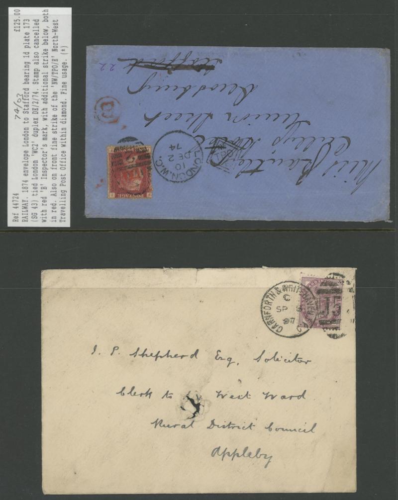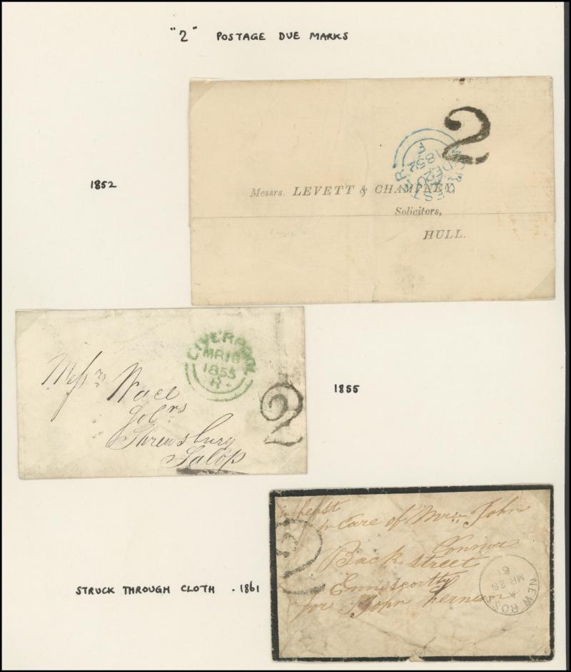 and other markings noted 'TOO LATE/LONDON' 1864 duplex, Ballisodare, Ireland very fine Numeral '458' with fine backstamp, Dublin 'POSTED SINCE 5PM/TnRECr/LAST NIGHT' backstamps on three 1856-57 envelopes, 'DUDLEY - 263' sideways duplex, Edinburgh