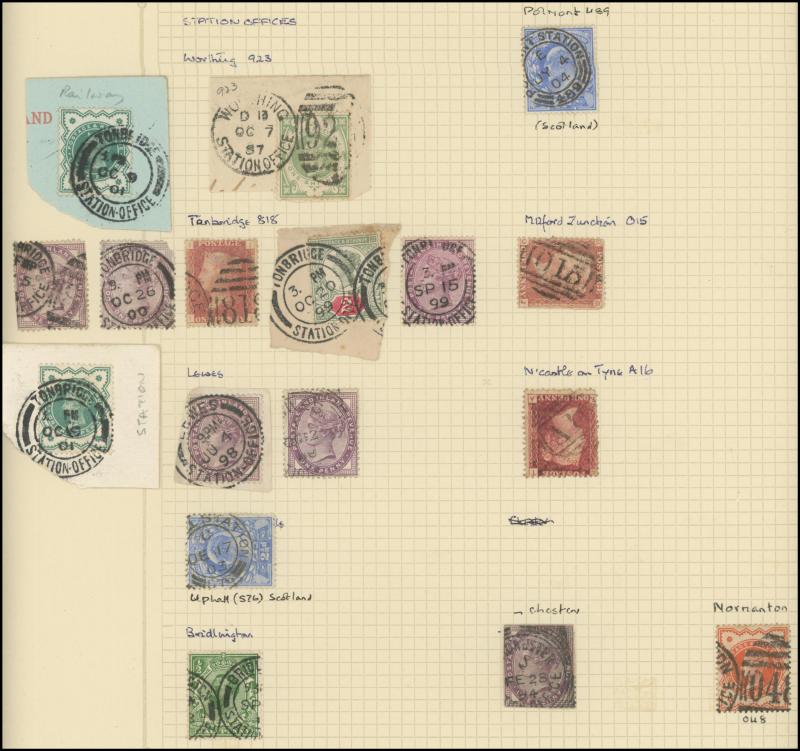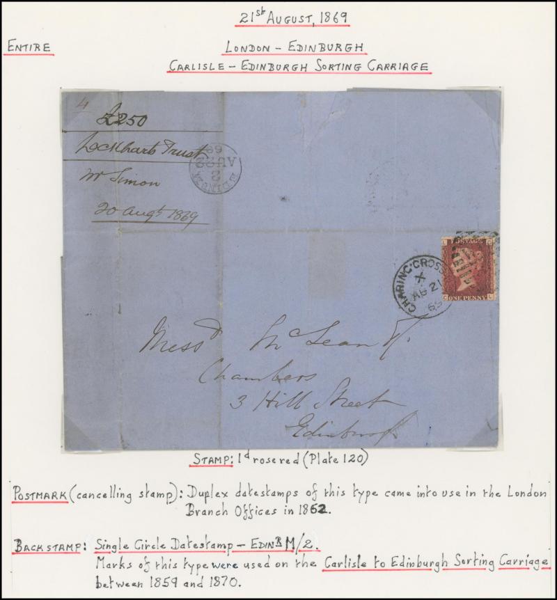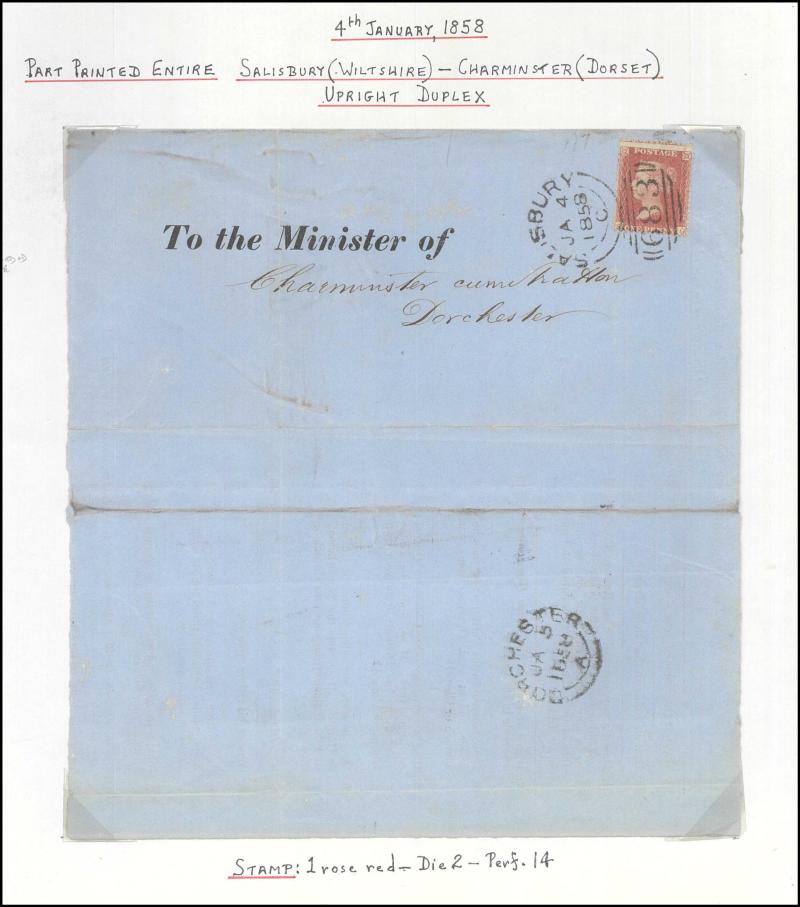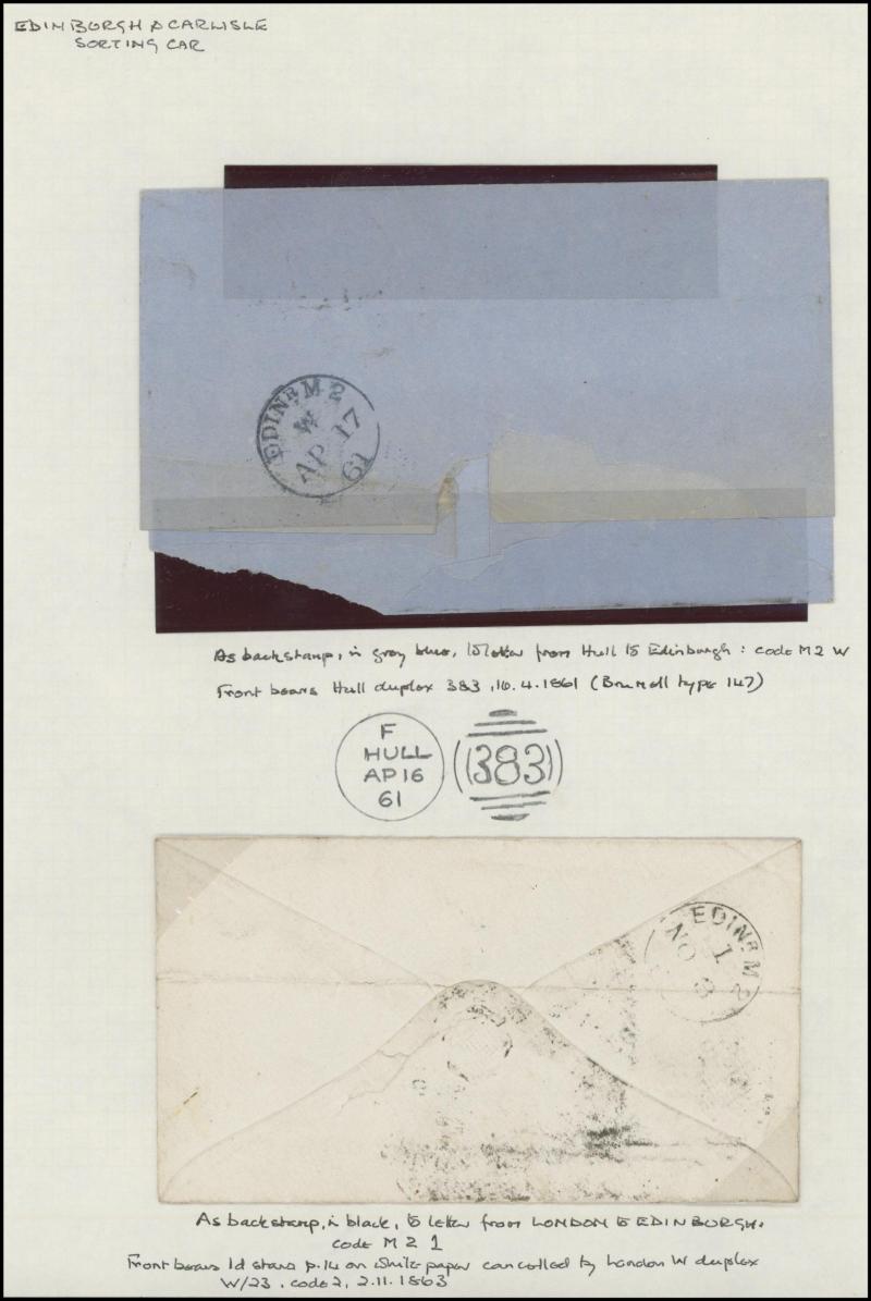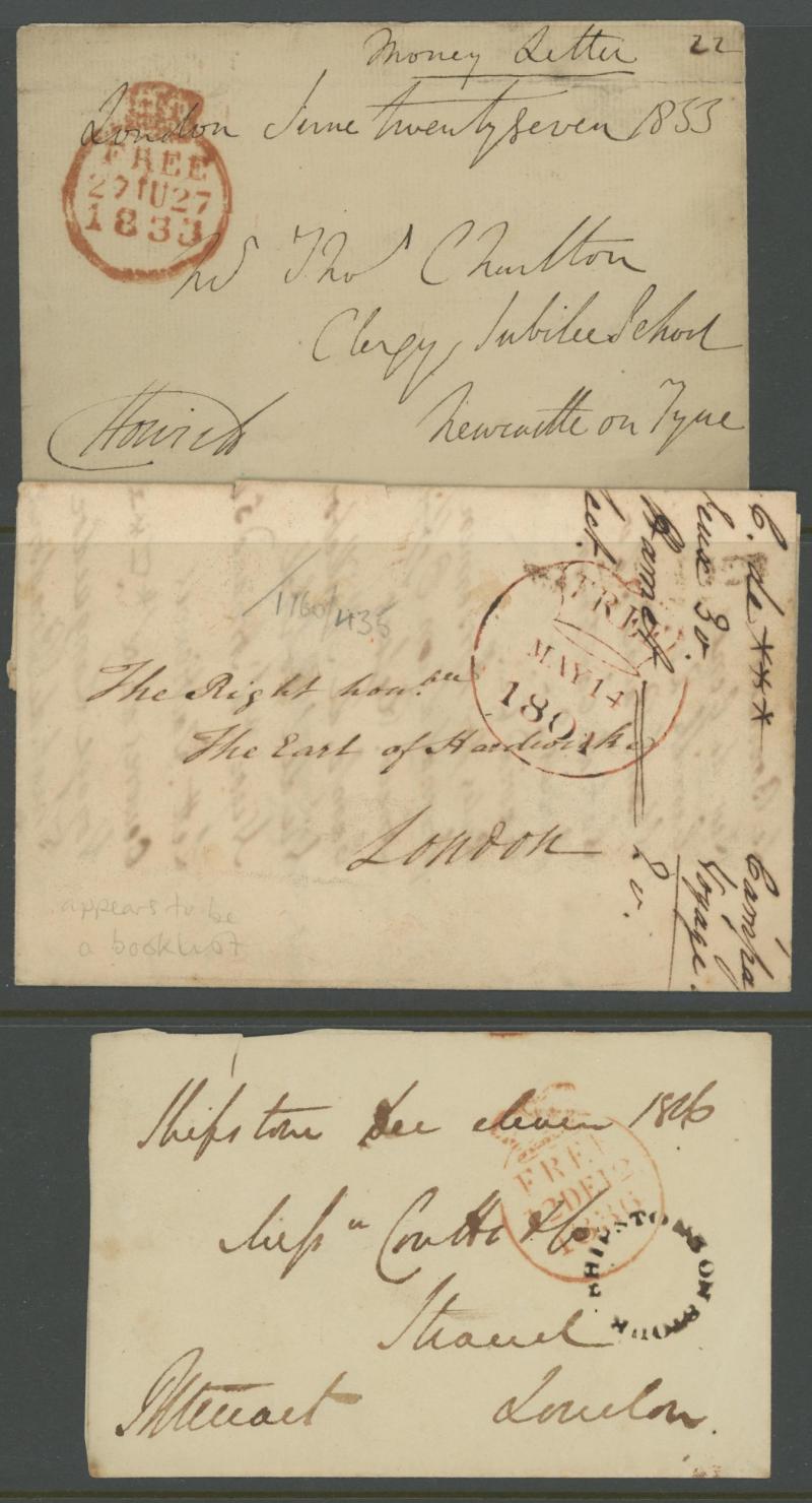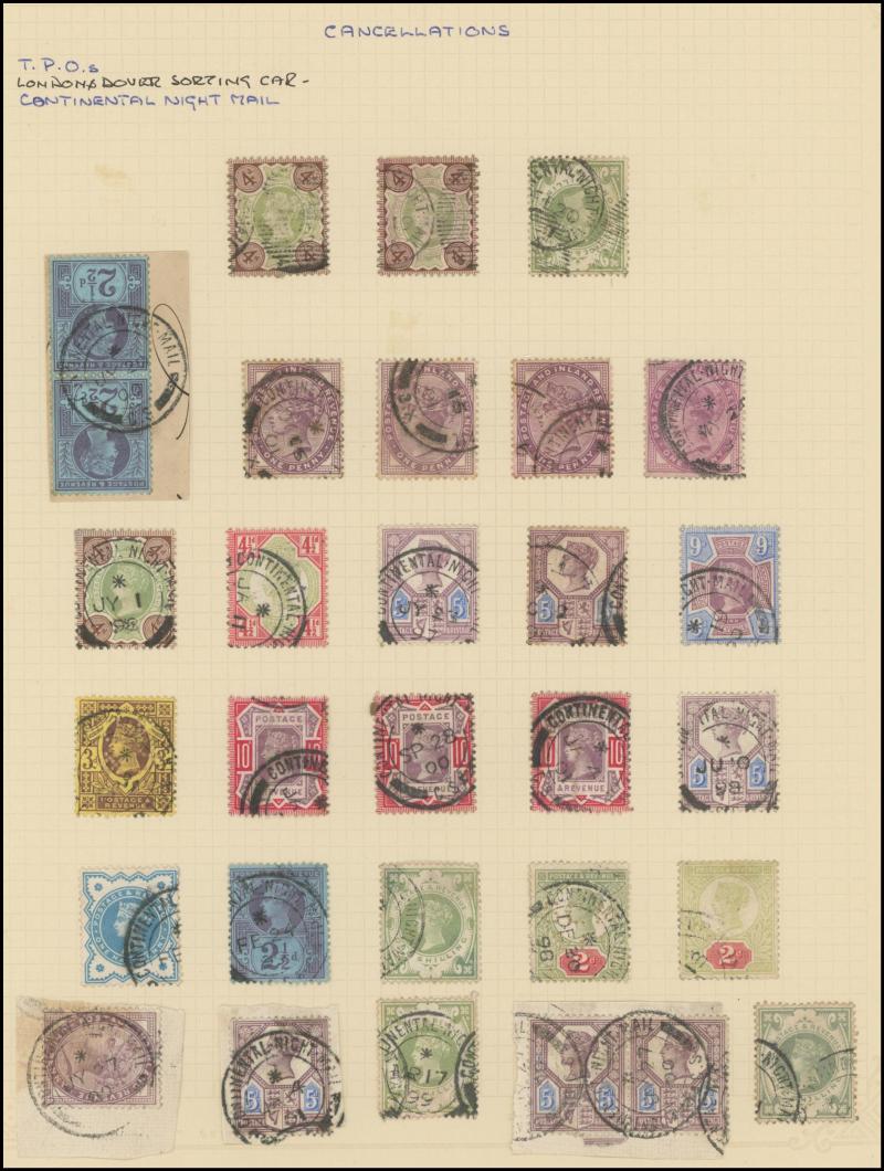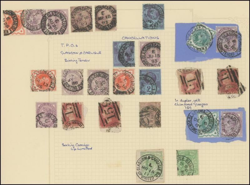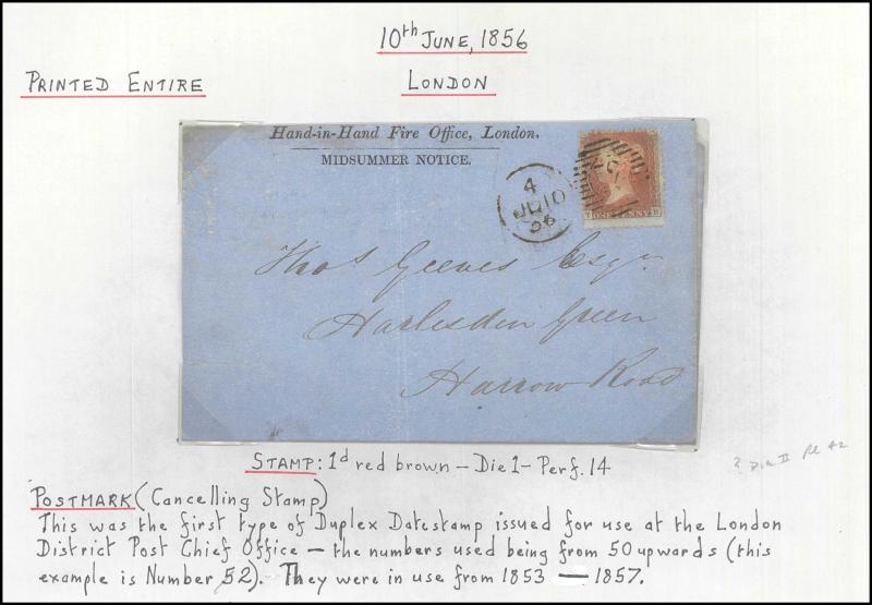 and other markings noted 'TOO LATE/LONDON' 1864 duplex, Ballisodare, Ireland very fine Numeral '458' with fine backstamp, Dublin 'POSTED SINCE 5PM/TnRECr/LAST NIGHT' backstamps on three 1856-57 envelopes, 'DUDLEY - 263' sideways duplex, Edinburgh