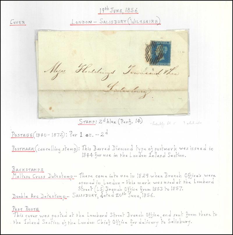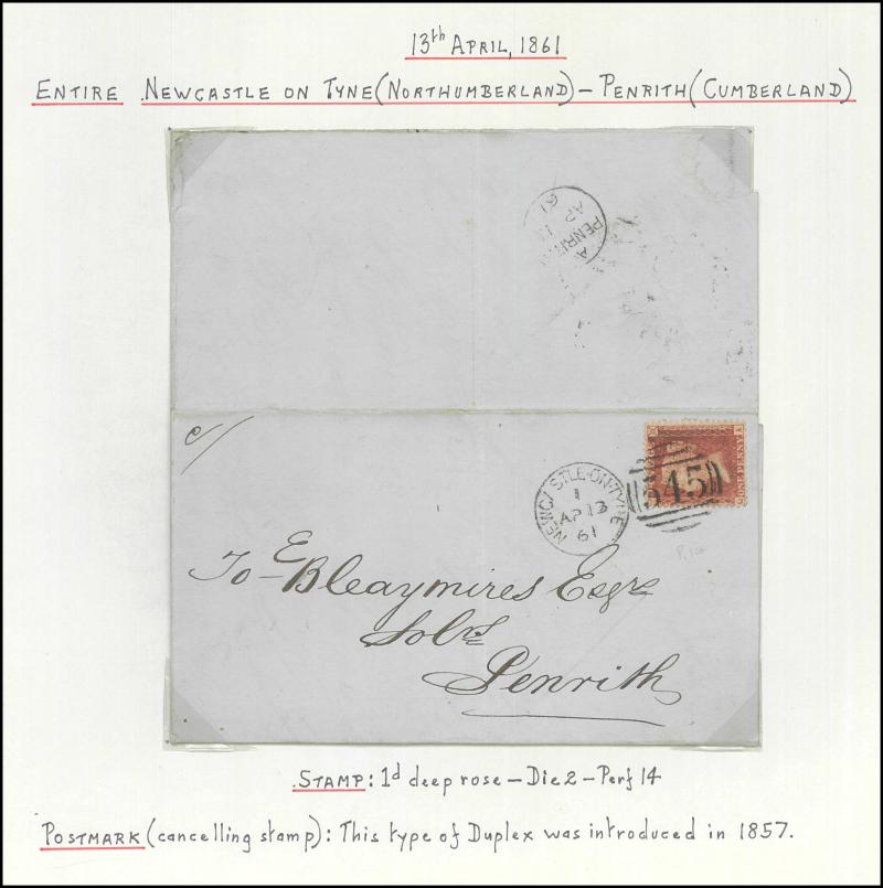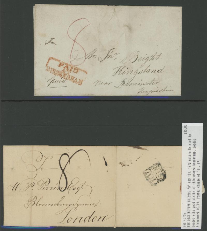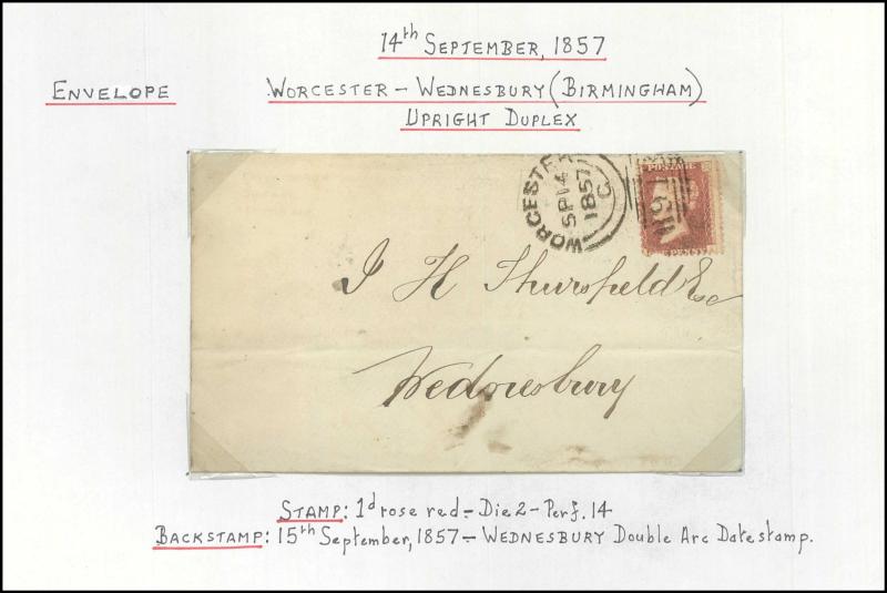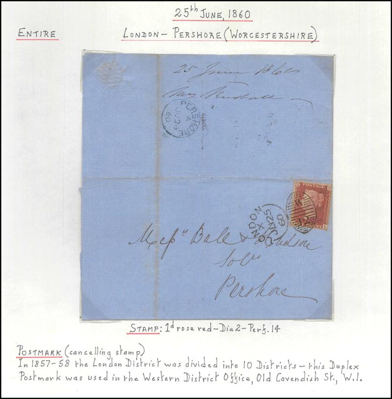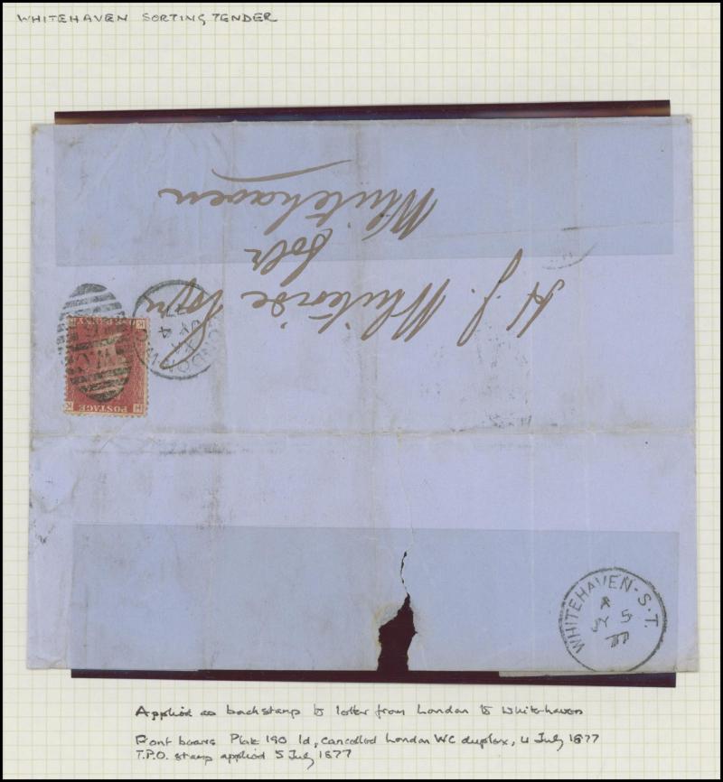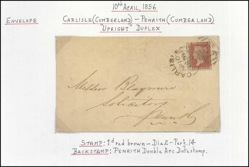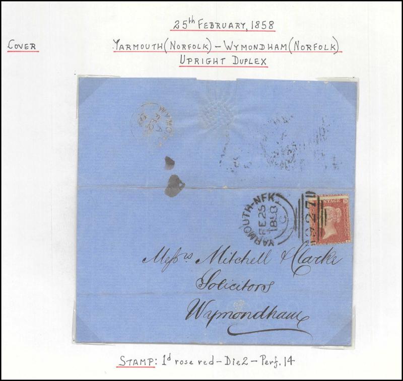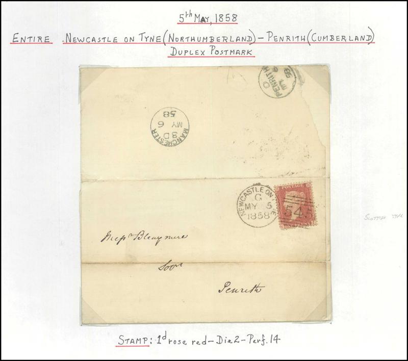 and other markings noted 'TOO LATE/LONDON' 1864 duplex, Ballisodare, Ireland very fine Numeral '458' with fine backstamp, Dublin 'POSTED SINCE 5PM/TnRECr/LAST NIGHT' backstamps on three 1856-57 envelopes, 'DUDLEY - 263' sideways duplex, Edinburgh
