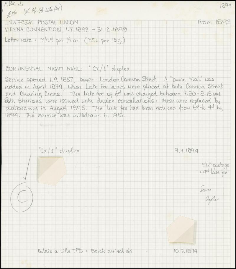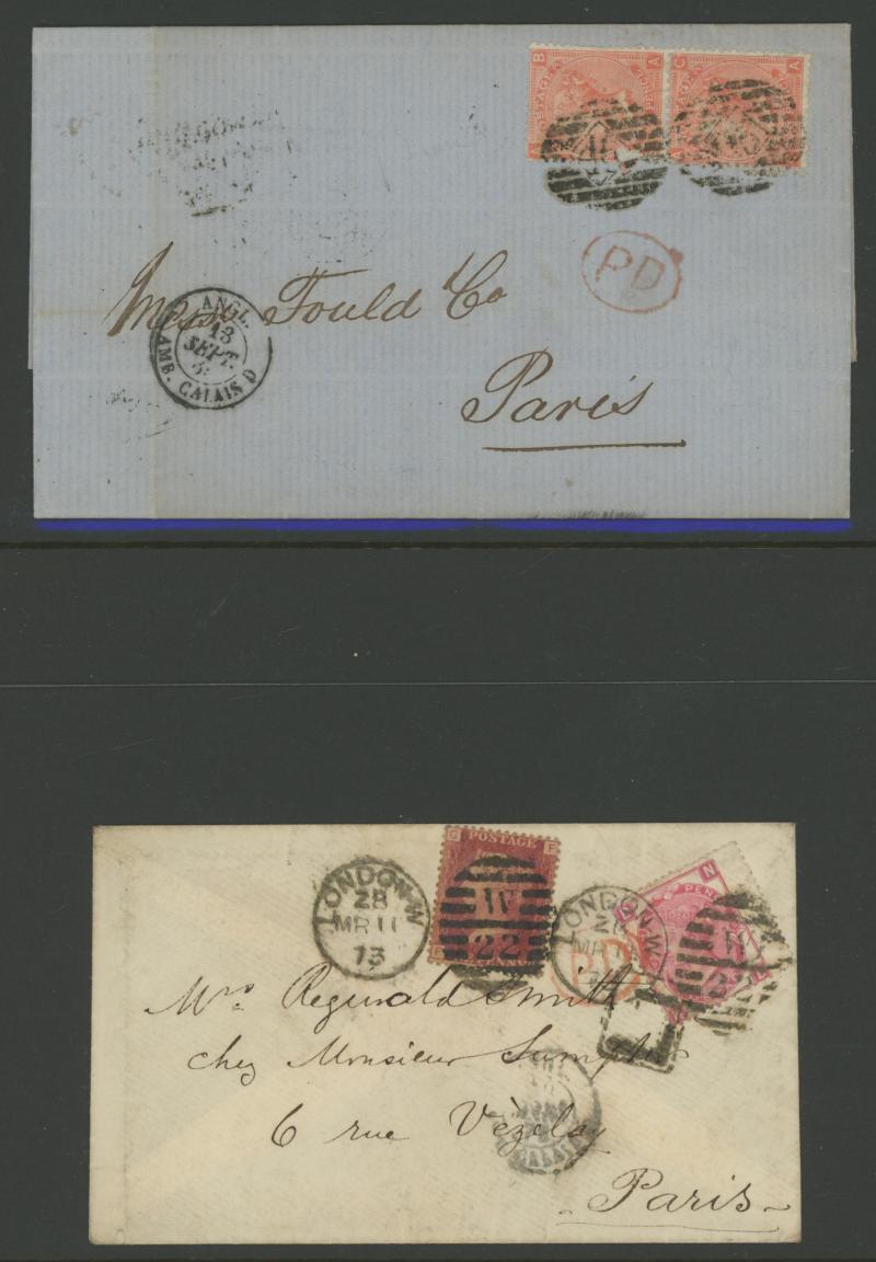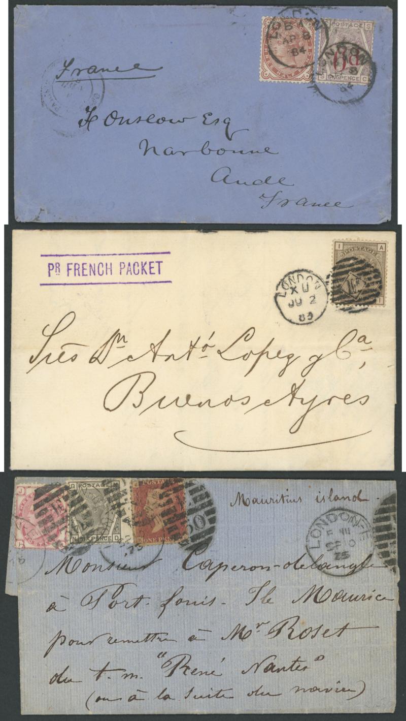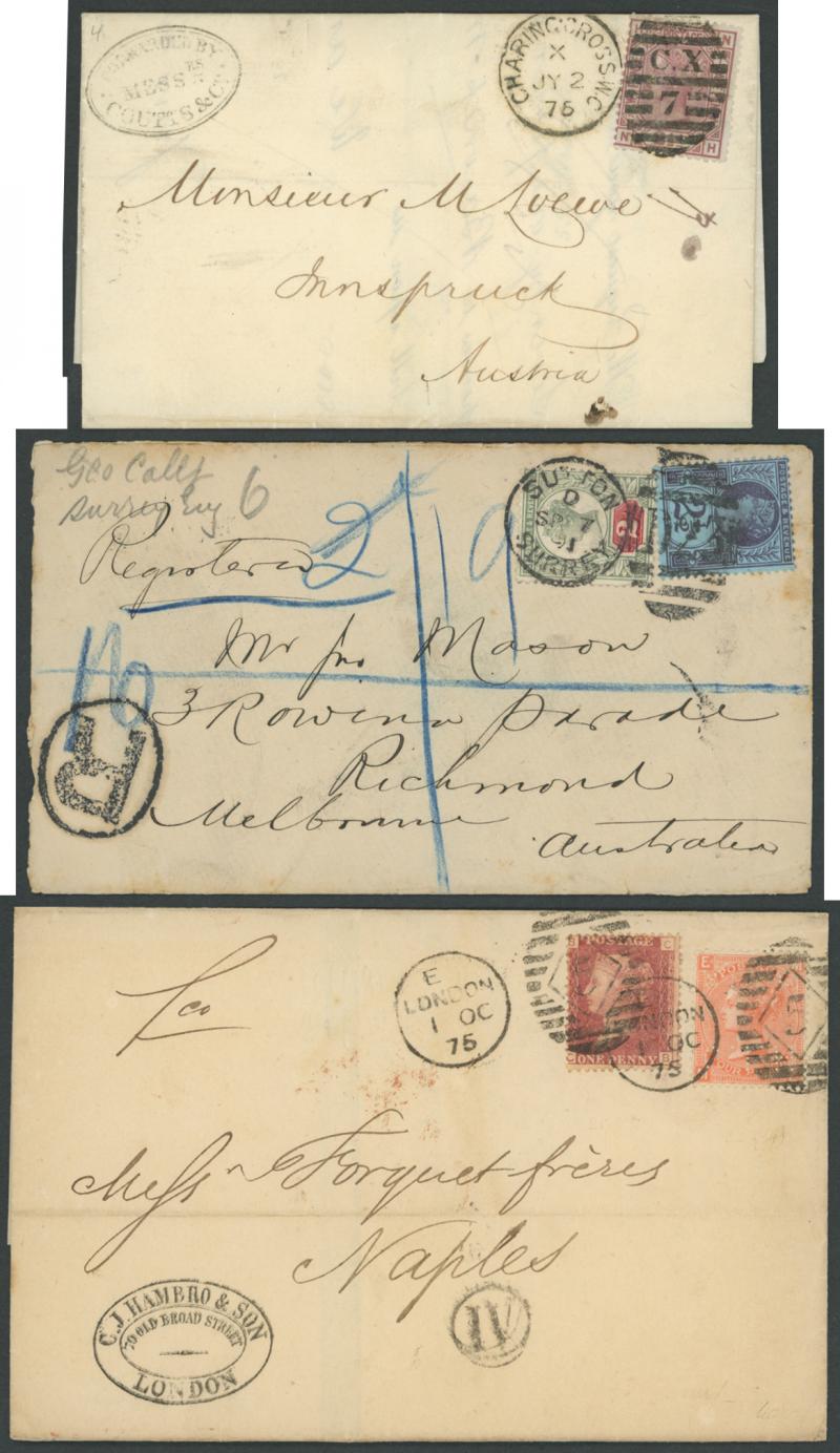 rose for the post-UPU interim 3d rate, 1875 to USA single with Letters 1d & Large Coloured Corner Letters 6d grey, 1878 to Paris with Plate 14 pair for the late fee plus Large Coloured Corner Letters 2½d rose tied Charing Cross duplex cancels and