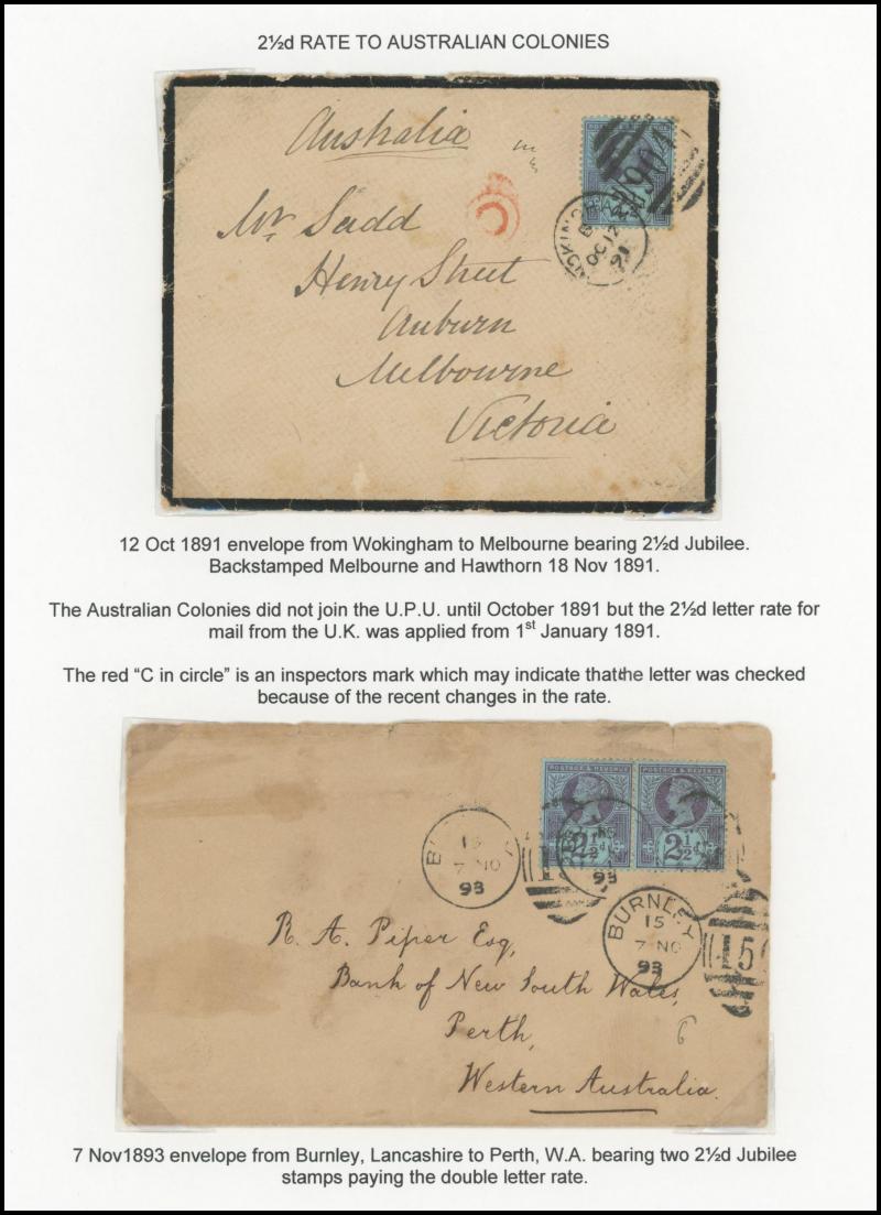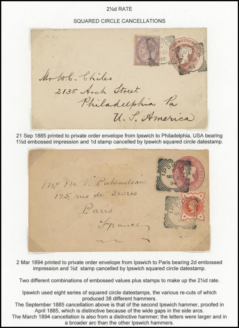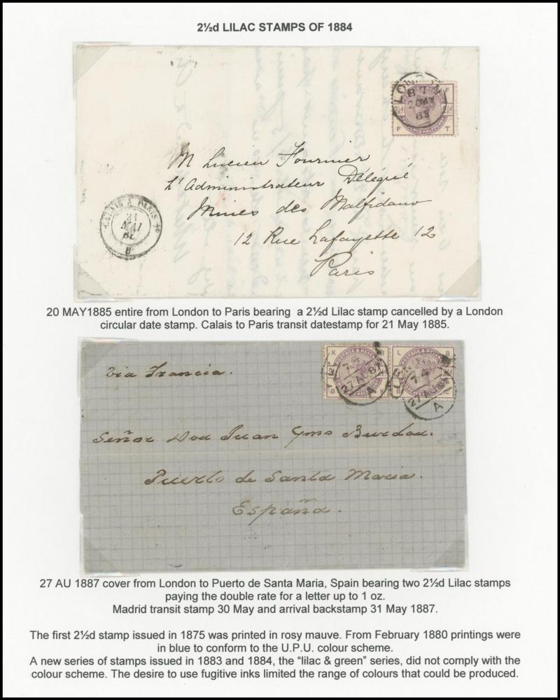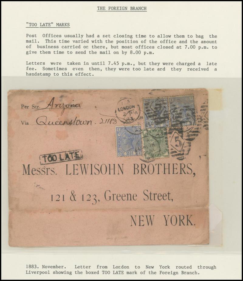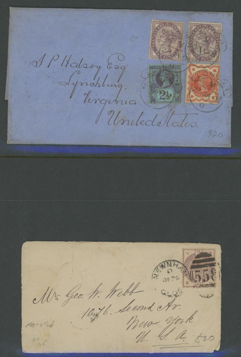 2d rose (SG 168; Cat £300 on cover) to France, 1881 5d indigo (SG 169; Cat £325 on cover to USA paying double UPU letter rate, 1883 ½d green plus 2½d blue x3 to USA with 'TOO LATE' boxed handstamp, 1884 ½d slate with 1d lilacs pair to USA taxed with