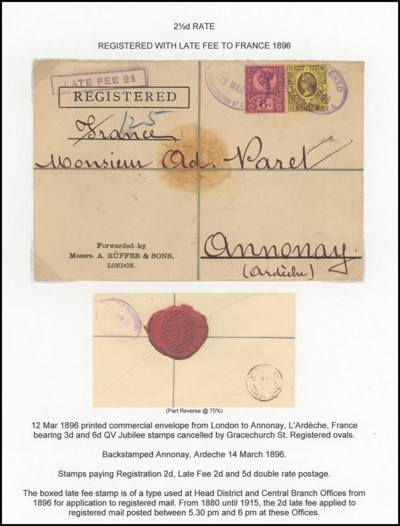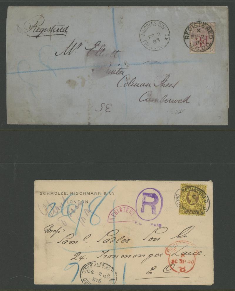 2d registration fee, 1879 to Austria with Plate 20 single with Large Coloured Corner Letters 3d rose tied ' L 1 /GRACECHURCH ST - G.S./1' hexagonal late fee duplex cancels, 1879 & 1880 registered envelopes to France with ½d plus Large Coloured Corner
