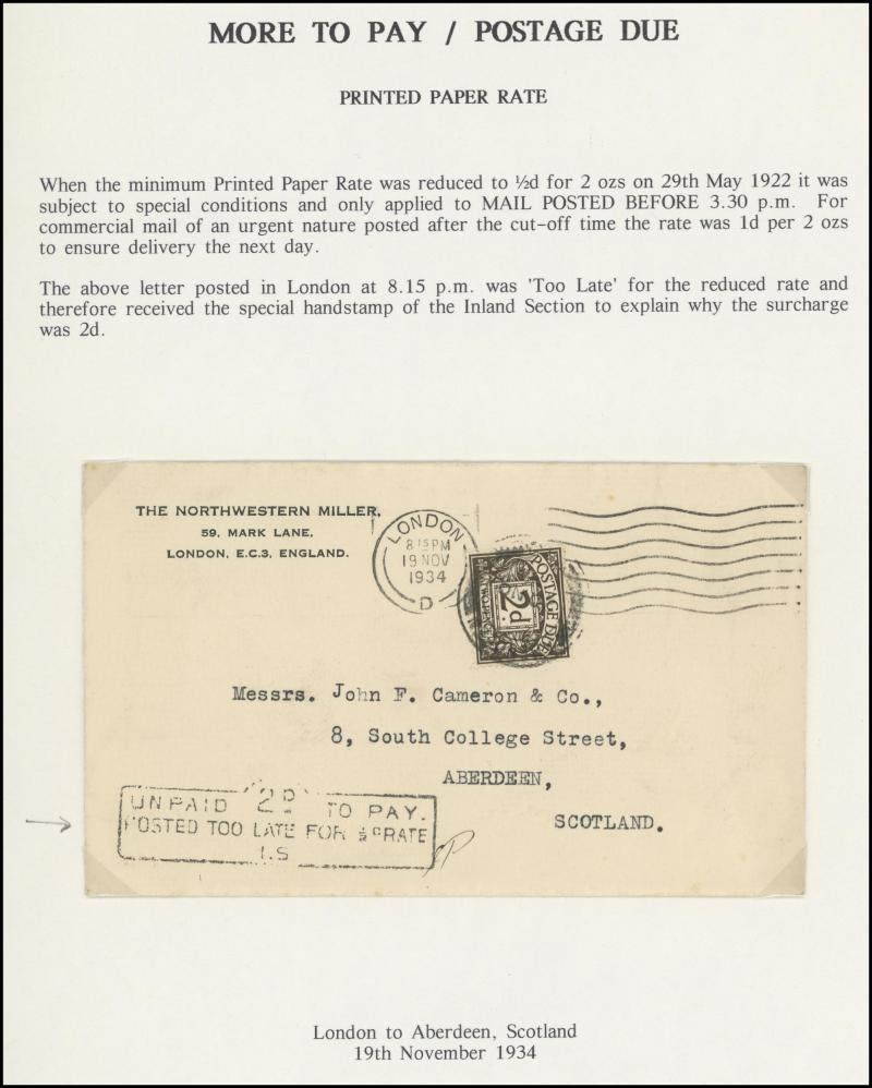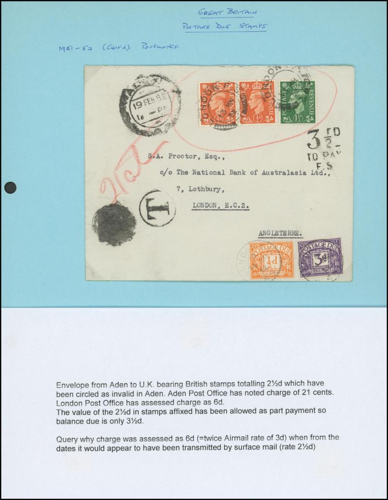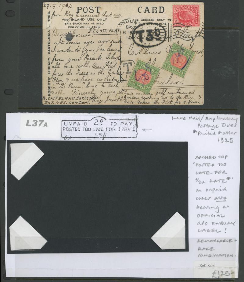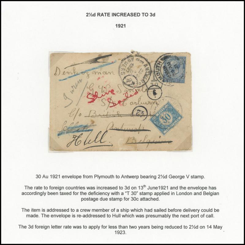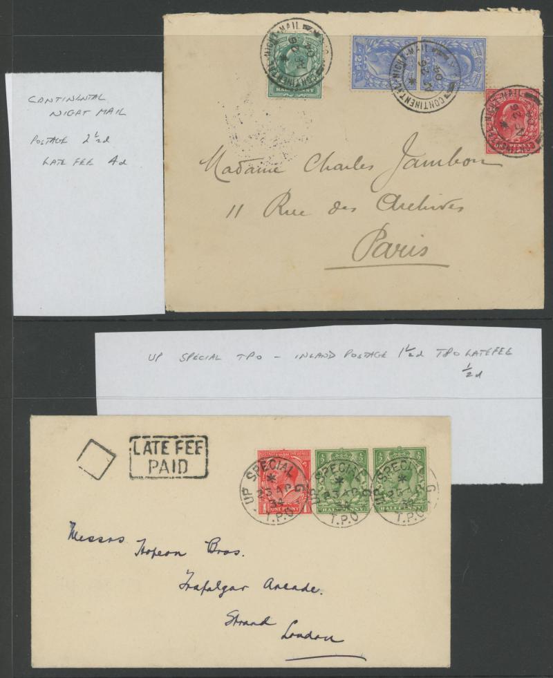 ½d rate with 'POSTED ON BOARD SHIP ABROAD' handstamp, 1925 London to Kent with ' ... POSTED TOO LATE FOR ½D RATE' handstamp and 'Please return the cover for the purposes of an Official Enquiry' label affixed, also inwards mail including Aden (with