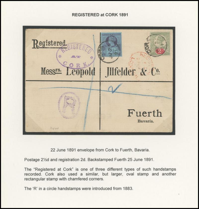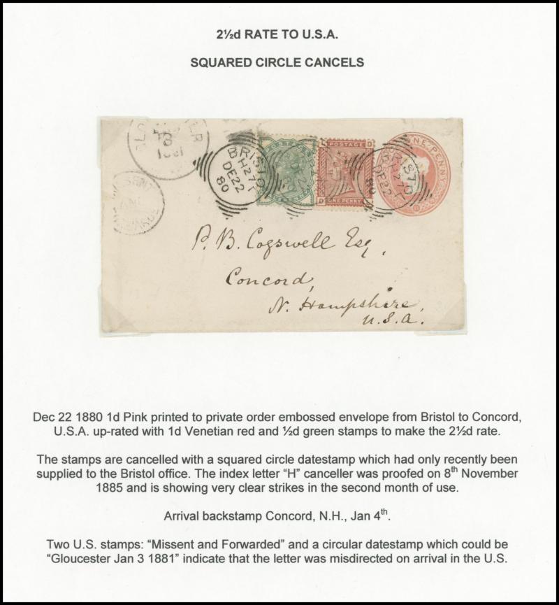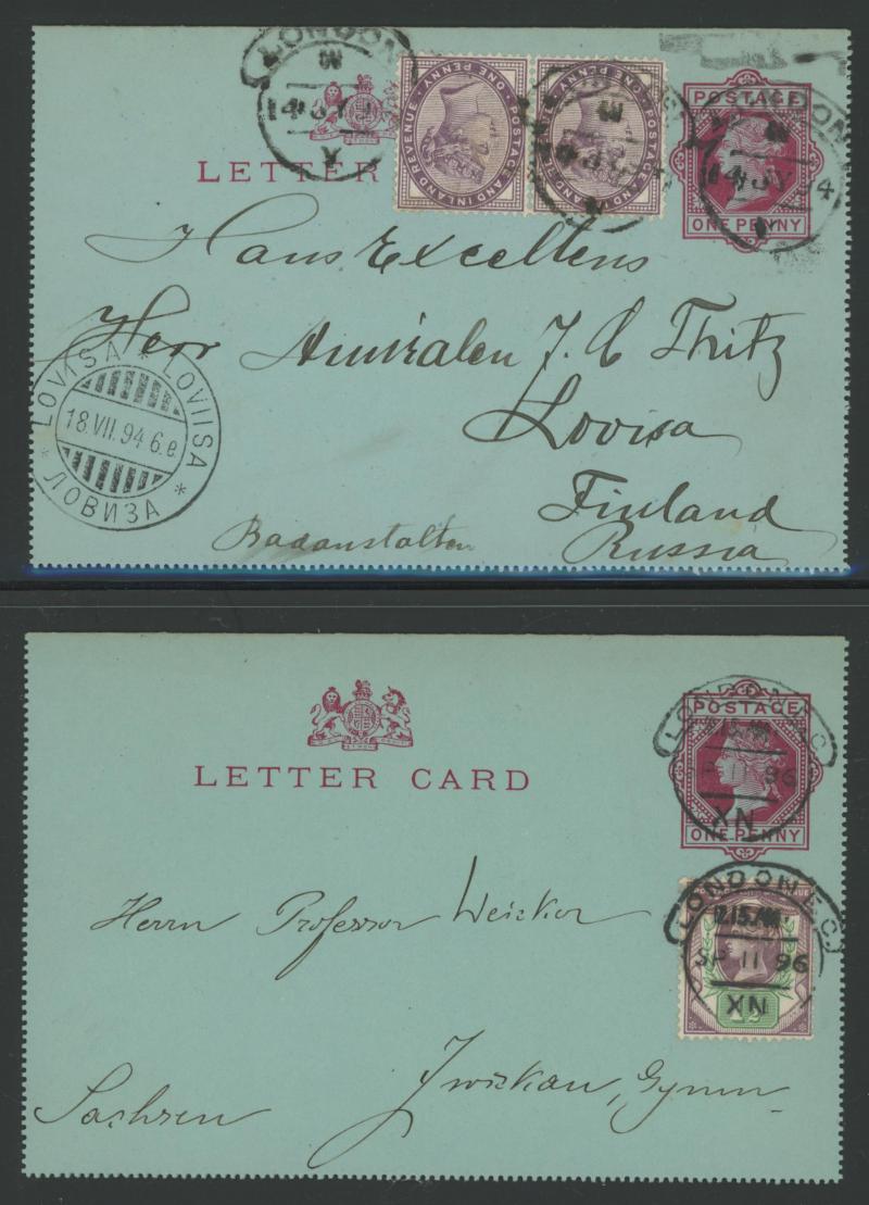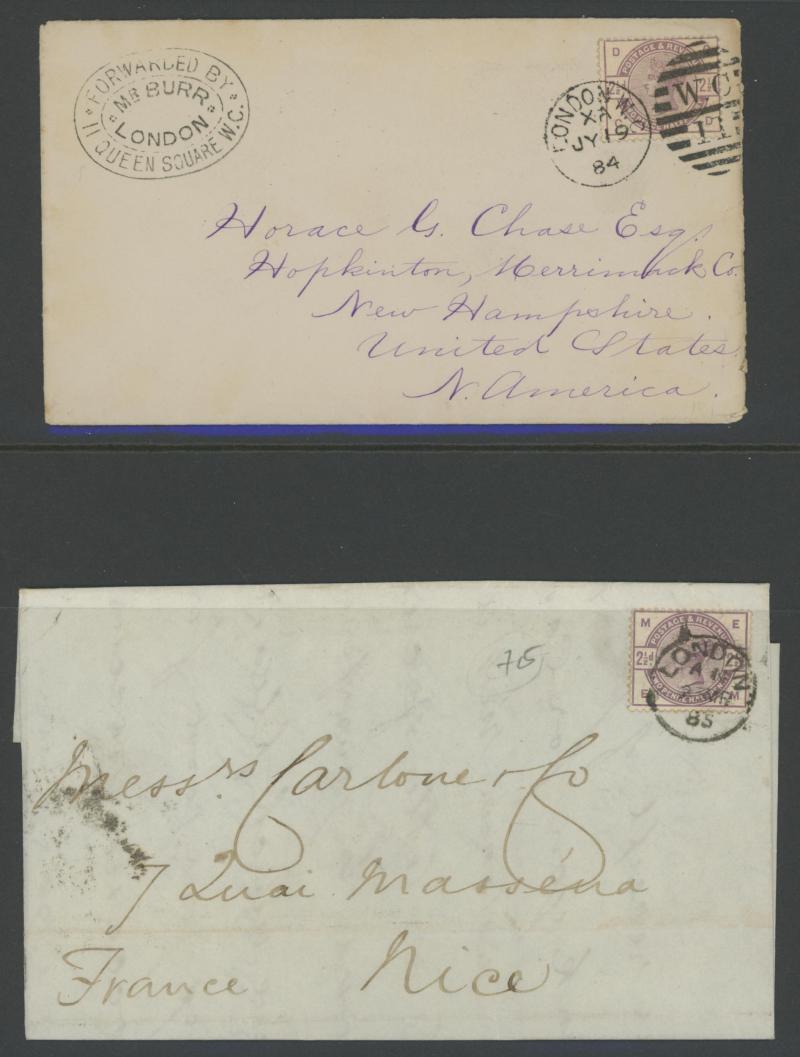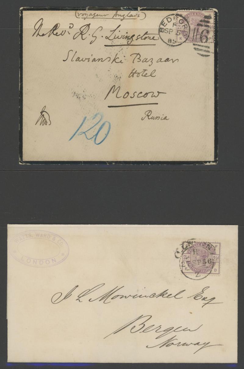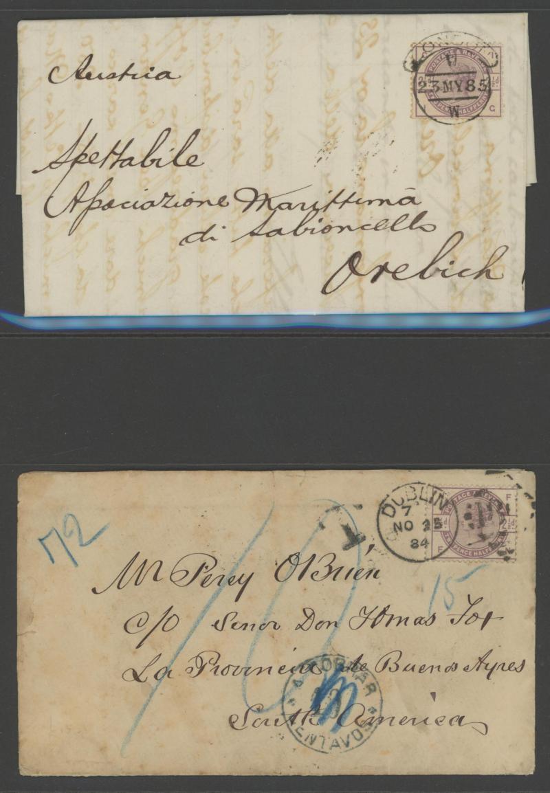 also to Oxford and to Dublin plus uprating Envelope 1d pink to Germany, 2½d lilac solos to Argentina, Austria, France, Germany, Norway, Russia, USA (New Hampshire with 'FORWARDED BY/MR. BURR' cachet) plus pair to Canada tied Ireland 'CORK'