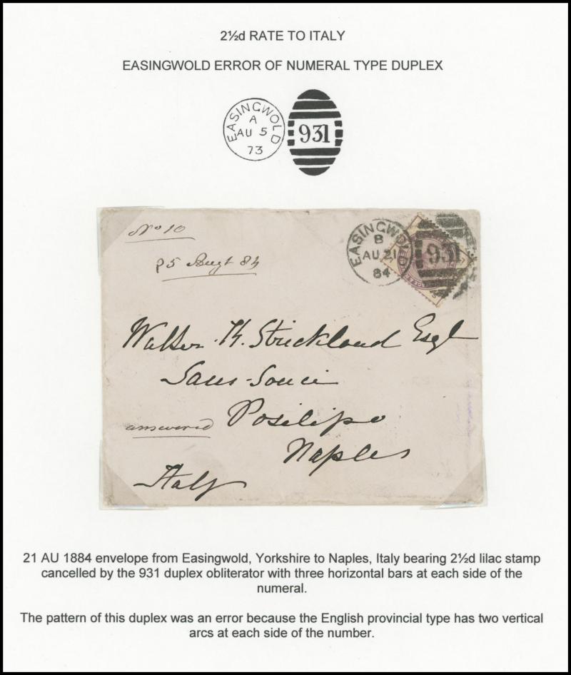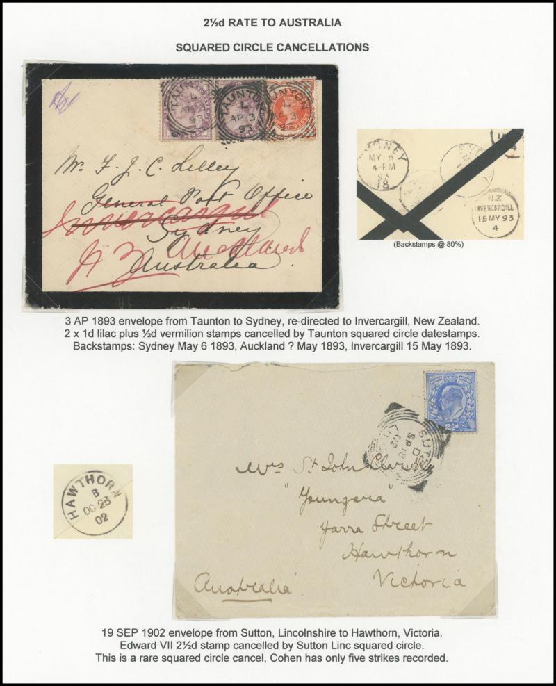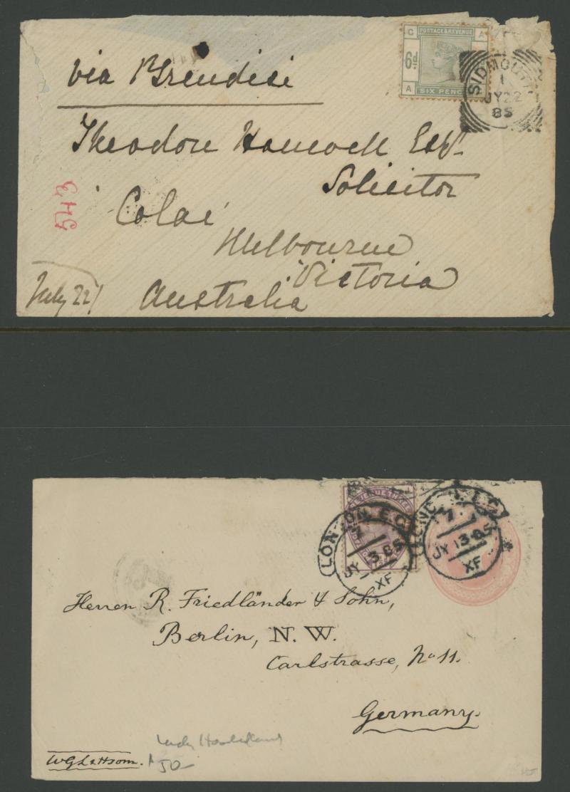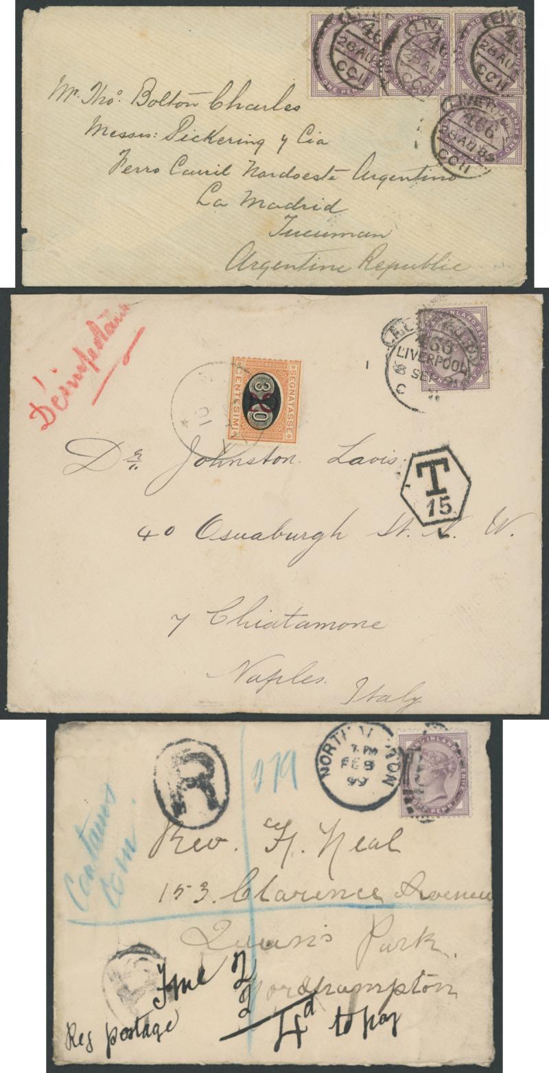 cancel and London experimental datestamps plus 1899 endorsed "Contains Coin" and compulsorily registered, then foreign destinations including 1882 to Australia with 1d x6 for pre-UPU ship letter rate, 1882 solo to Italy taxed with Postage Due '2' on