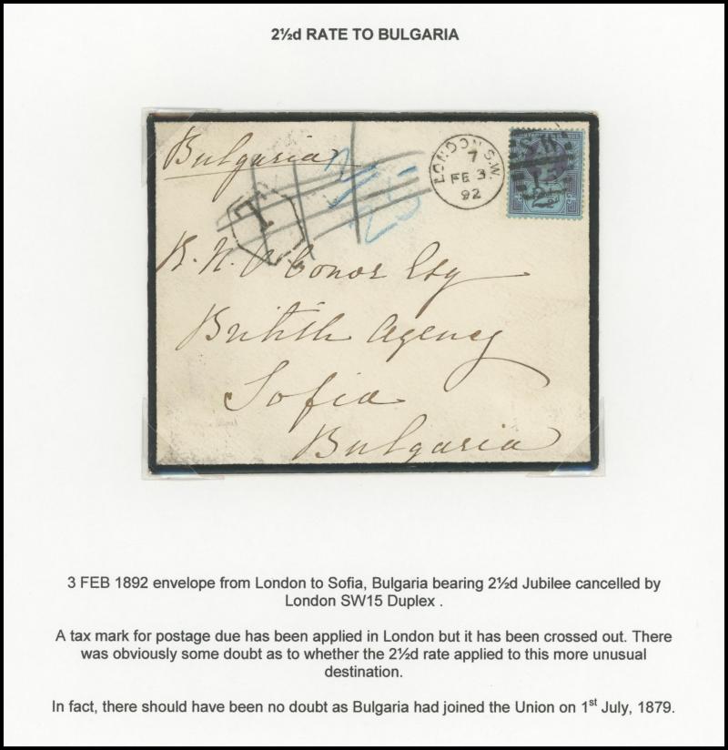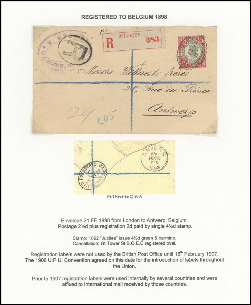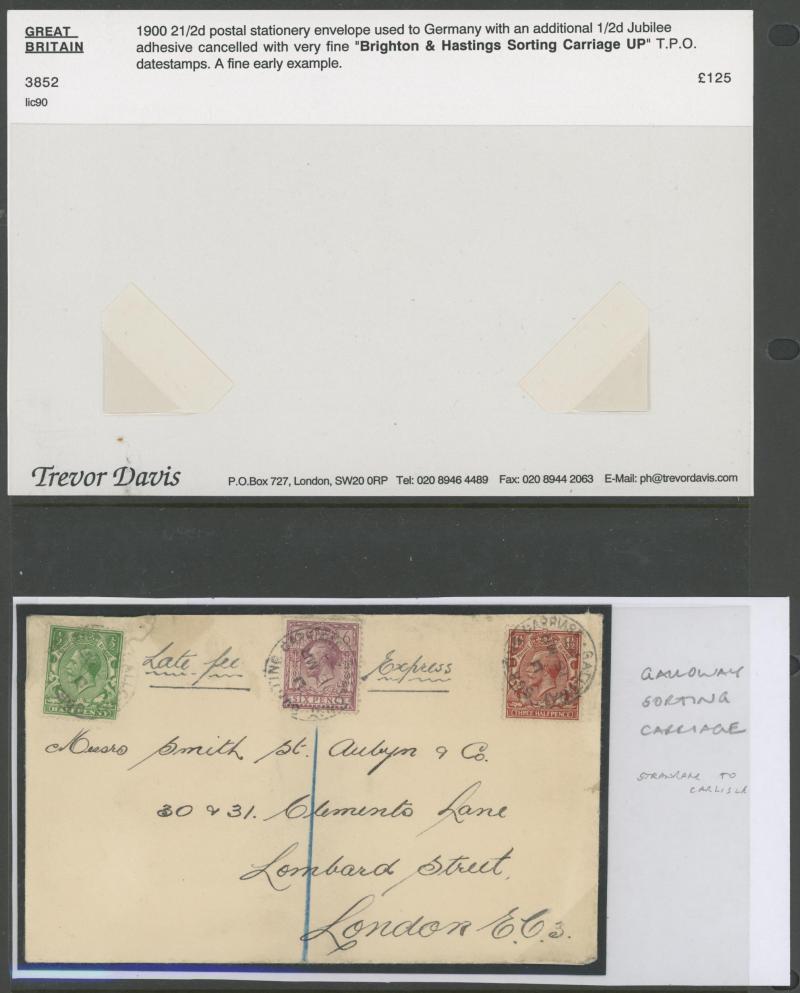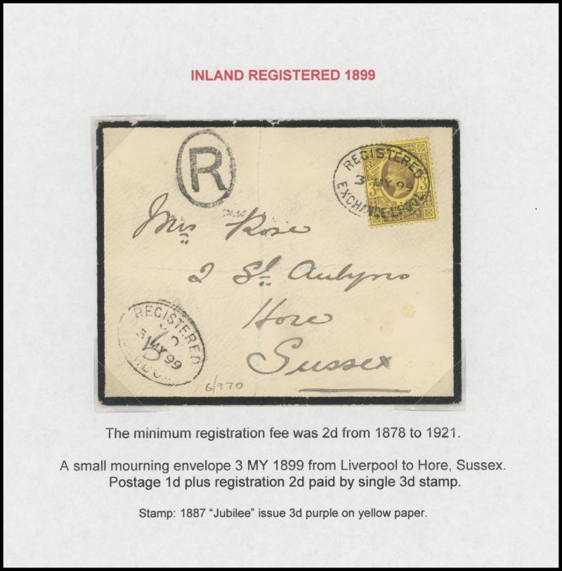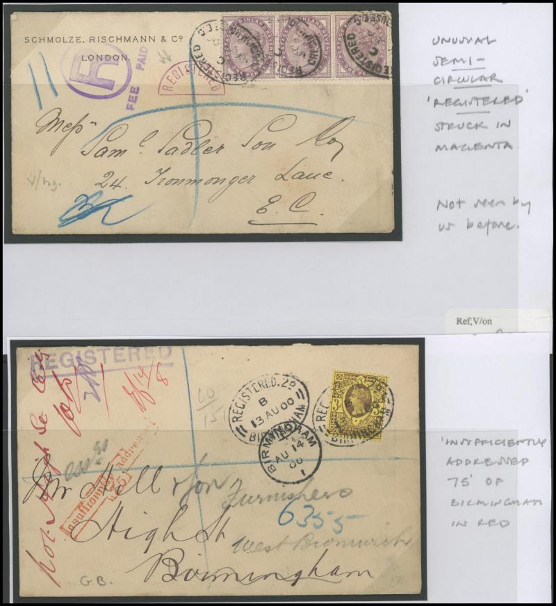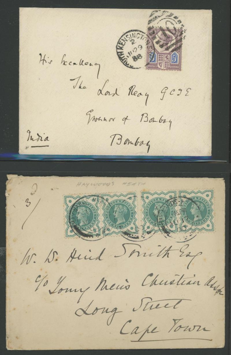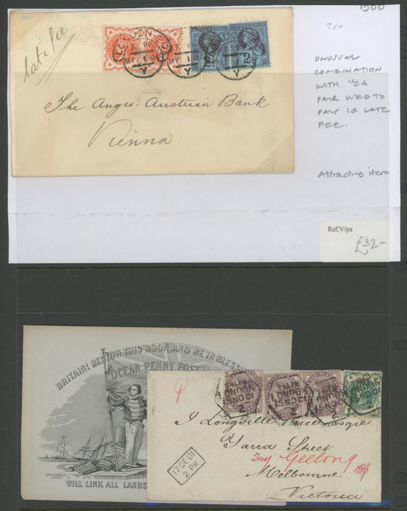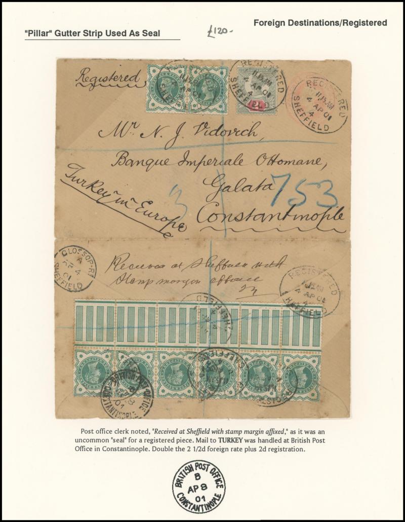 registration fee, 1898 to Wallington with 'R/Fee Paid' label and multiple redirections, 1901 Envelope QV 1d pink to Constantinople with Jubilee ½d green marginal strip of 6 with 'Pillar' gutter on the reverse plus pair on the face and 2d green & red,