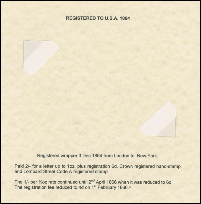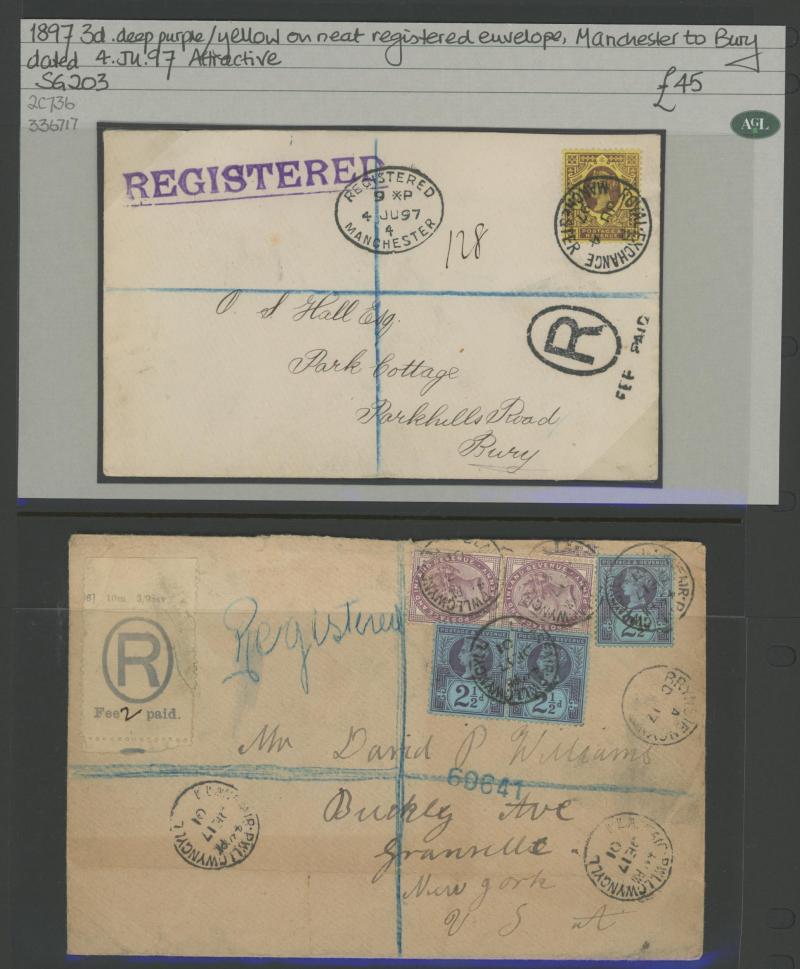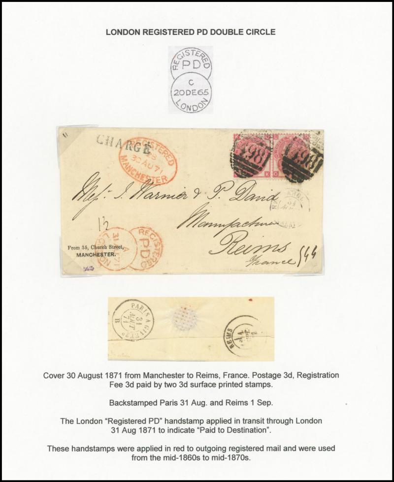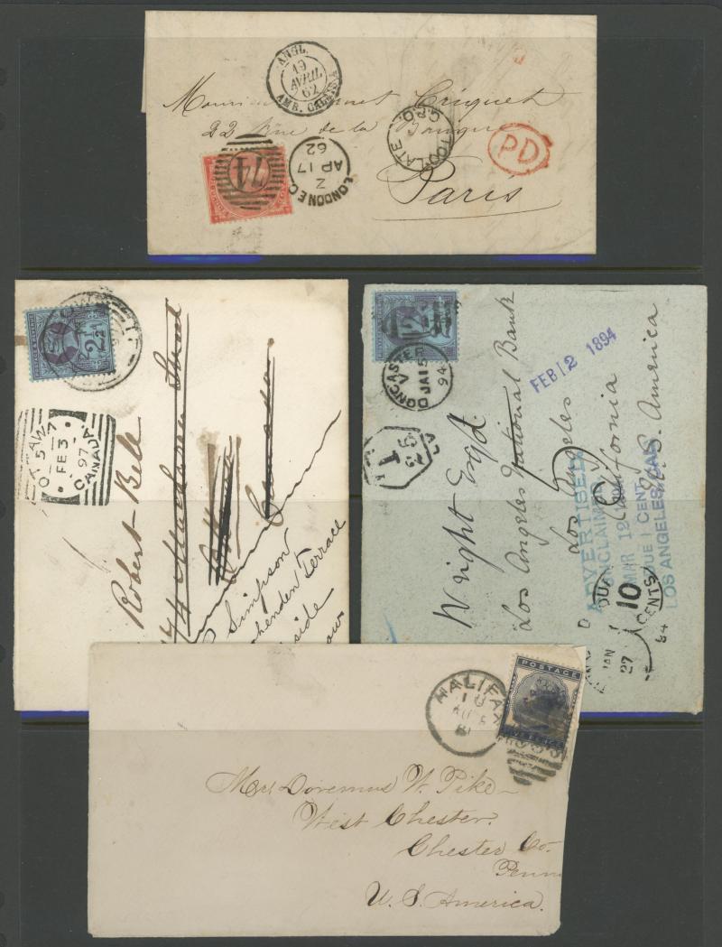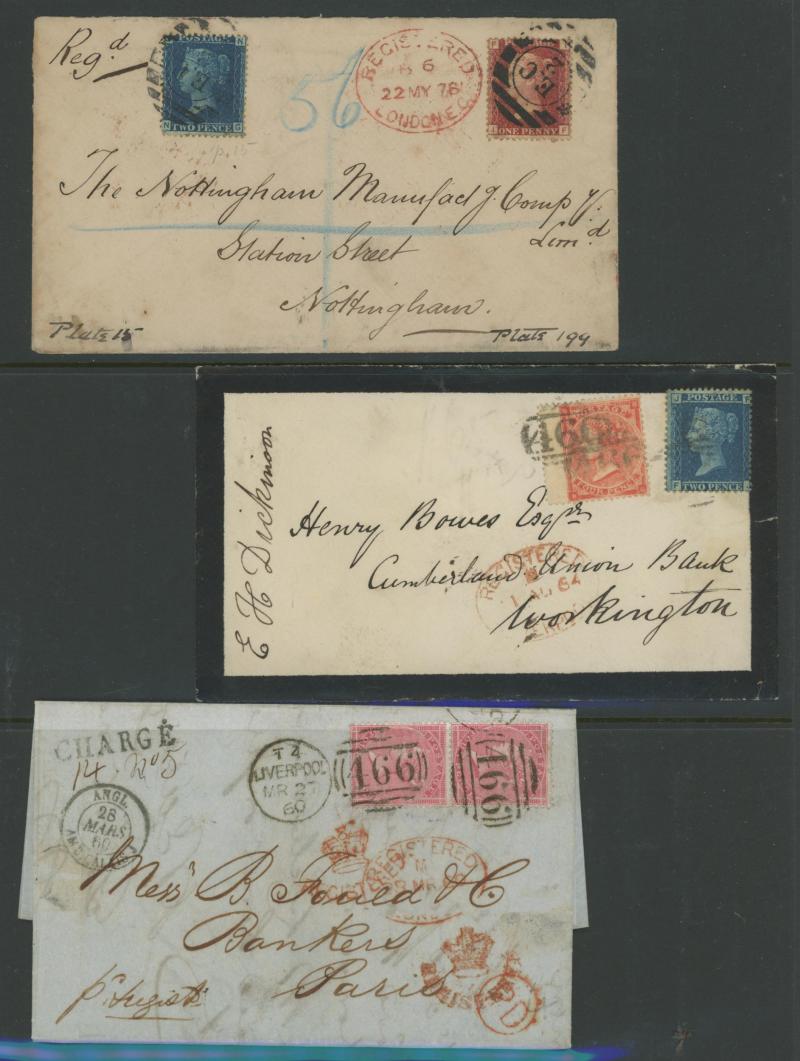 LETTER' handstamps on entires x3 with codes 'A', 'B' & 'D' respectively plus 1864 on outer to USA with No Corner Letters 6d lilac & 1/- green pair, 1871 Manchester to France with 3d rose pair and London 'REGISTERED/PD' combined overlapping-circles