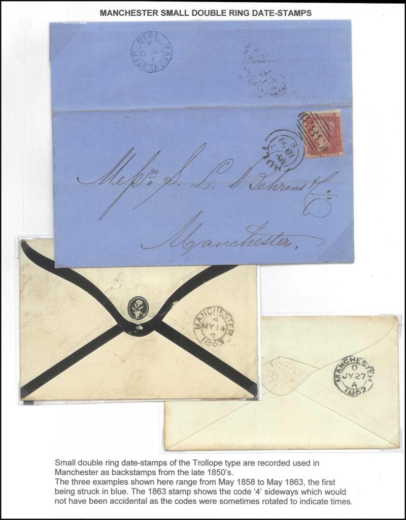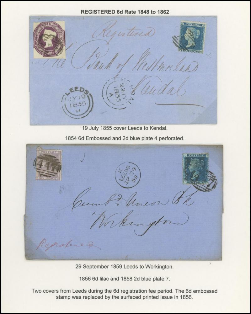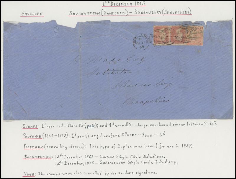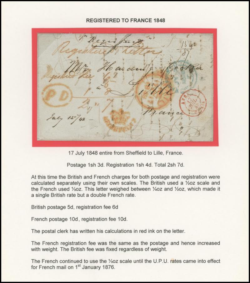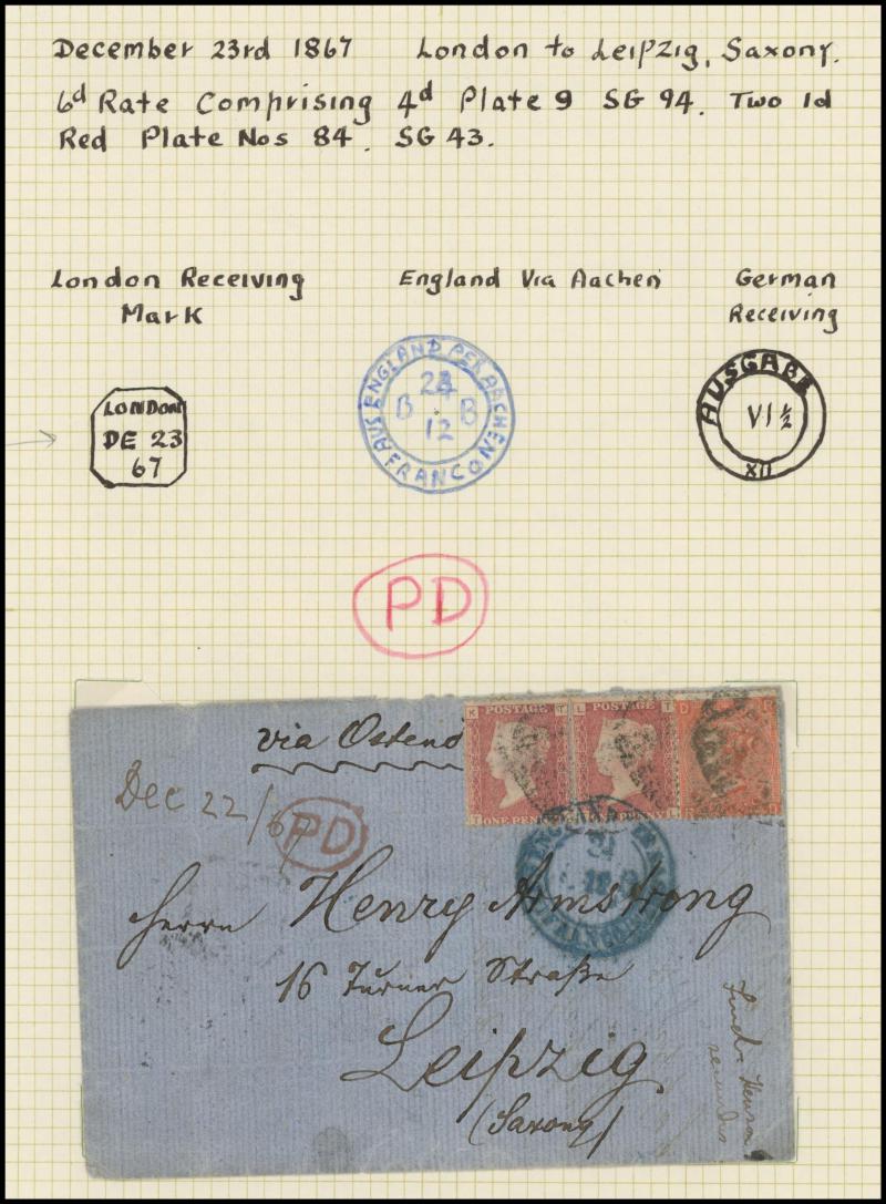 LETTER' handstamps on entires x3 with codes 'A', 'B' & 'D' respectively plus 1864 on outer to USA with No Corner Letters 6d lilac & 1/- green pair, 1871 Manchester to France with 3d rose pair and London 'REGISTERED/PD' combined overlapping-circles