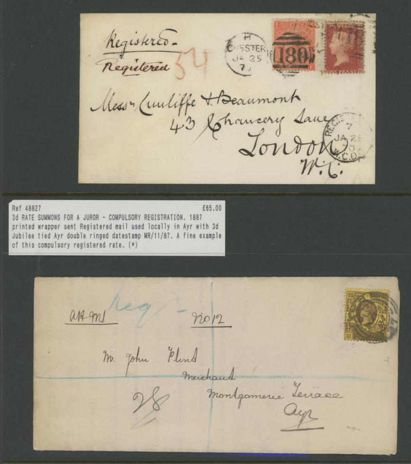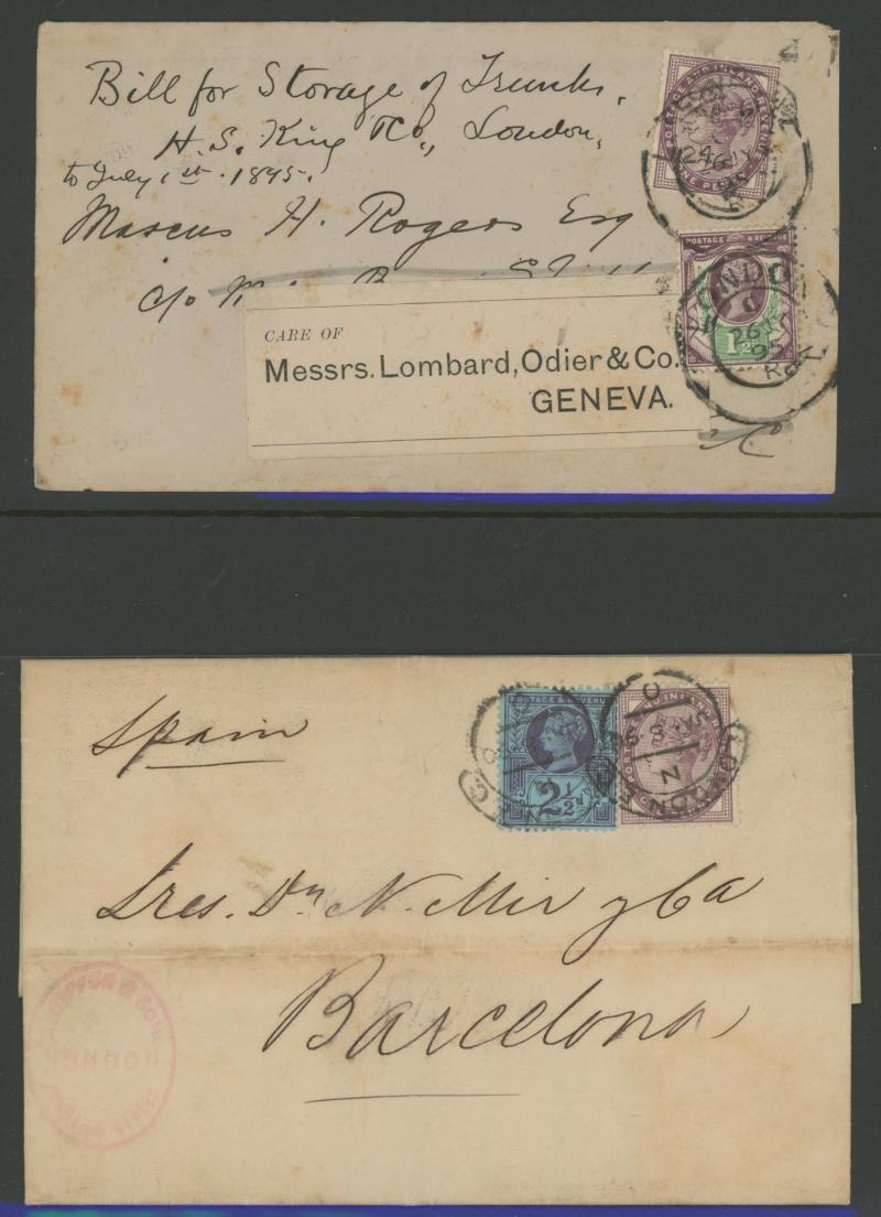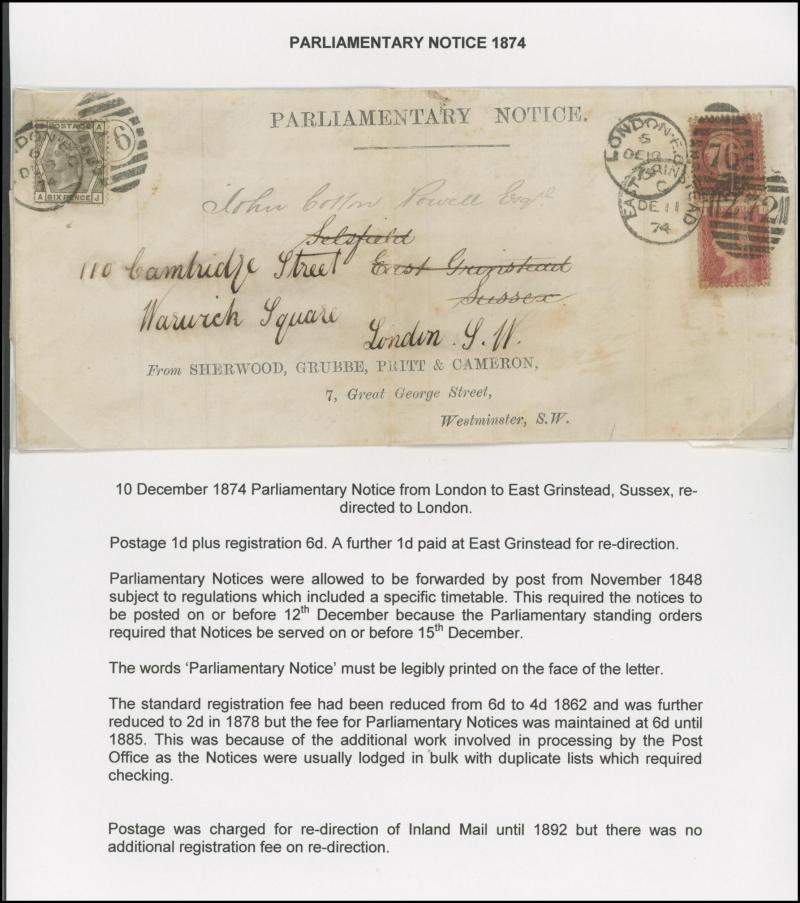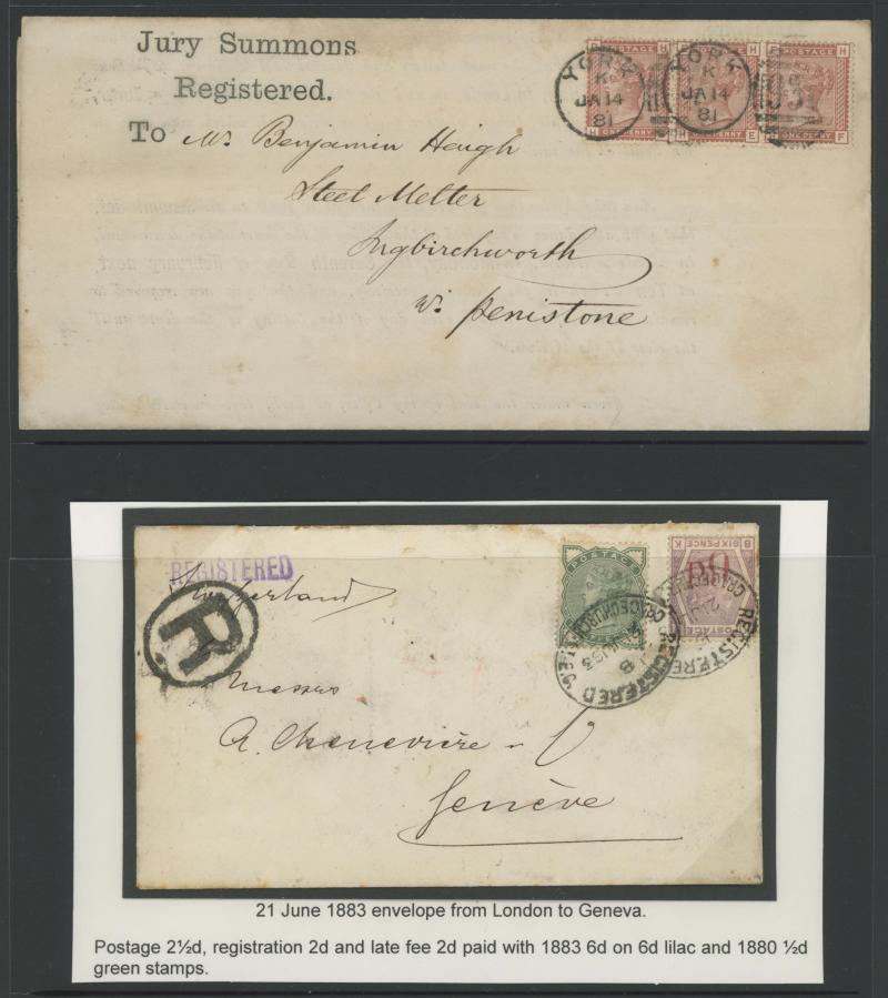 handstamp, 1874 'Parliamentary Notice' to Sussex with Stars 1d, 6d grey for registration fee & another 1d added for redirection, 1883 to Switzerland with ½d dull green & '6d' on 6d lilac (SG 162; Cat £425 on cover) for 2½d UPU letter plus 4d