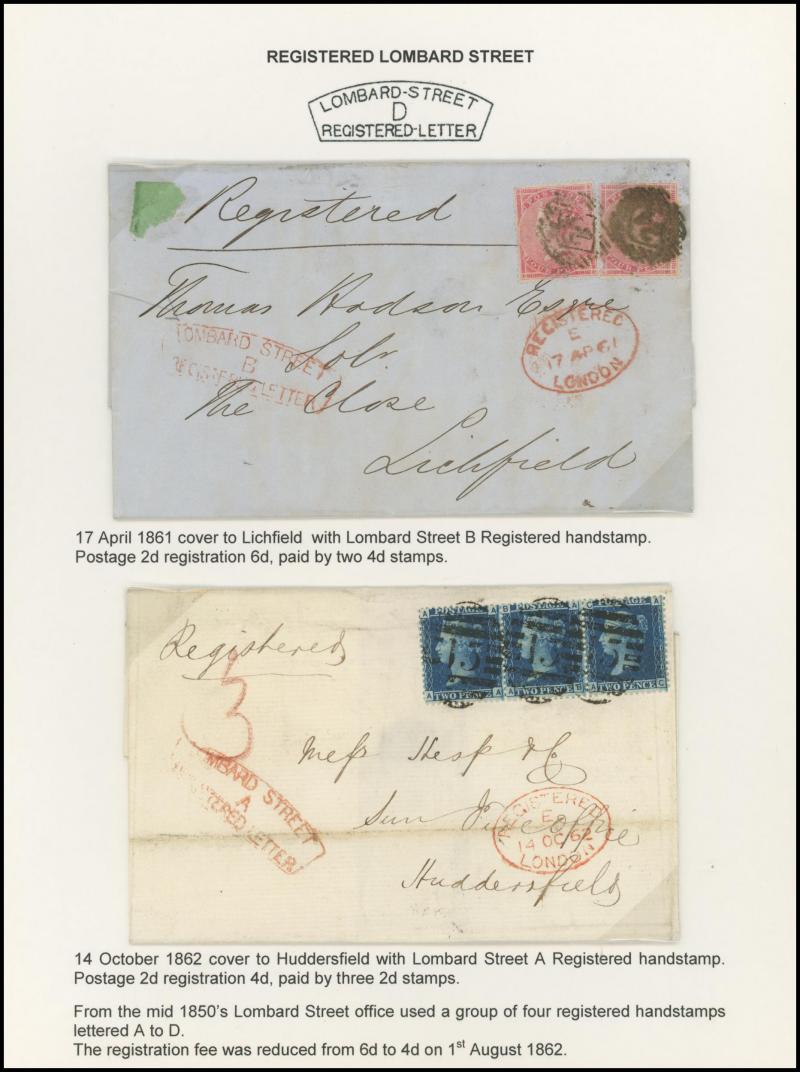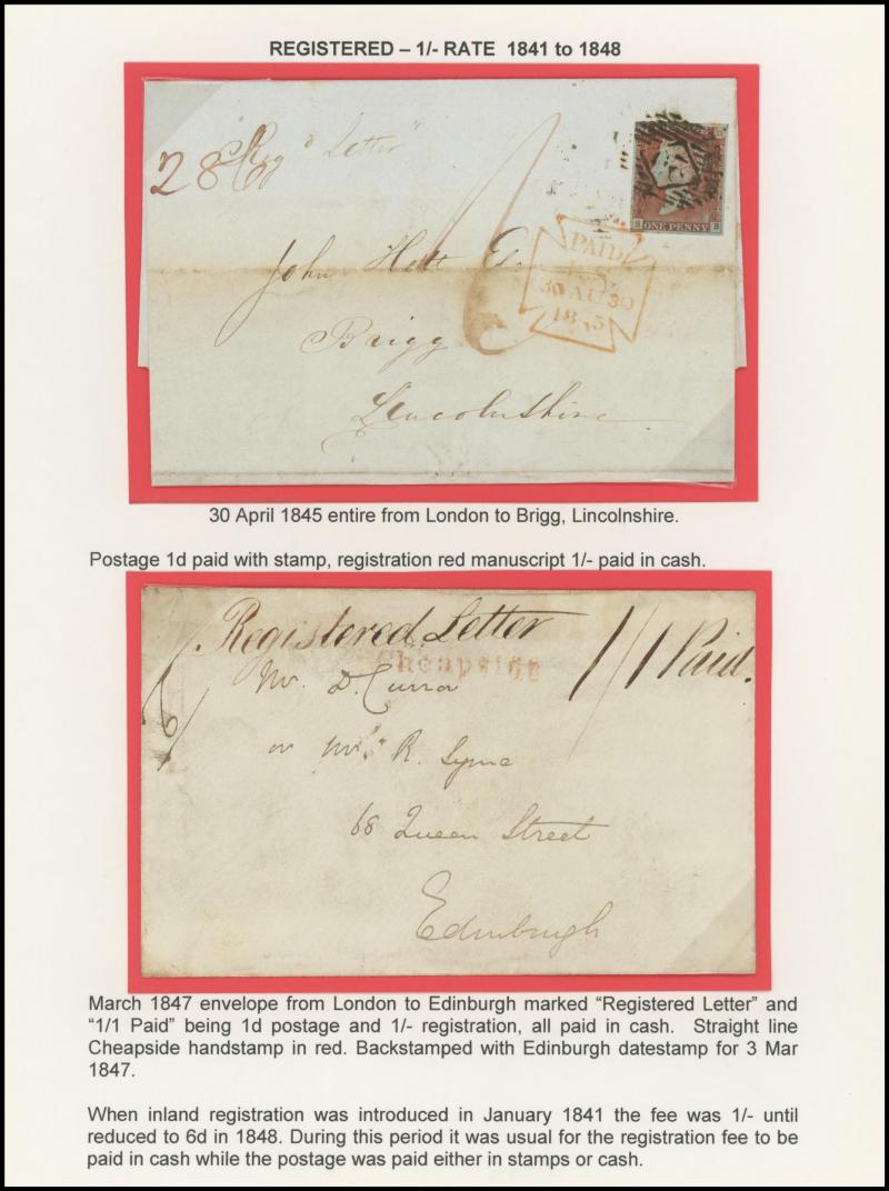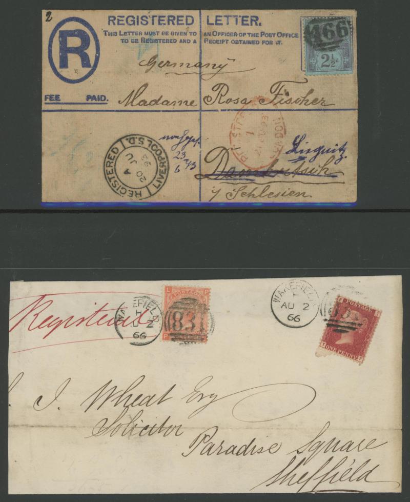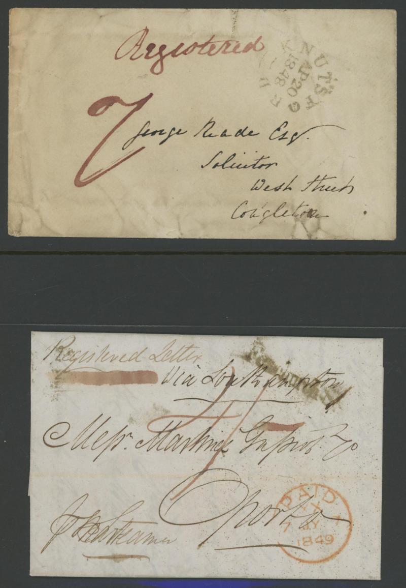 the registration fee paid in cash, 1847 to Scotland endorsed "Registered Letter 1/1 Paid" with London 'Cheapside' cachet in red, 1860 outer from Germany with very fine London 'PRUSSIA/REGISTERED' crowned handstamp, 1861-62 'LOMBARD STREET/REGISTERED