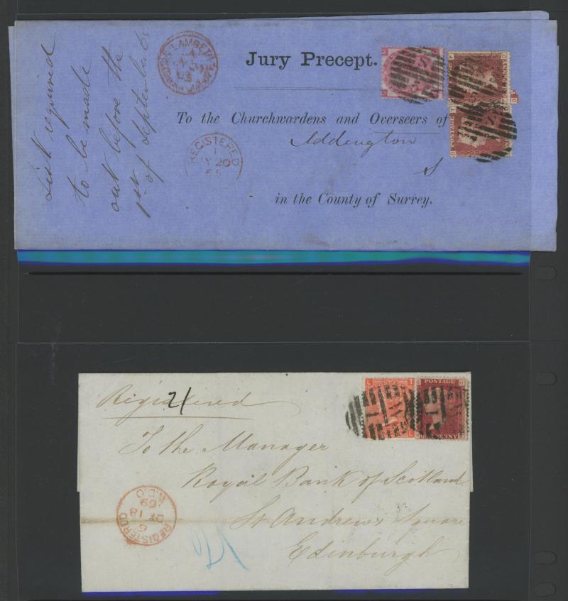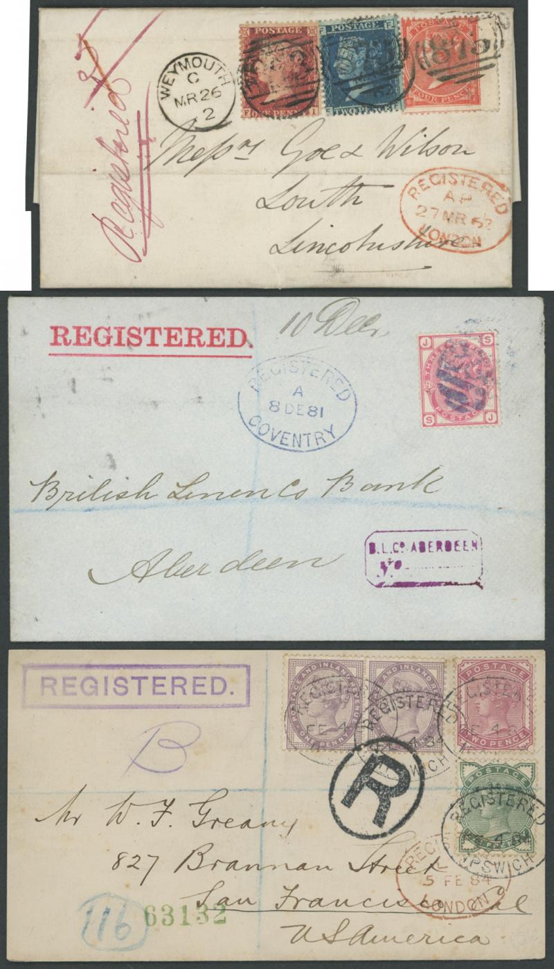 Registered Mail QV Frankings group with inland mail including 1862 to Louth with Stars 1d, Letters 2d blue & Surface-Printed Small