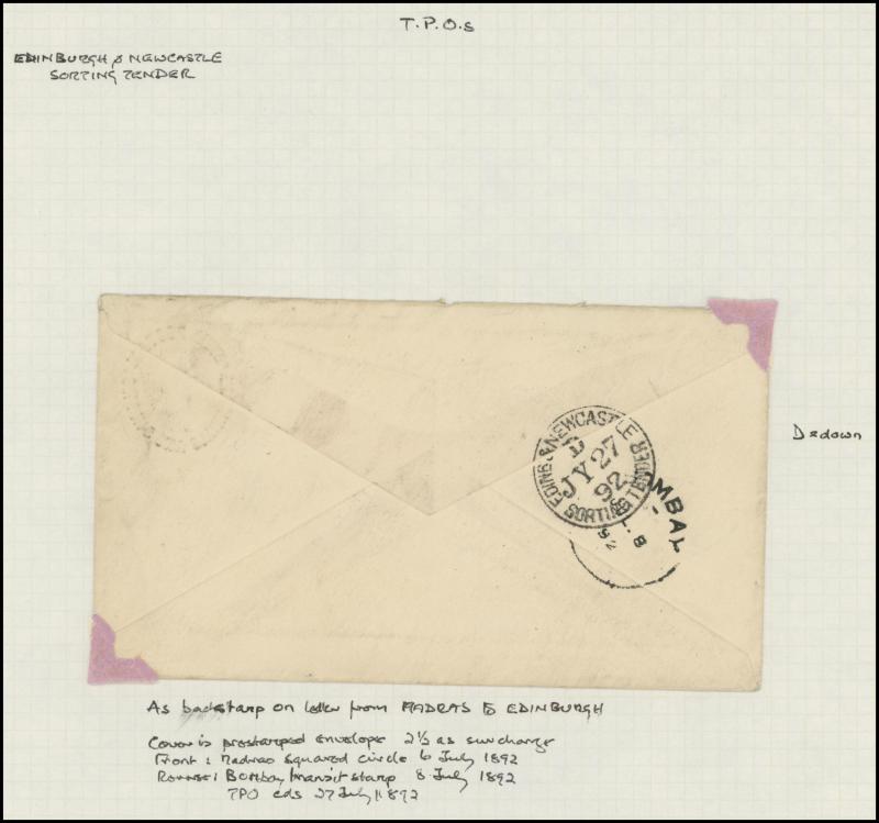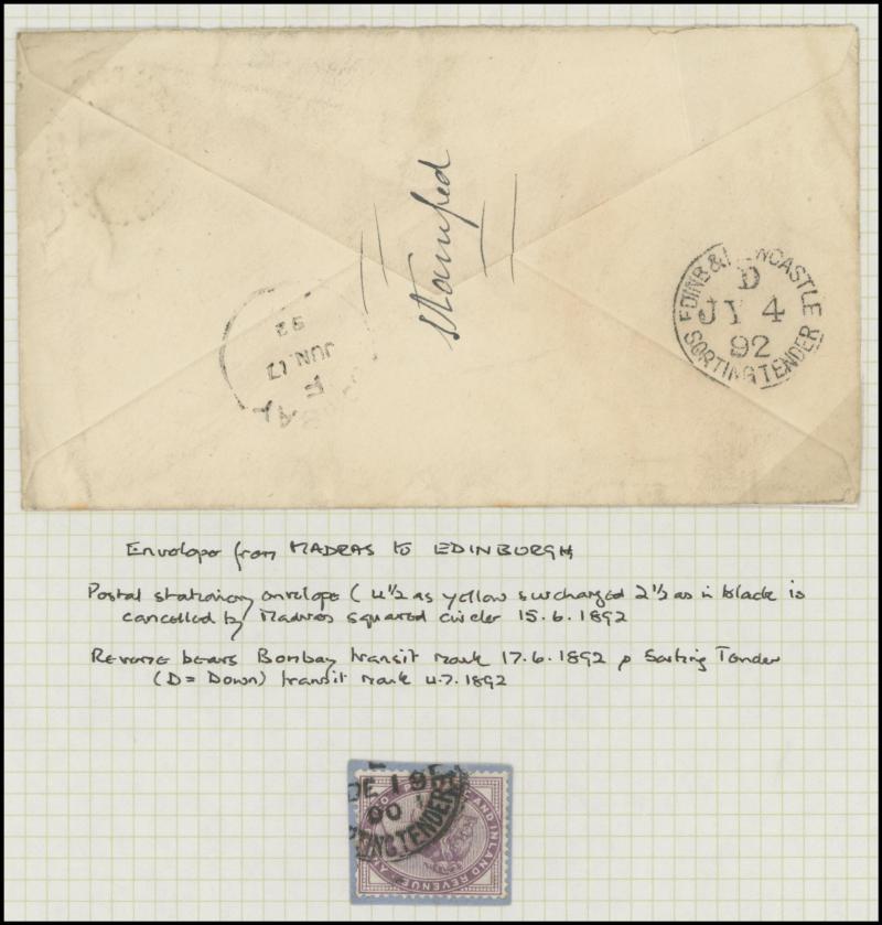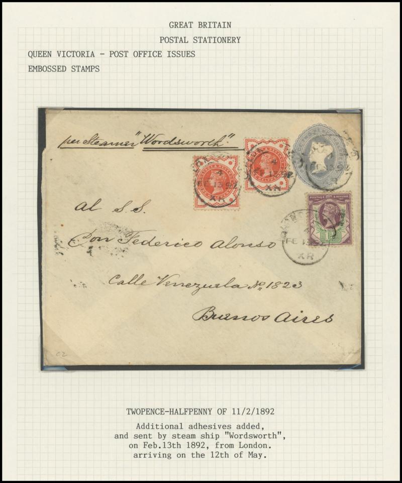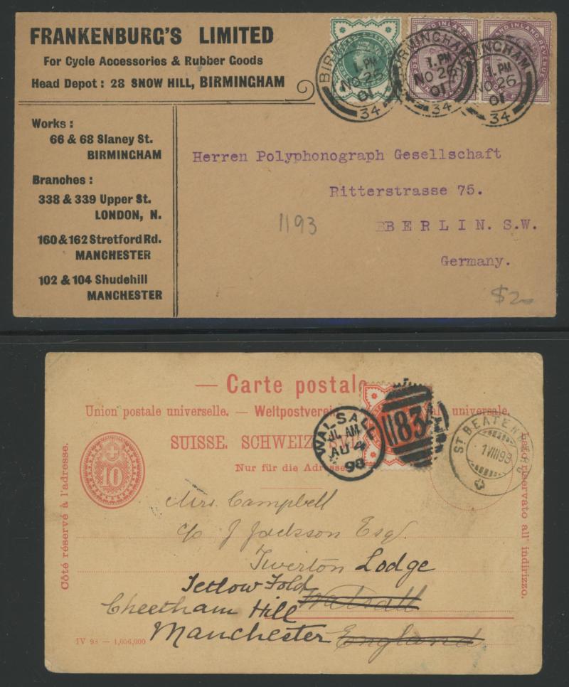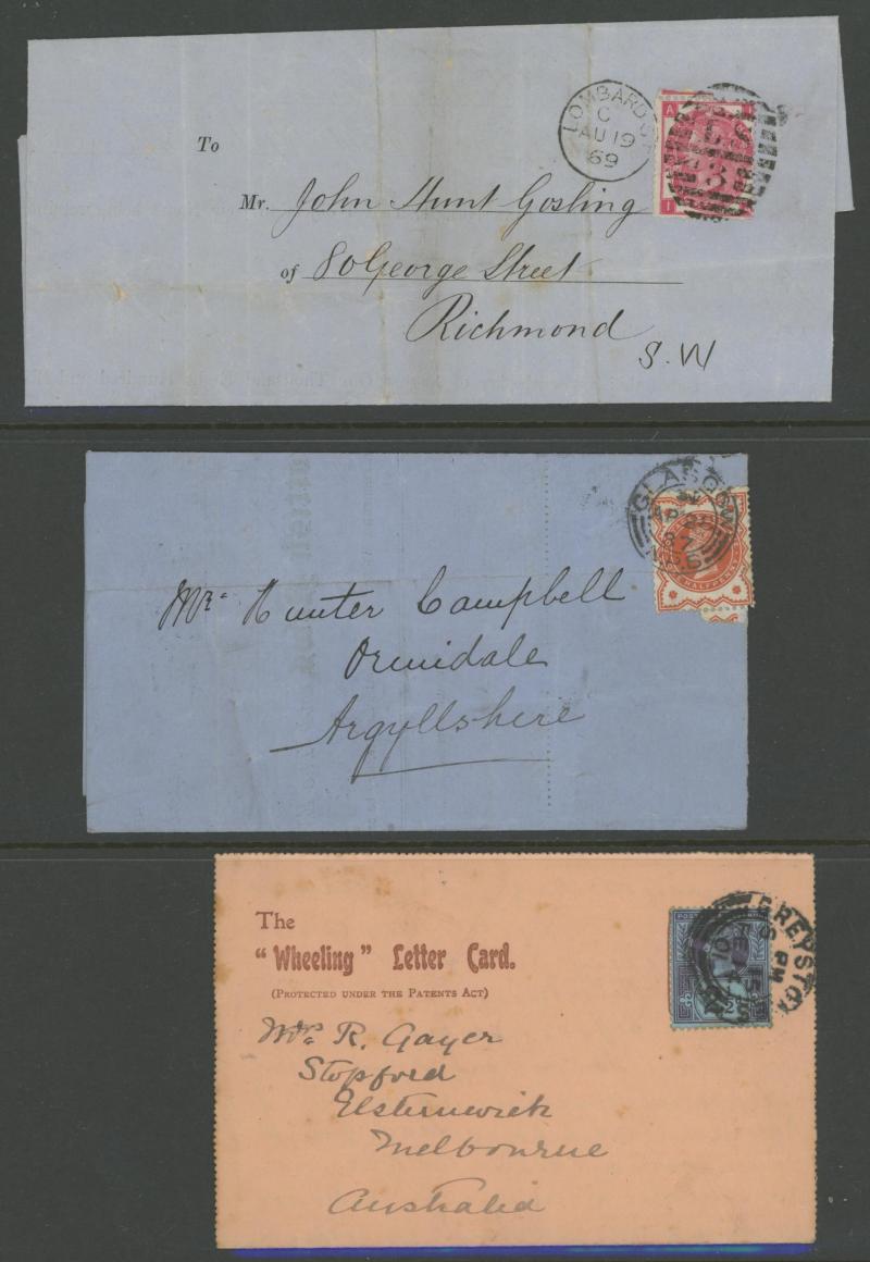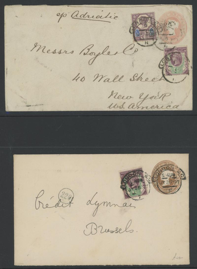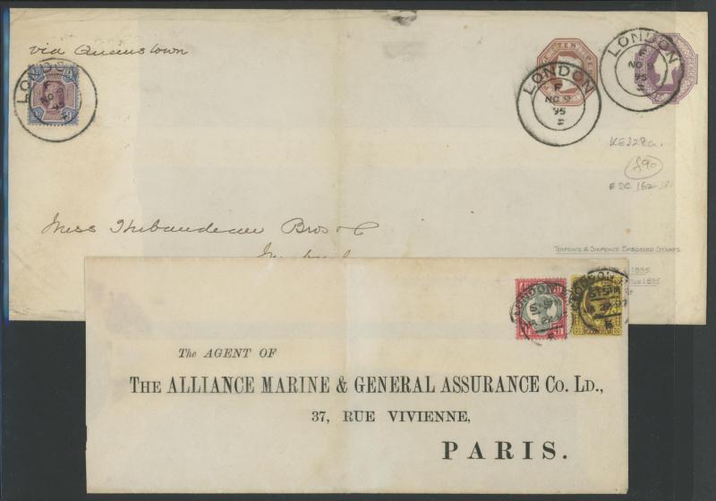 purple & green added for double rate, 1895 9d purple & blue (SG 209; Cat £275 on cover) uprating Stamped-to-Order Envelope Embossed 6d + 10d Doubleton to Canada, 1890s 10d purple & red (SG 210; Cat £300 on cover) on wrapper to Brazil, 1897 3d