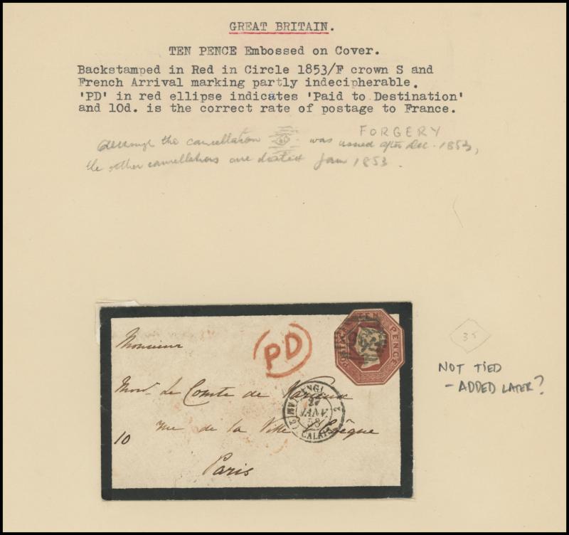 large-part outer Scotland to Spain with QV Embossed 10d brown (cut-to-shape) tied by very fine Numeral '212' with 'KIRRIEMUIR' despatch and 'INSUFFICIENTLY/ STAMPED' & 'RETURNED FOR POSTAGE/"5"/THE AMOUNT/DEFICIENT' cachets, a range of 1850s-70s More
