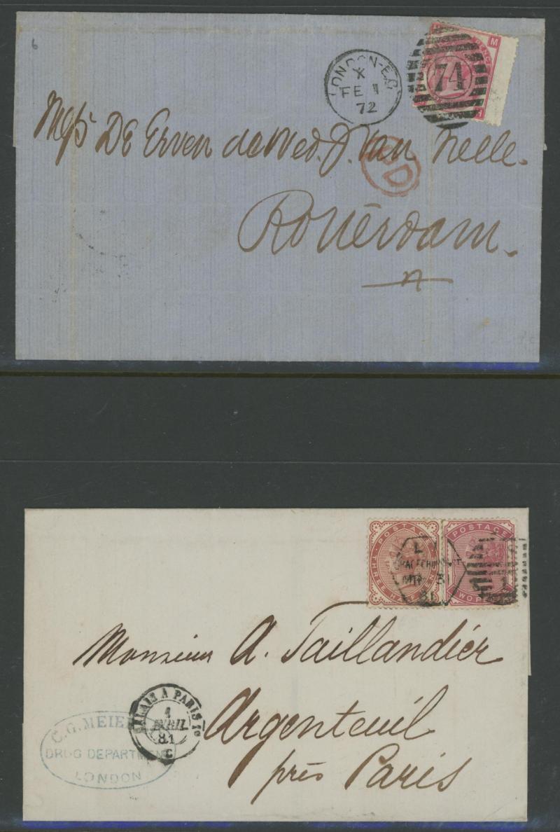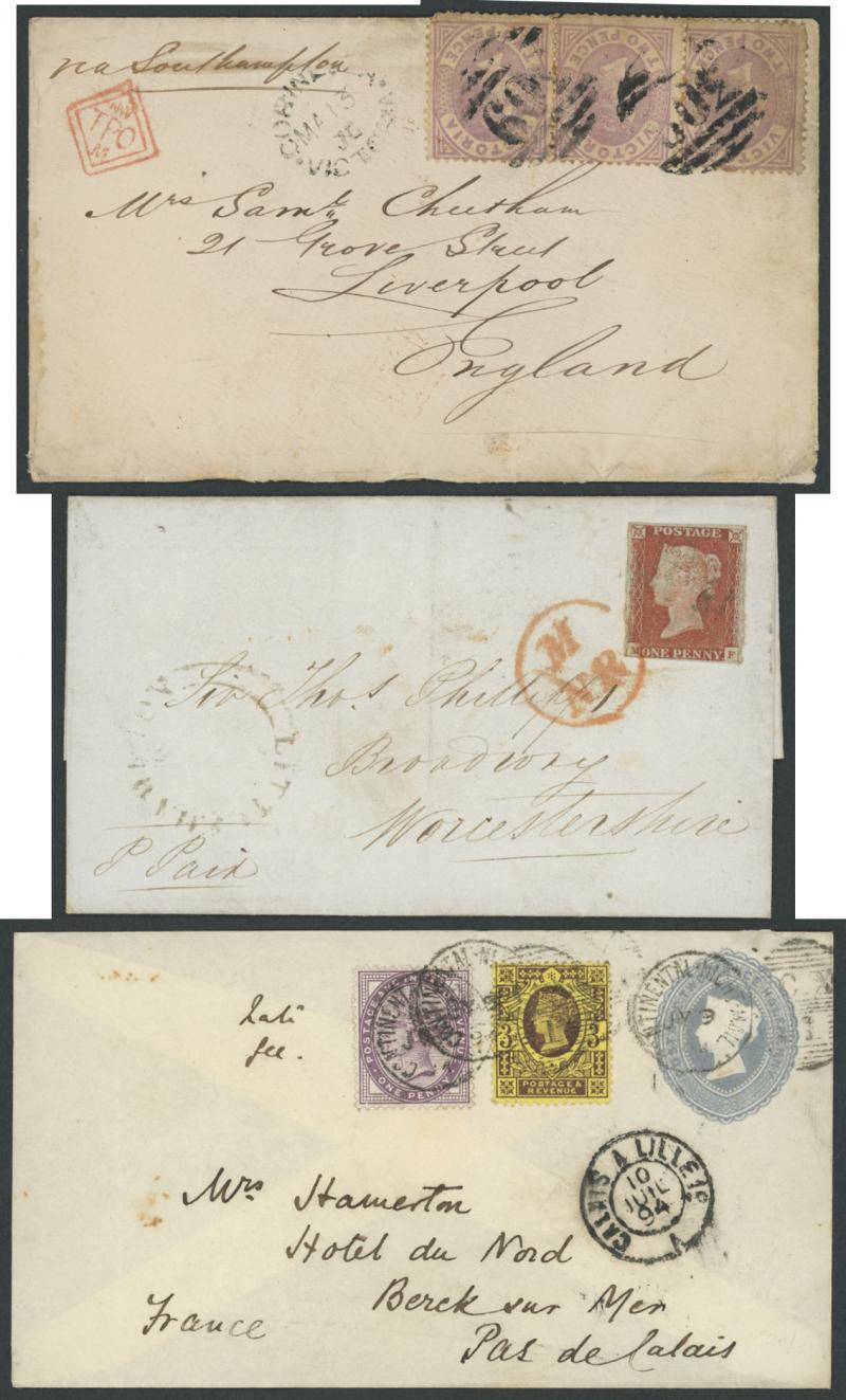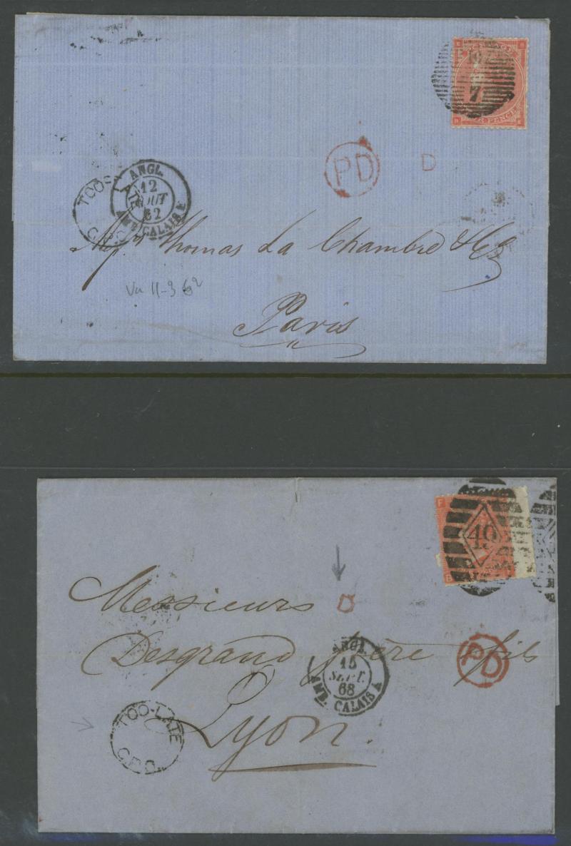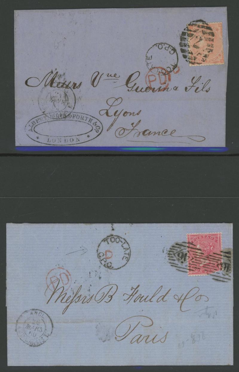 destinations including No Corner Letters 1857 6d lilac solo to Australia and 1858 6d lilac pair to India, Small Uncoloured Corner Letters 1862 4d pale red (SG 80; Cat £300 on cover) solo to France with 'TOO.LATE/G.P.O.' cachet and French TPO, Large
