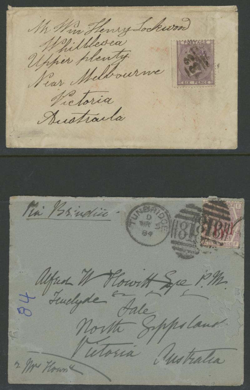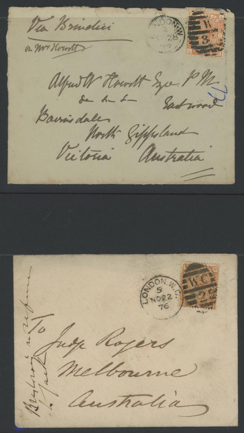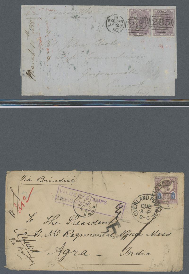 destinations including No Corner Letters 1857 6d lilac solo to Australia and 1858 6d lilac pair to India, Small Uncoloured Corner Letters 1862 4d pale red (SG 80; Cat £300 on cover) solo to France with 'TOO.LATE/G.P.O.' cachet and French TPO, Large