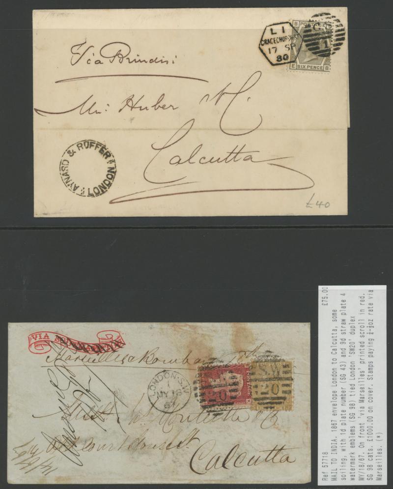 Uncoloured Corner Letters 1965 to France with 'TOO.LATE/G.P.O.' cachet, 1867 9d straw (SG 110; Cat £525 on cover) plus Line-Engraved Letters 1d to India on 'Via Southhampton' envelope with 'ribbon' crossed-out and replaced with "Marseilles & Bombay",