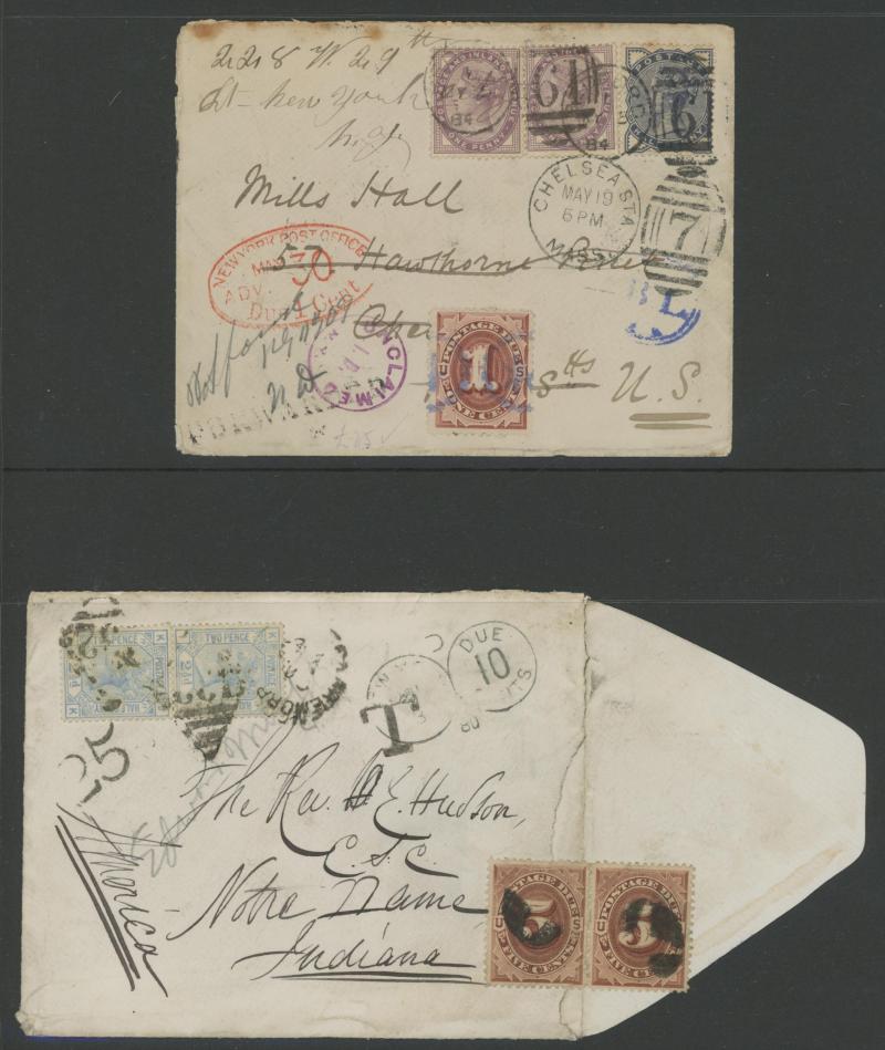 US Postage Dues 10c brown affixed, Jubilee 1887 5d purple & blue solo to India with 'VALUE OF STAMPS/DEFICIENT' handstamp, Indian 'OVERLAND POSTAGE DUE' datestamp and 'REFUSED' cachet, 1892 Envelope 2½d grey to Argentina with ½d vermilion x2 and 1½d