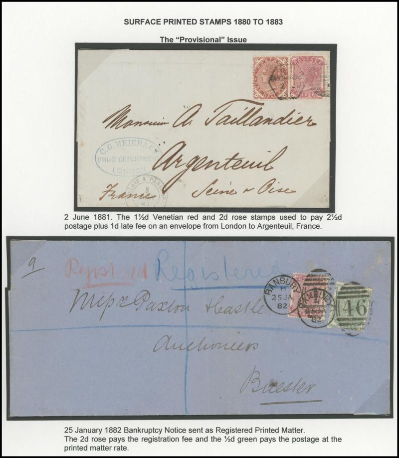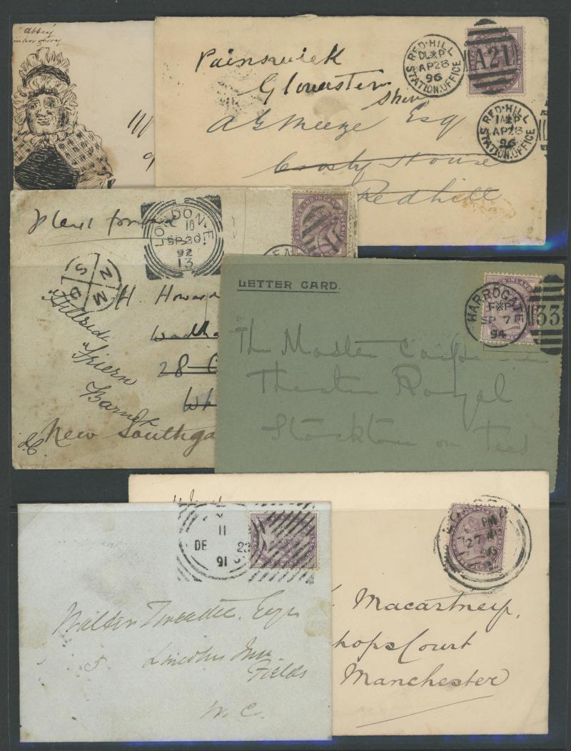 Brighton then to London each time with 1d Venentian red affixed (3 singles), 1882 Bankruptcy Notice with ½d green & 2d rose (SG 168; Cat £300 on cover) for registered printed matter, 1882 Meteorological Report with ½d green solo, etc, also foreign