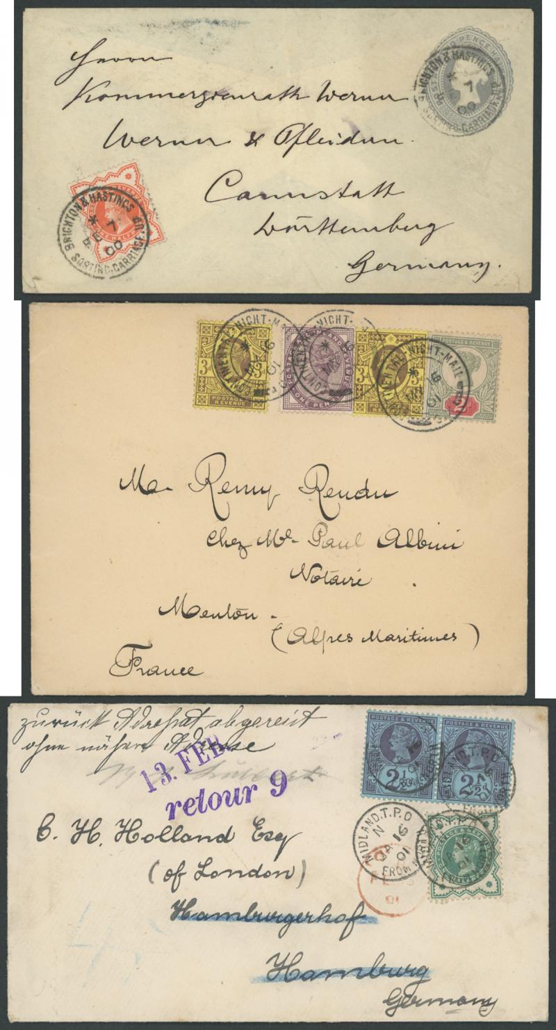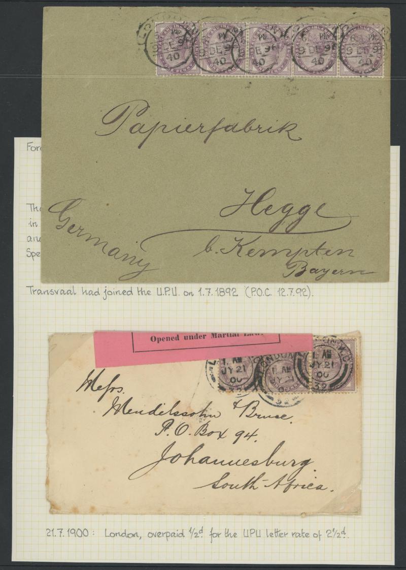 1d x2 uprating Envelope ½d pink to Germany, 1900 to South Africa with 1d x3 and Boer War 'Opened under Martial Law' censor label, and lots more, condition a little variable but most are fine to very fine. Excellent research material unchecked for