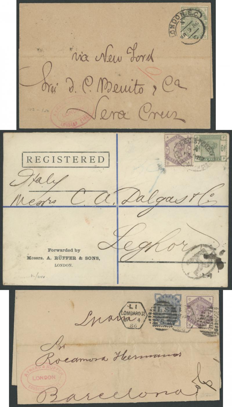 Hooded-Circle datestamps, 3d lilac with ½d slate tied ' L1 /LOMBARD ST' duplex to Spain, 4d green solo to Vera Cruz, Mexico, 6d green solo to Melbourne, Australia and with 3d lilac registered to Italy (ex Gilbert Wheat), condition generally fine to