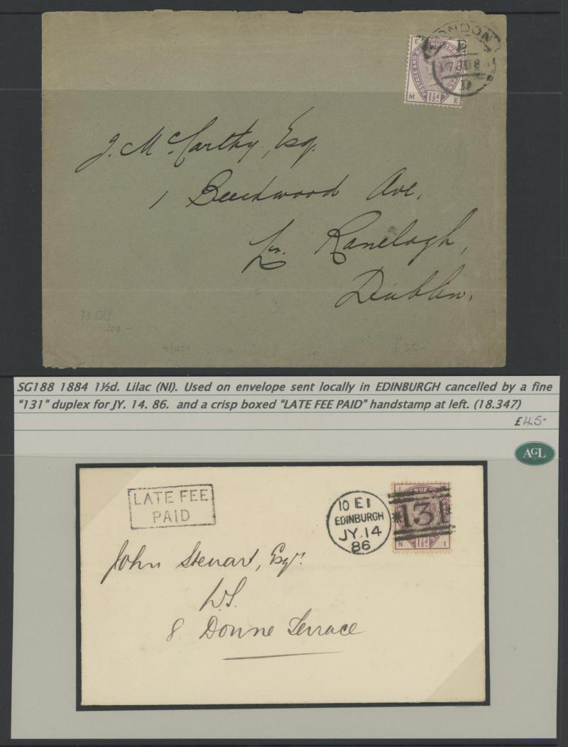 QV Lilacs & Greens Frankings group including 1½d lilac solos used within Edinburgh, Scotland with 'LATE FEE/PAID' boxed cachet,