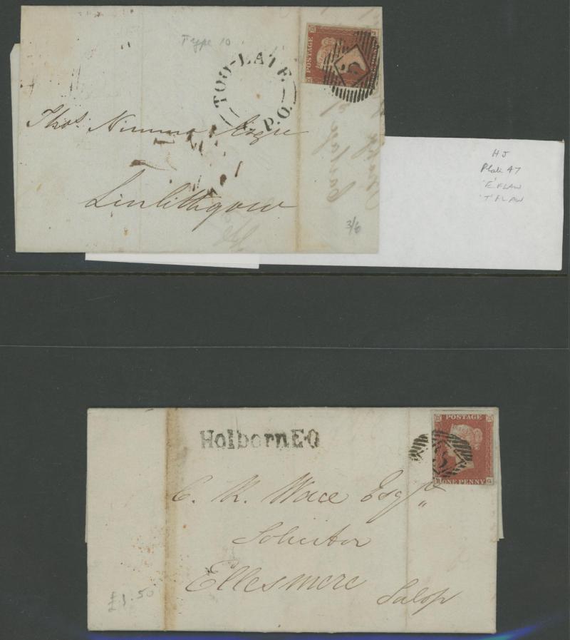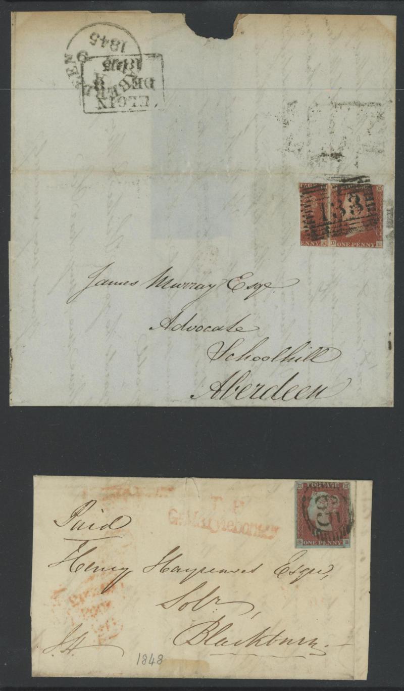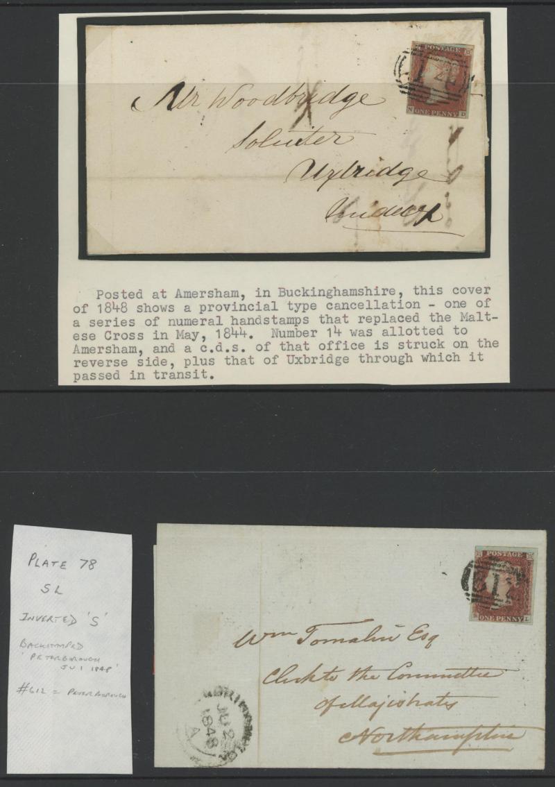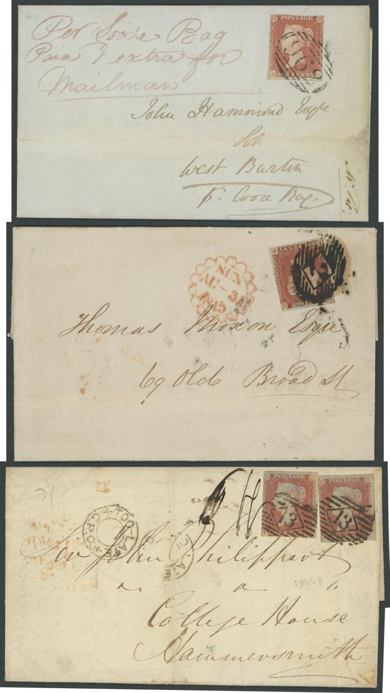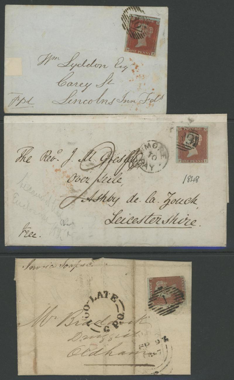 'TOO-LATE/G.P.O.' cachet, 1848 St Albans to Watford with large-margined 1d tied Numeral '675' and 'No.2' boxed cachet alongside, 1848 to Leicestershire with 'MORE/TO/PAY' cachet, 1848 outer with 1d Plate 78 [SL] with Inverted 'S' (just shaved at