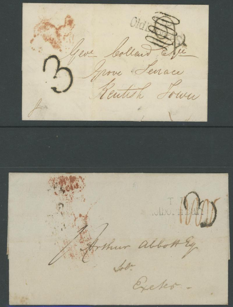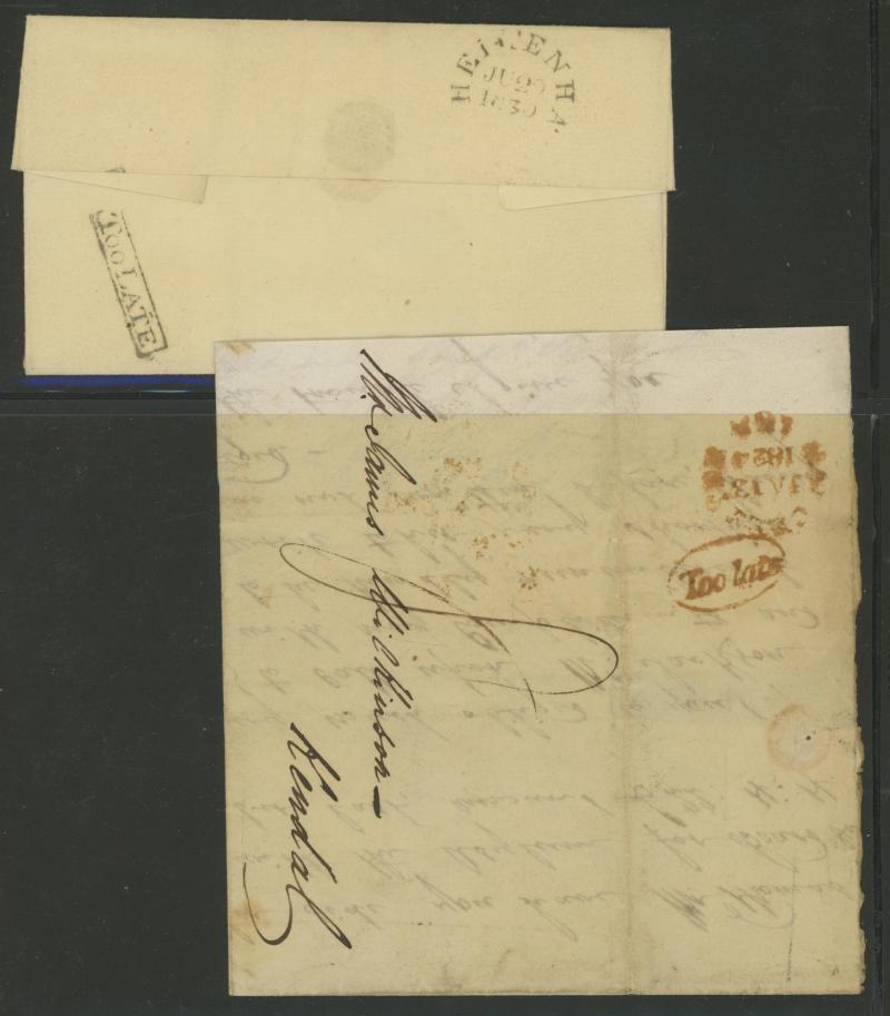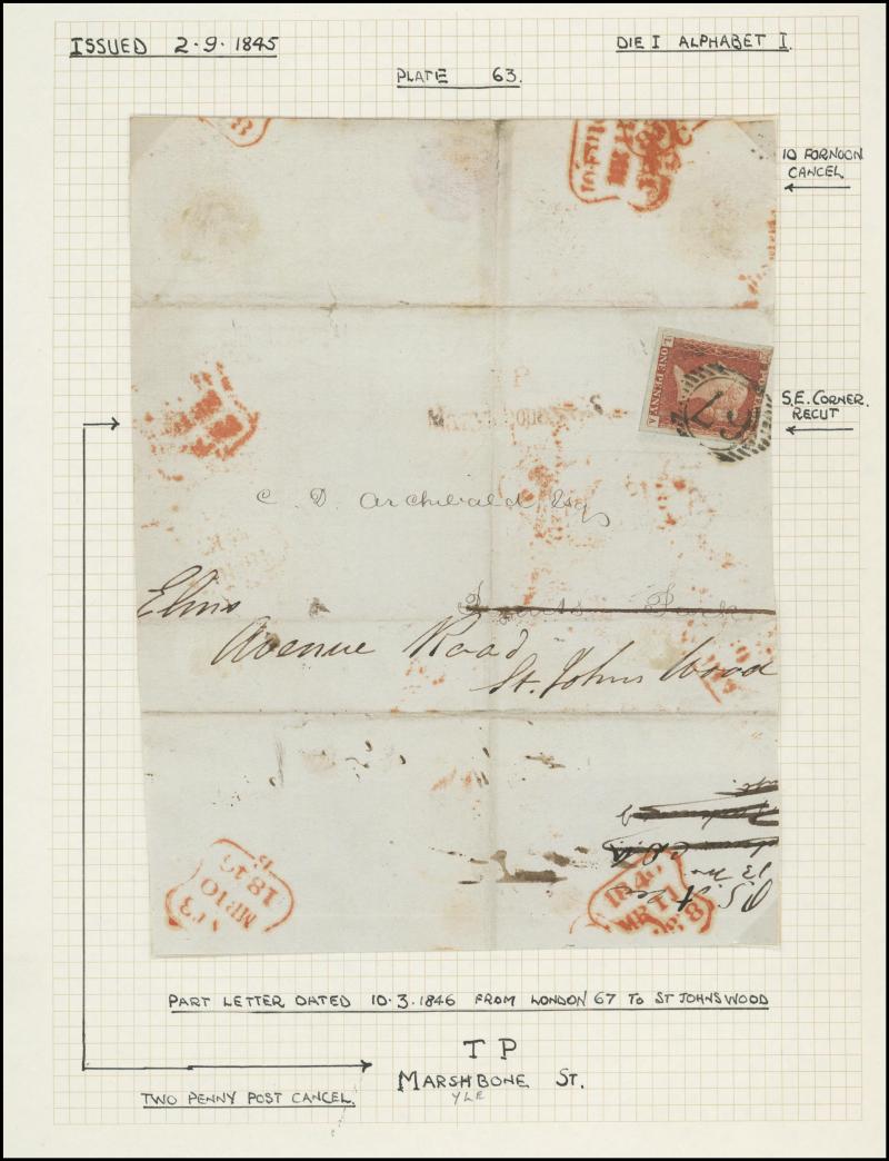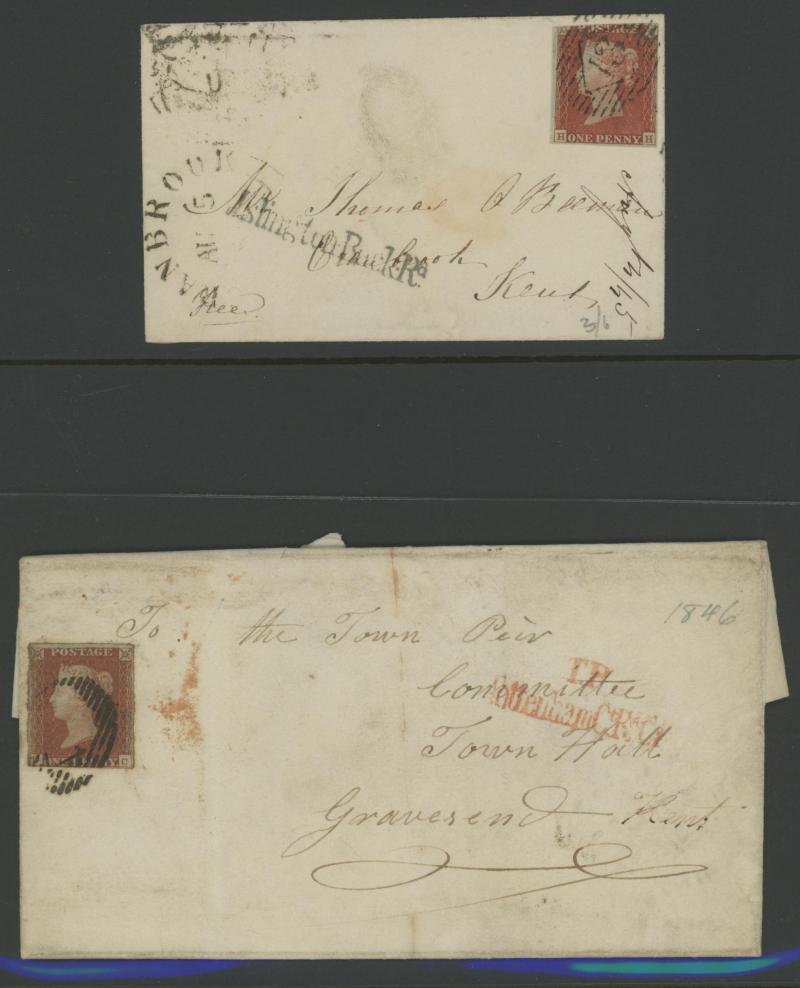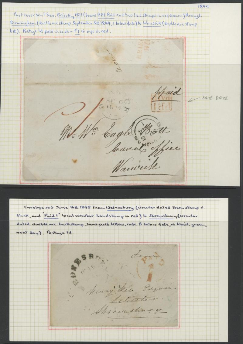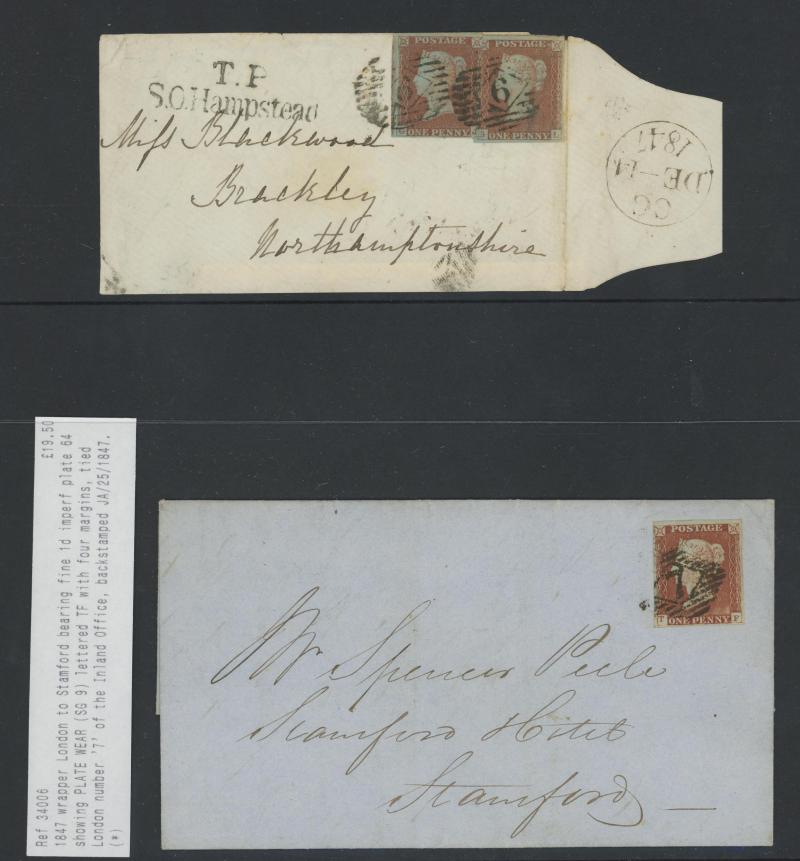 'TOO-LATE/G.P.O.' cachet, 1848 St Albans to Watford with large-margined 1d tied Numeral '675' and 'No.2' boxed cachet alongside, 1848 to Leicestershire with 'MORE/TO/PAY' cachet, 1848 outer with 1d Plate 78 [SL] with Inverted 'S' (just shaved at