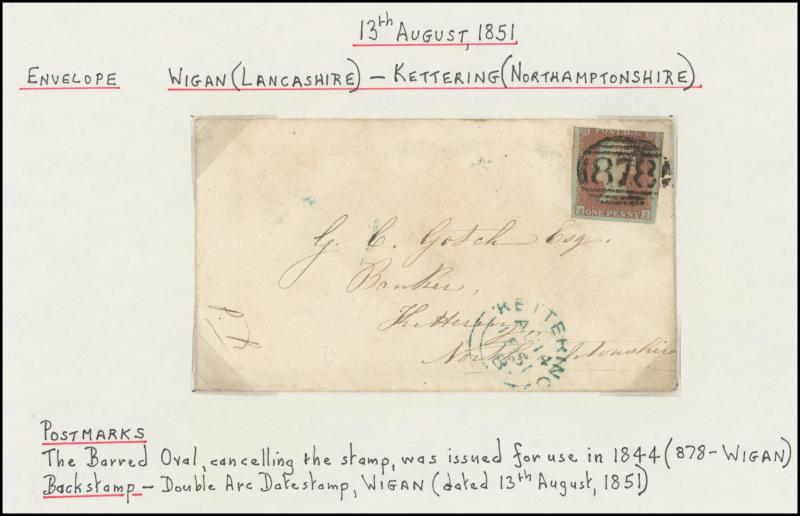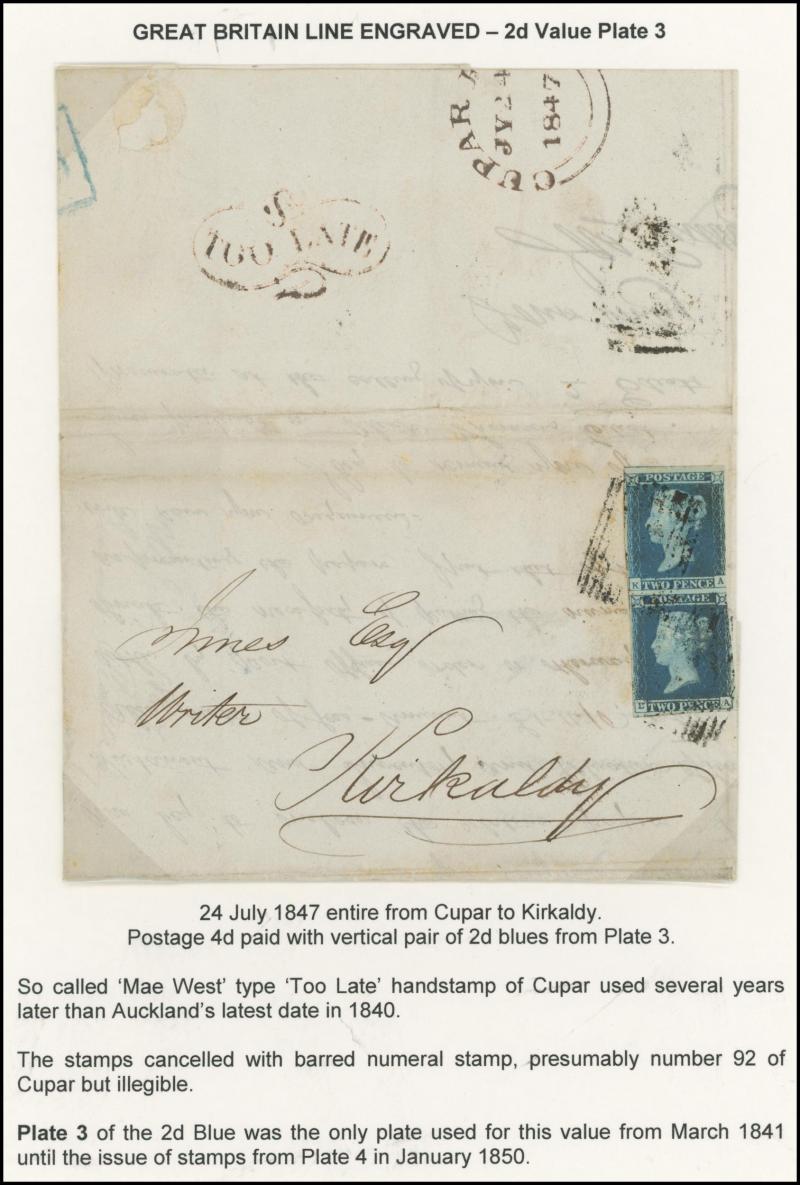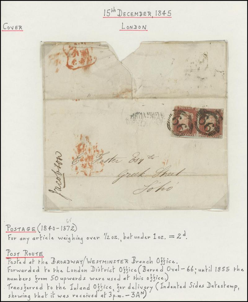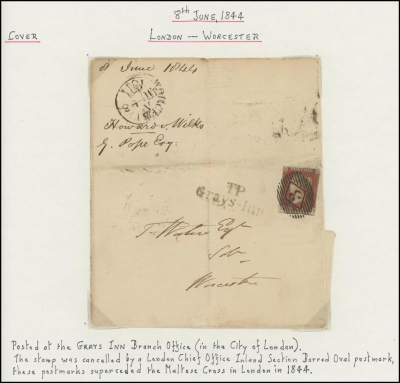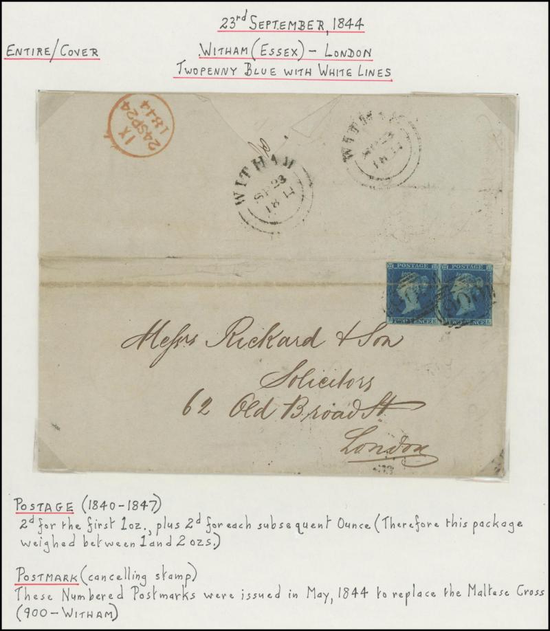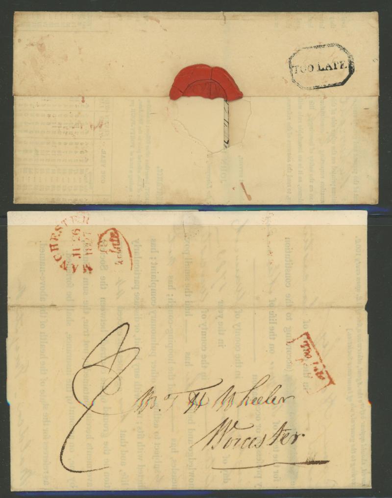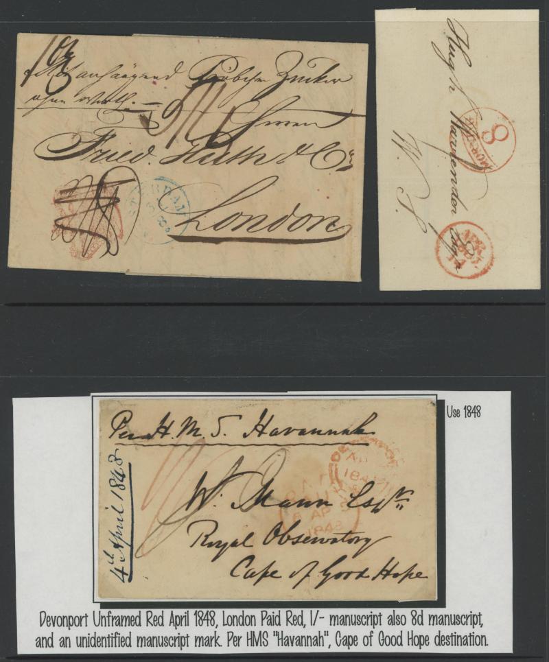 'TOO-LATE/G.P.O.' cachet, 1848 St Albans to Watford with large-margined 1d tied Numeral '675' and 'No.2' boxed cachet alongside, 1848 to Leicestershire with 'MORE/TO/PAY' cachet, 1848 outer with 1d Plate 78 [SL] with Inverted 'S' (just shaved at