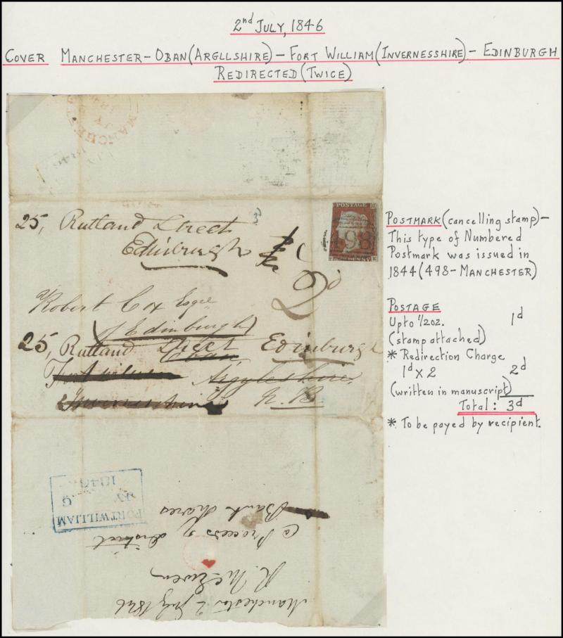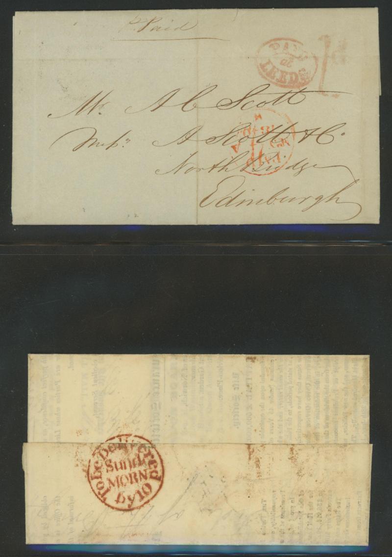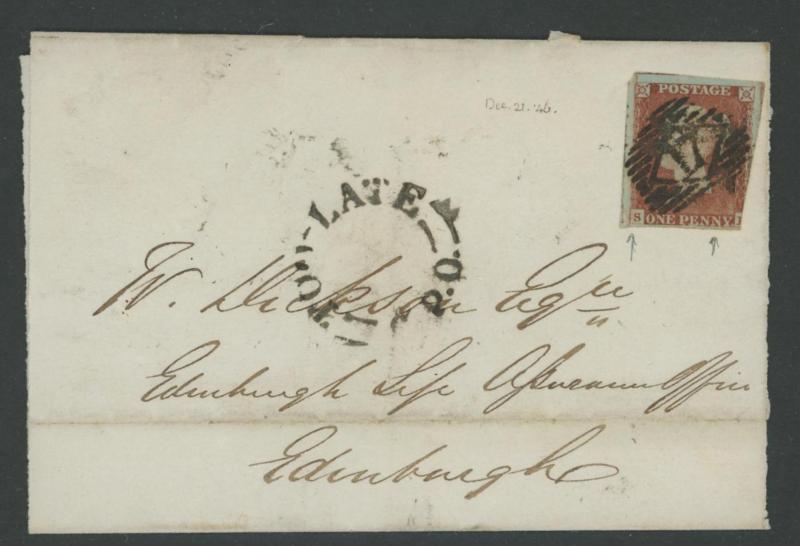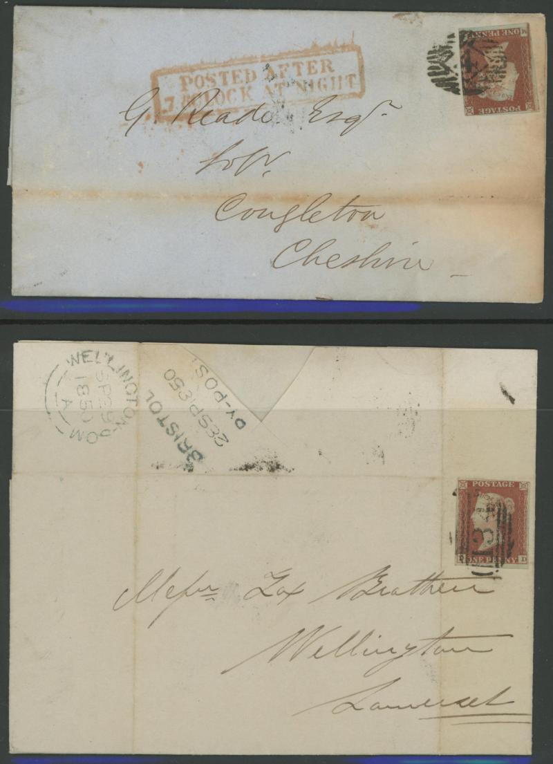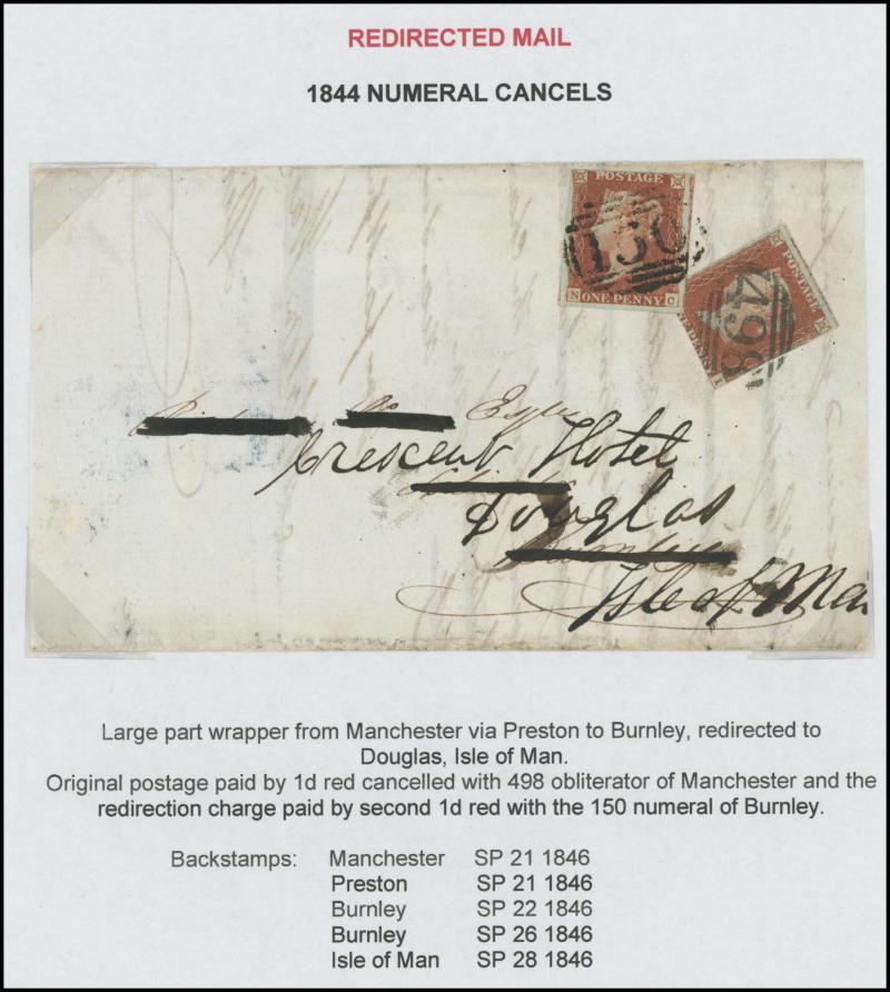 attached at left (bisected?) tied Leith Numeral '313', 1846 London to Cheshire with 'POSTED AFTER/7 o'CLOCK AT NIGHT' handstamp, 1846 Manchester to Burnley redirected to the Isle of Man with another 1d affixed, 1847 London to Oldham with