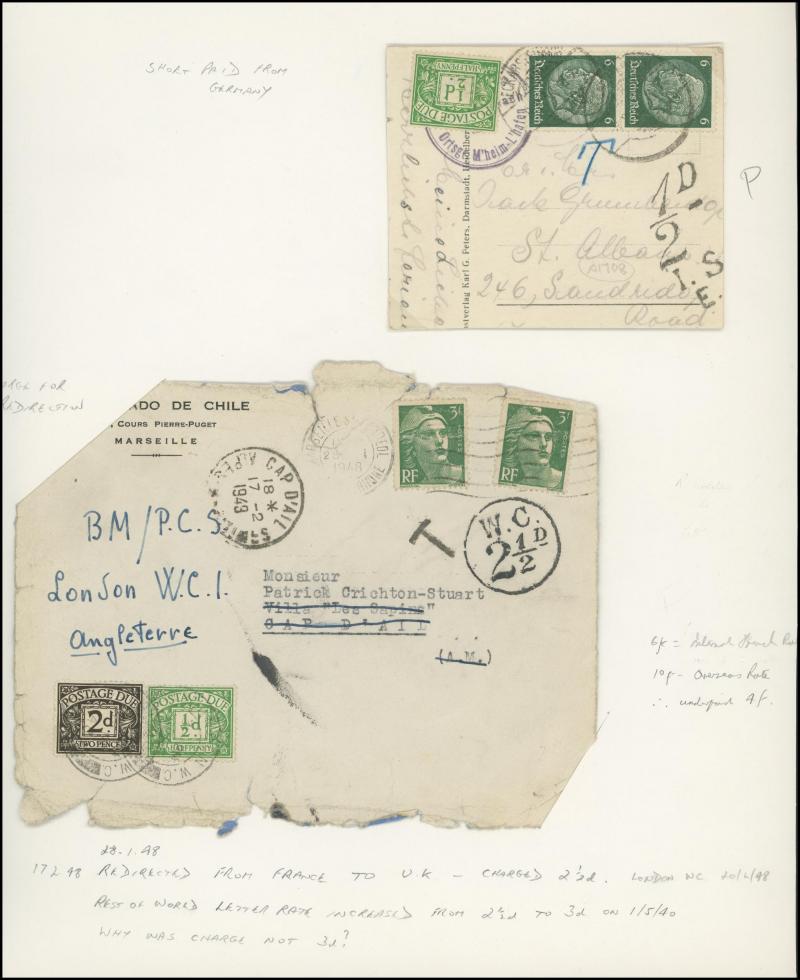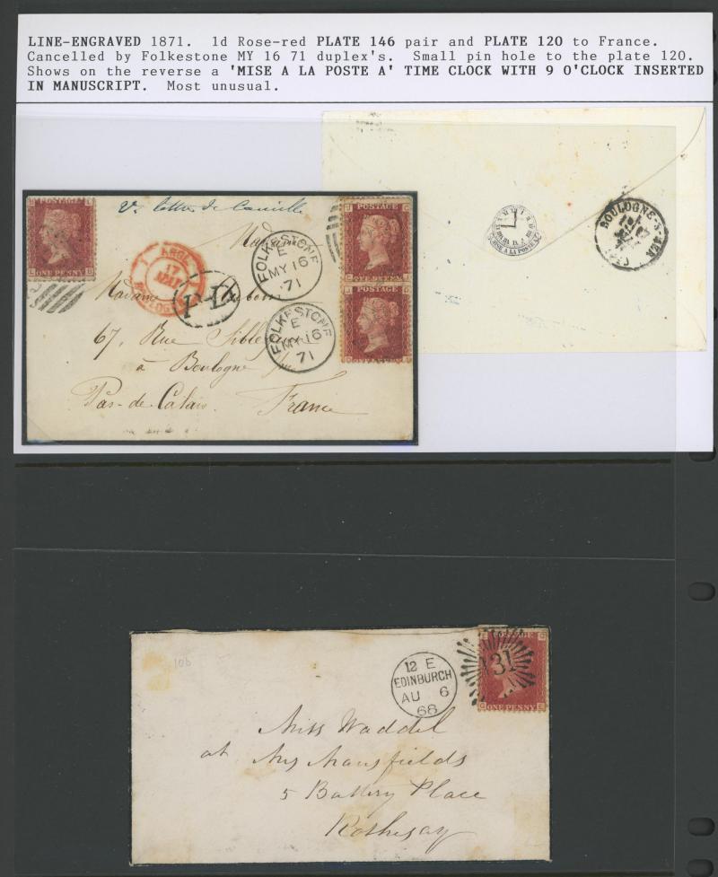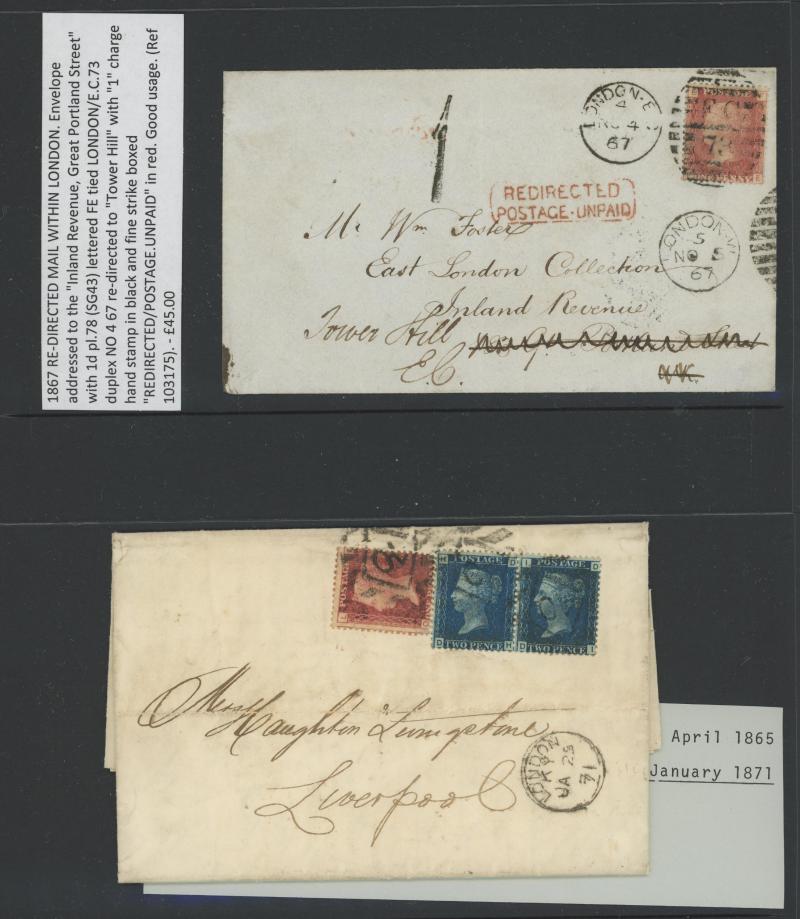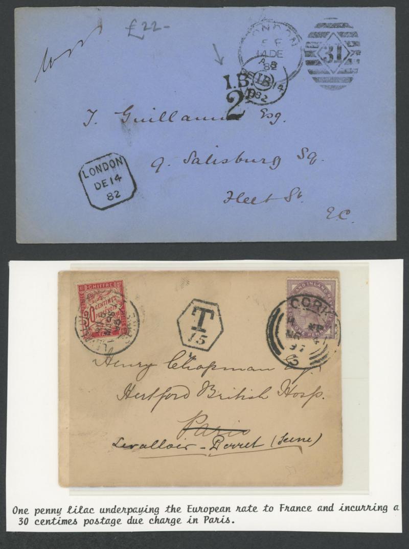 'REDIRECTION/POSTAGE-UNPAID' boxed handstamp in red and '1' large cachet for the postage due, 1871 entire to Liverpool with 1d & 2d x2 paying 5d for a 2oz - 2½oz letter, 1871 to France with 1d x3 tied Folkestone duplex, 'PD' [Paid to Destination]