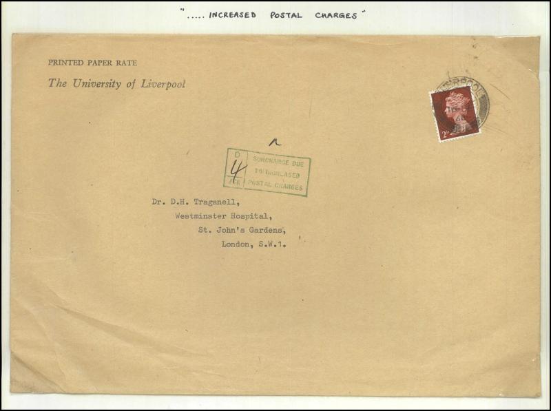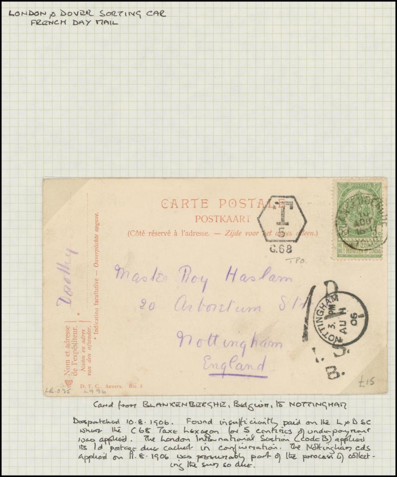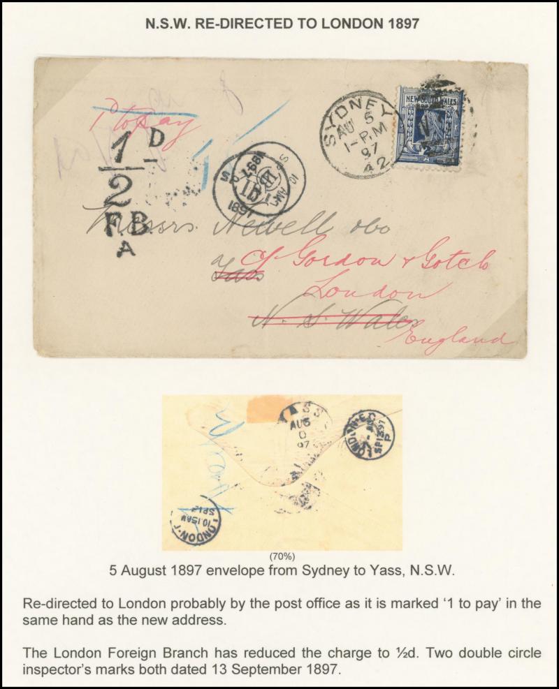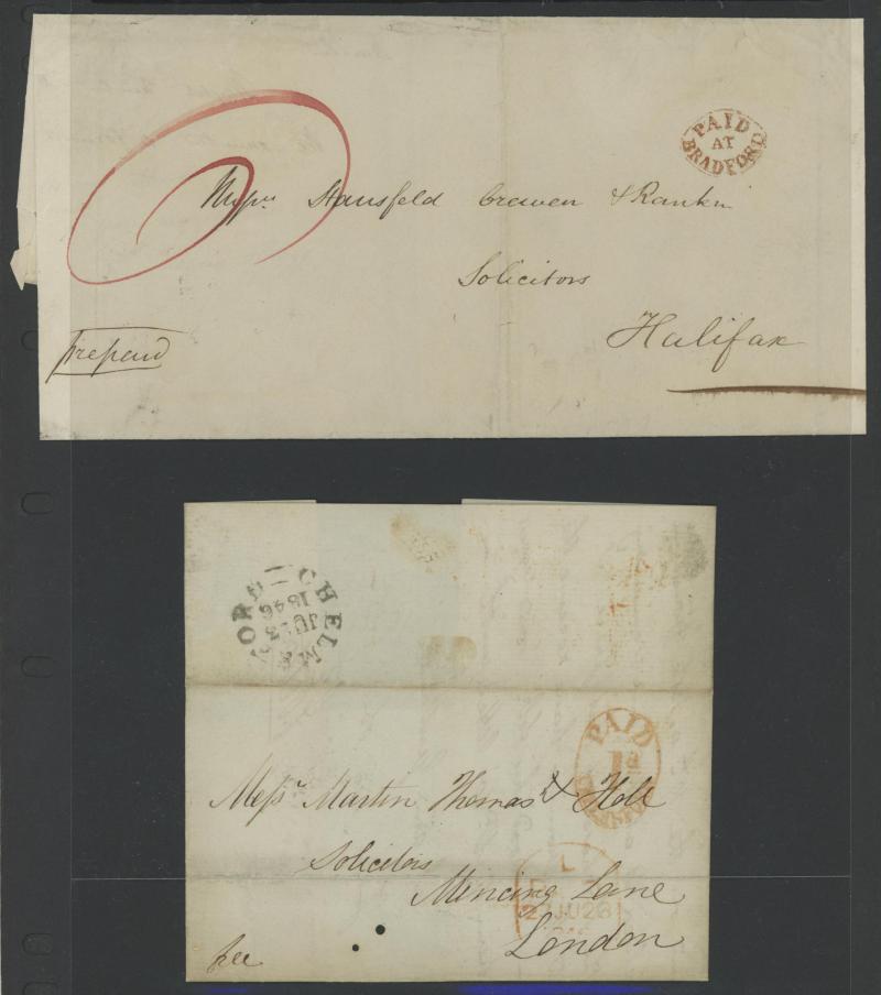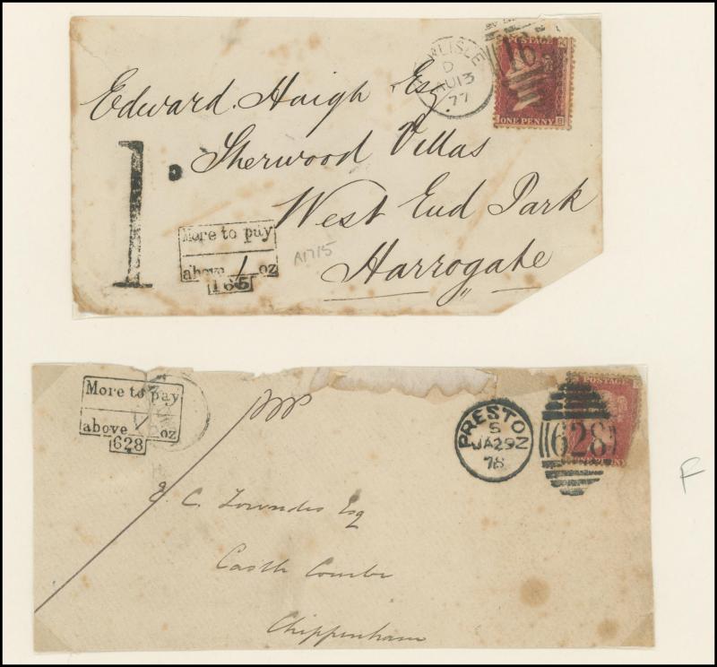 'REDIRECTION/POSTAGE-UNPAID' boxed handstamp in red and '1' large cachet for the postage due, 1871 entire to Liverpool with 1d & 2d x2 paying 5d for a 2oz - 2½oz letter, 1871 to France with 1d x3 tied Folkestone duplex, 'PD' [Paid to Destination]