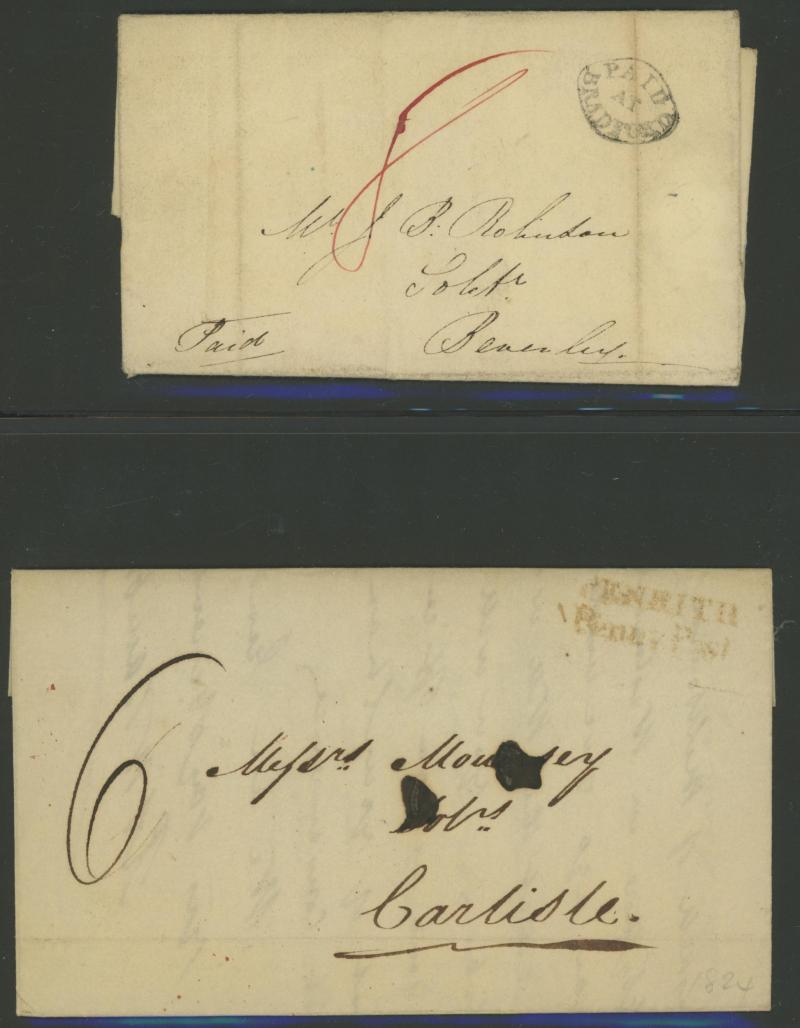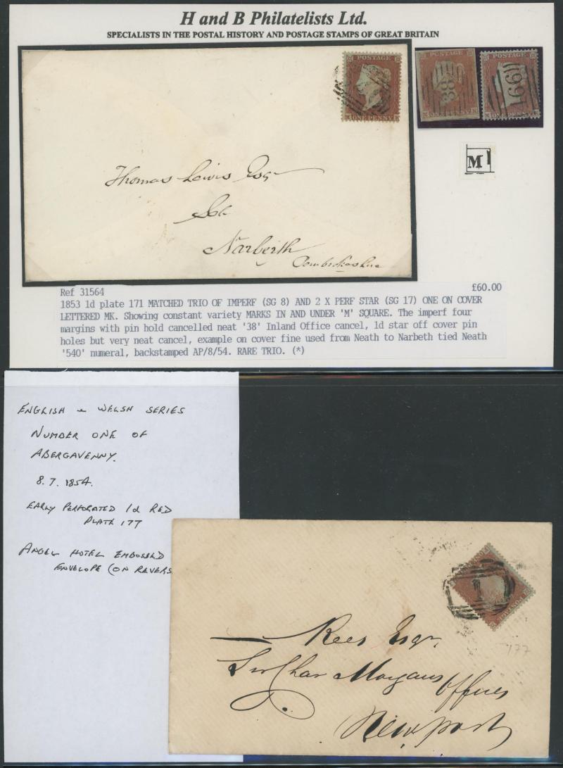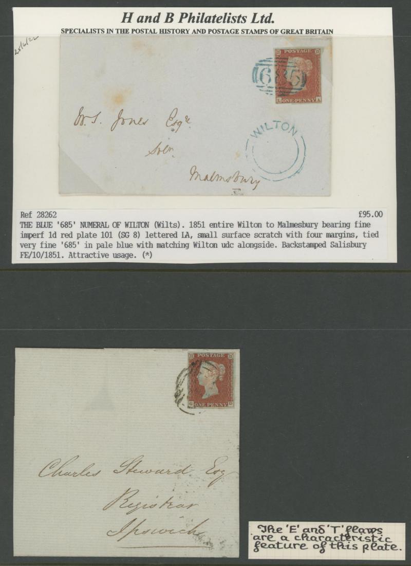 left; Cat £175 for used) tied Numeral '612' of Northampton, 1850 Middleham to West Burton endorsed "Per Loose Bag Paid 1d extra for Mailman", 1851 entire with 1d tied very fine Numeral '685' and 'WILTON' undated despatch alongside both in blue, other