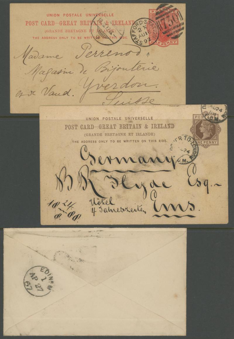 Venetian red on Envelope 1d rose to Germany, 1882 single on Postal Card 1½d brown to India with Bombay-Aden 'SEA/POST OFFICE' transit, etc, good variety of postmarks, numerals, duplexes and other markings, condition a little variable but generally