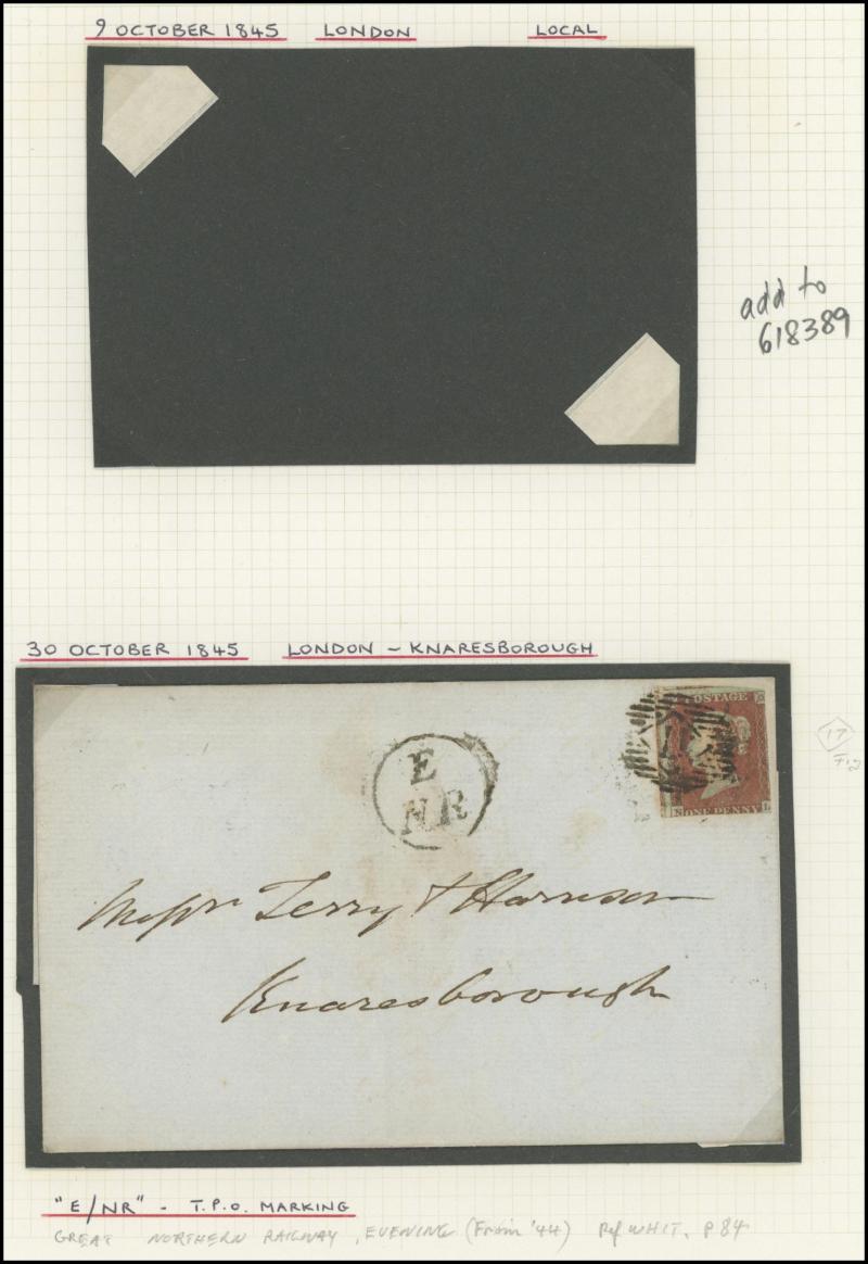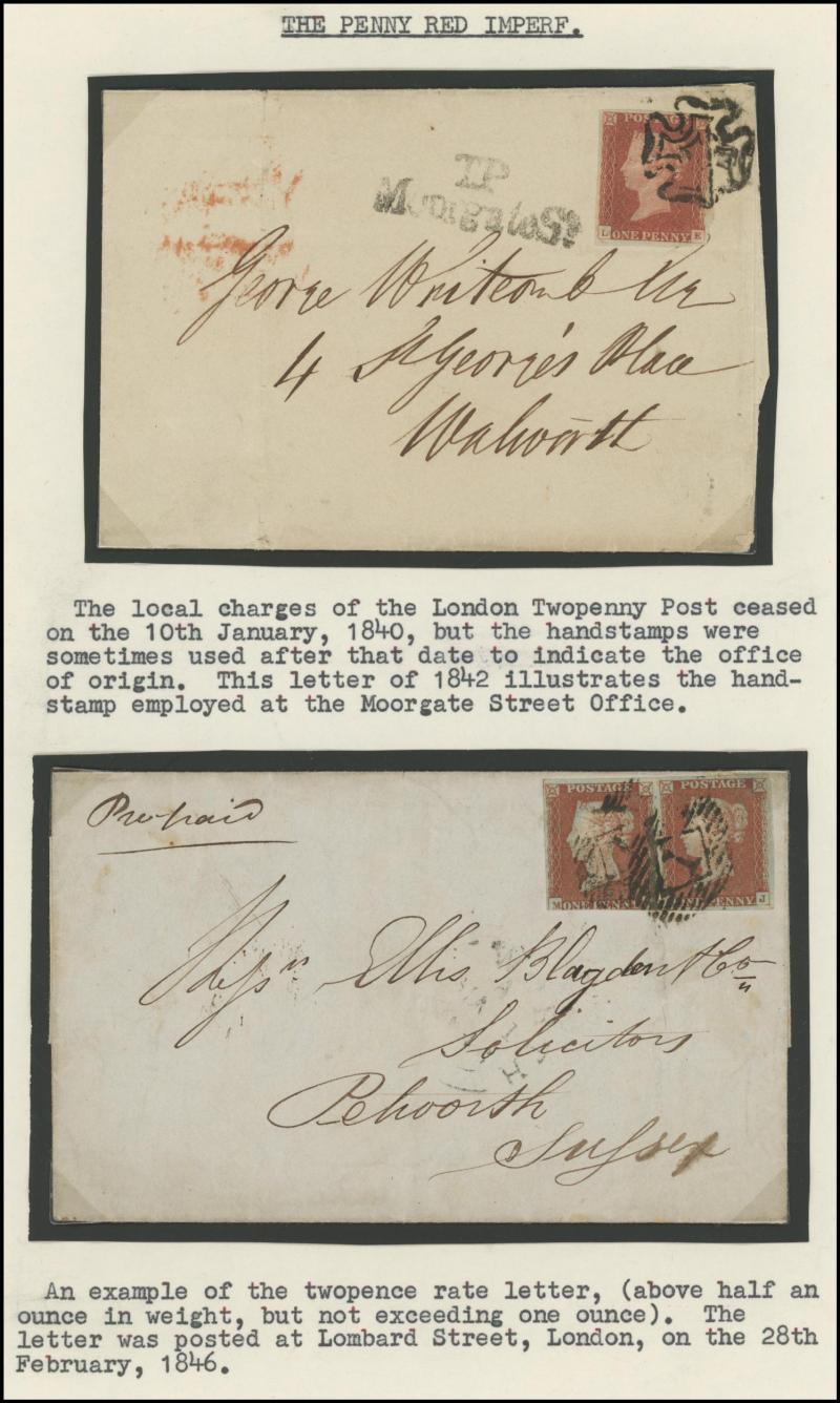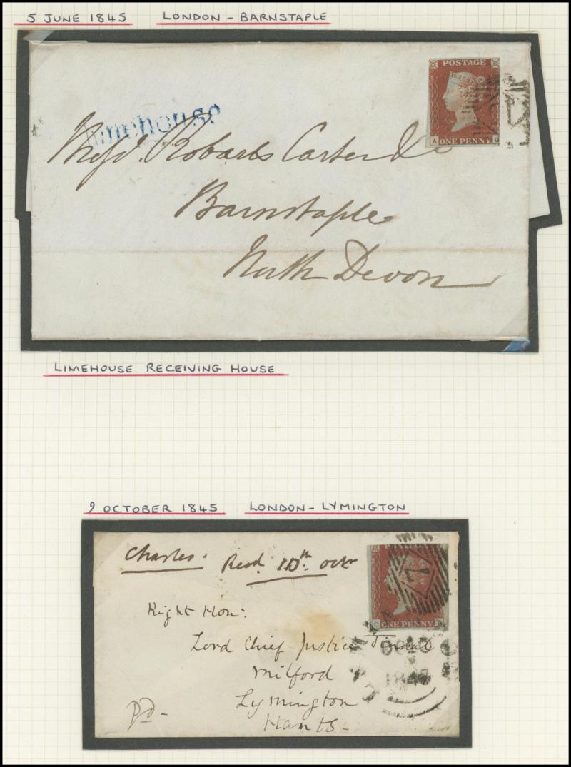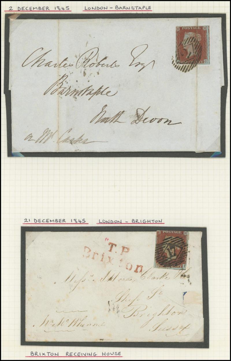 QV Line-Engraved Imperforate Penny Red frankings group mostly on annotated display pages including 1844 Twickenham to London with