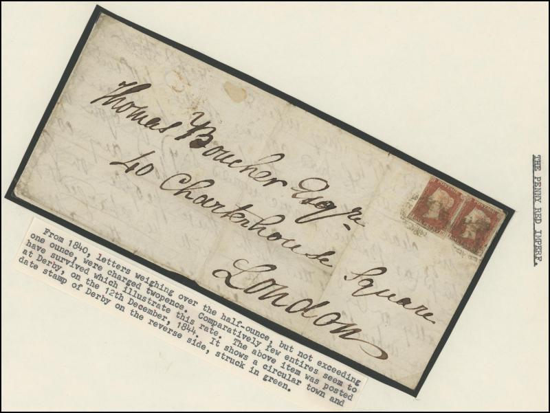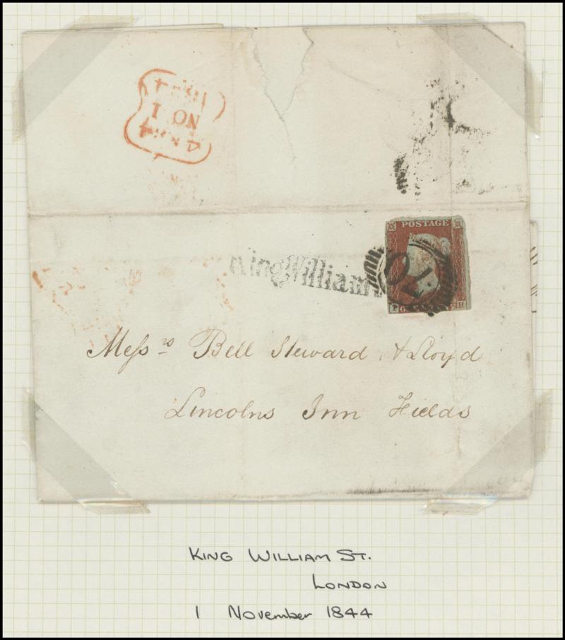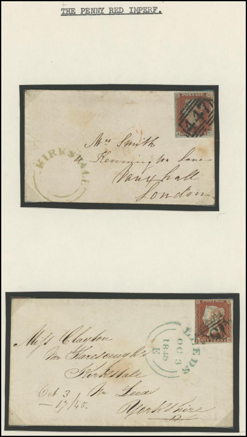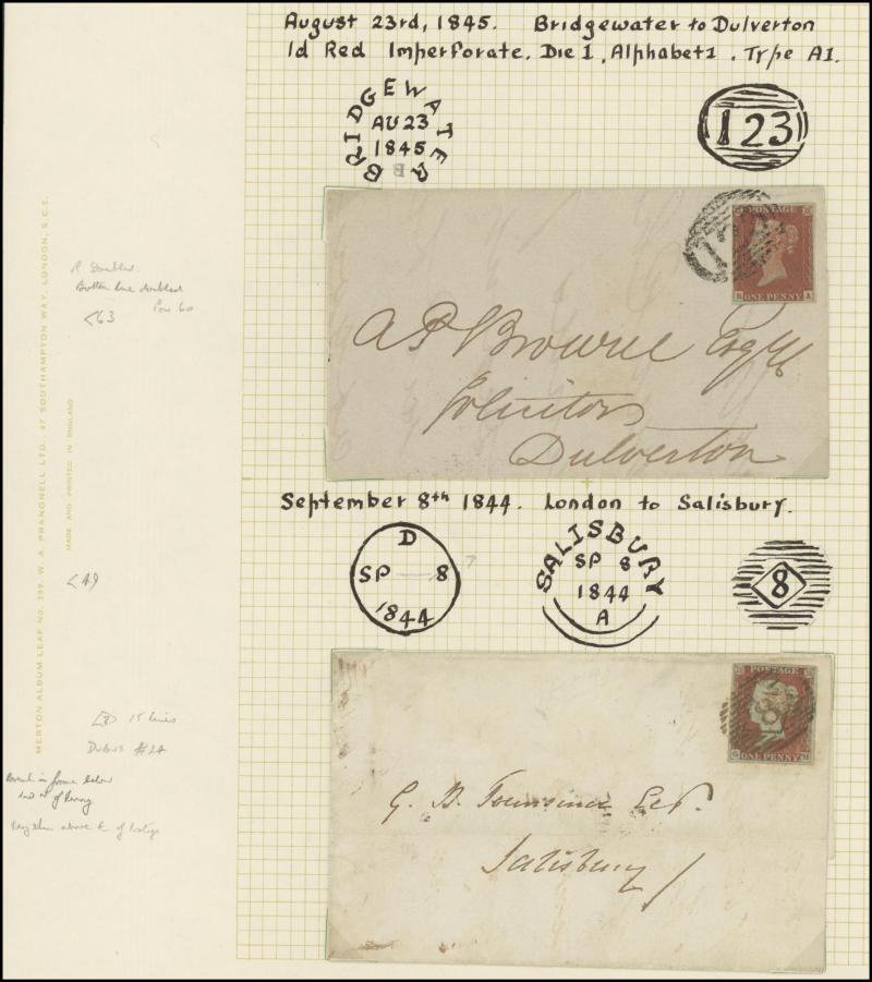 QV Line-Engraved Imperforate Penny Red frankings group mostly on annotated display pages including 1844 Twickenham to London with