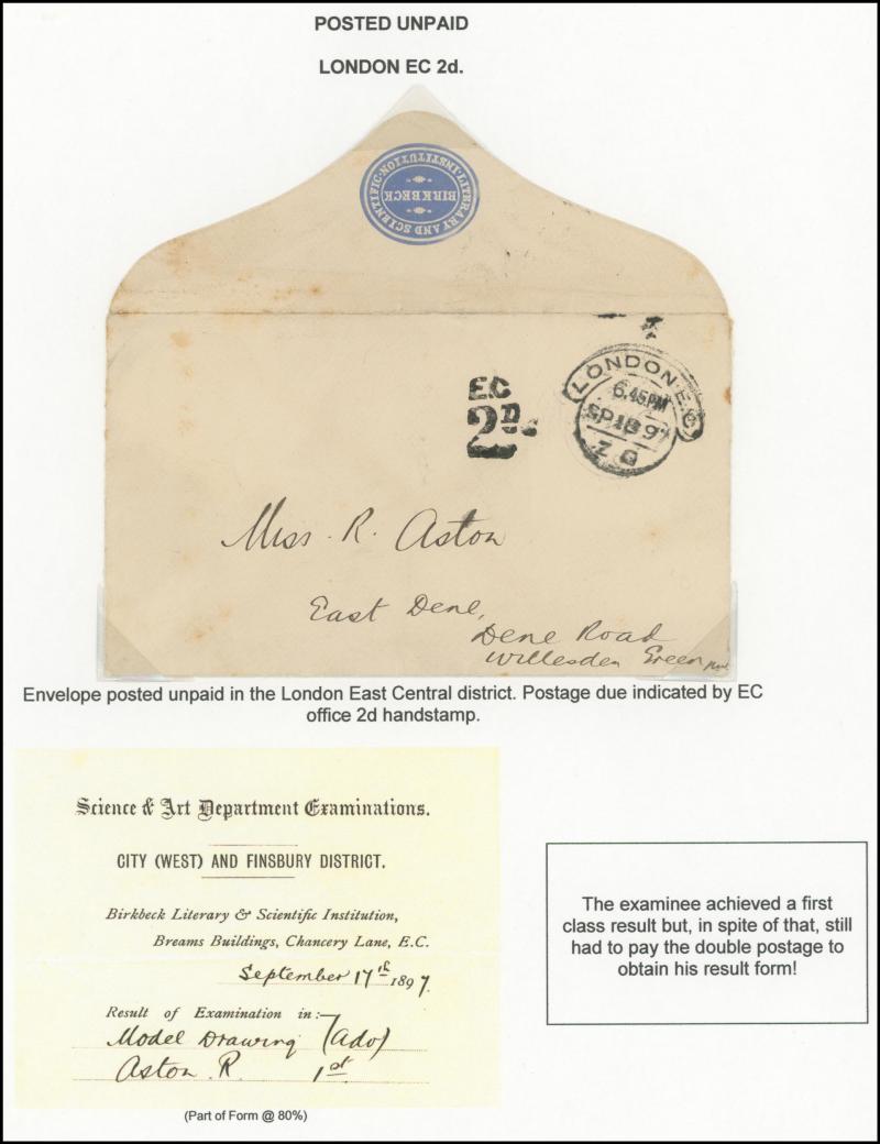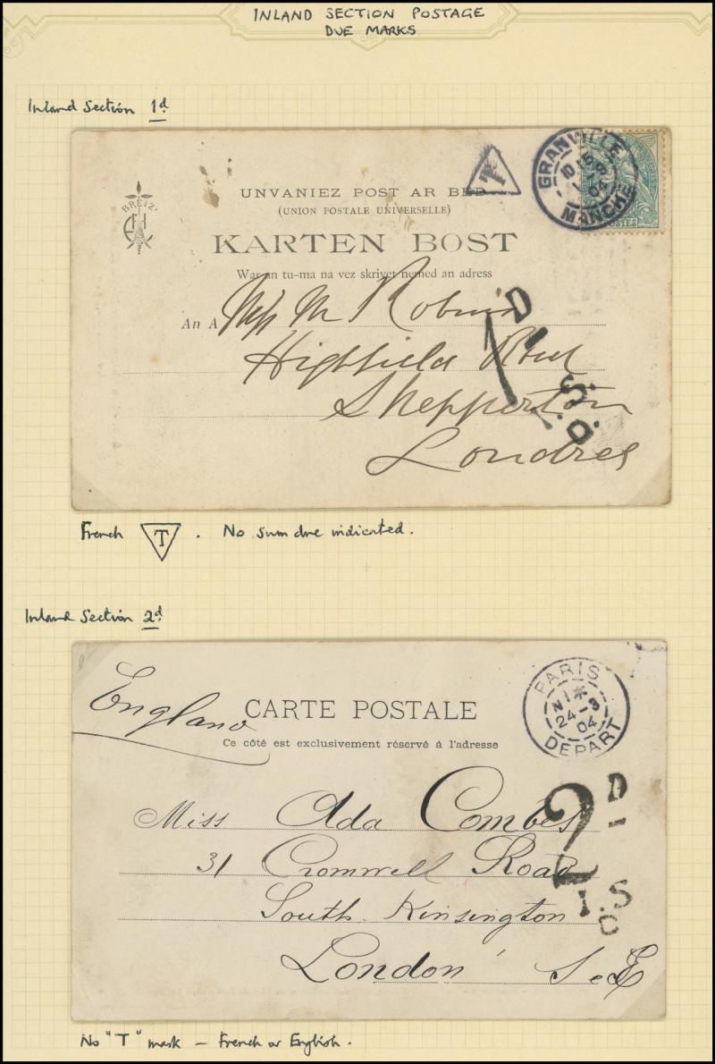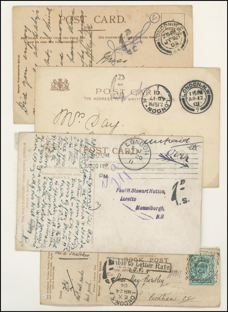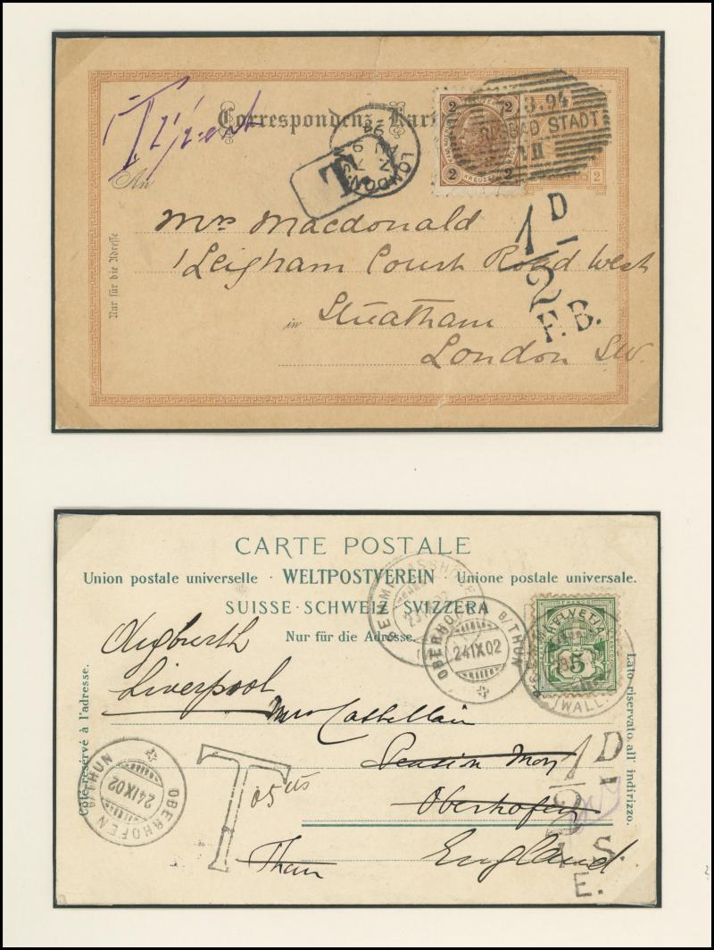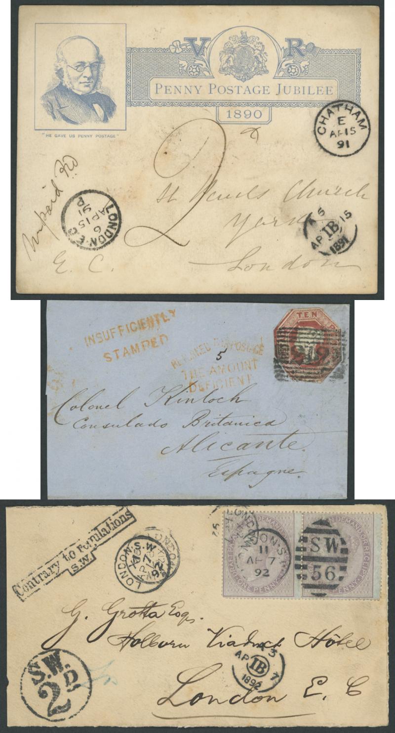To Pay markings and Large Figure cachets, 1890 Penny Postage Jubilee insert card used as postcard endorsed "Unpaid" with Inspector Mark, 1892 front with Revenue Stamps 1d lilac/blue pair tied by London duplex cancels but 'Contrary to Regulations/S.W'