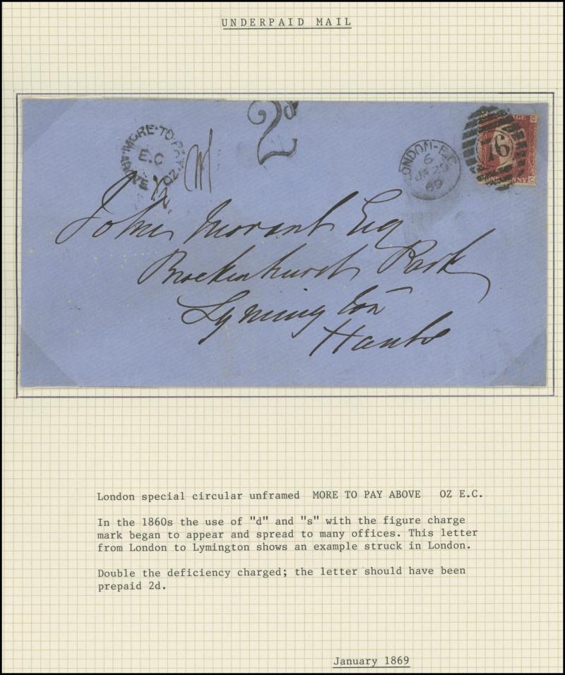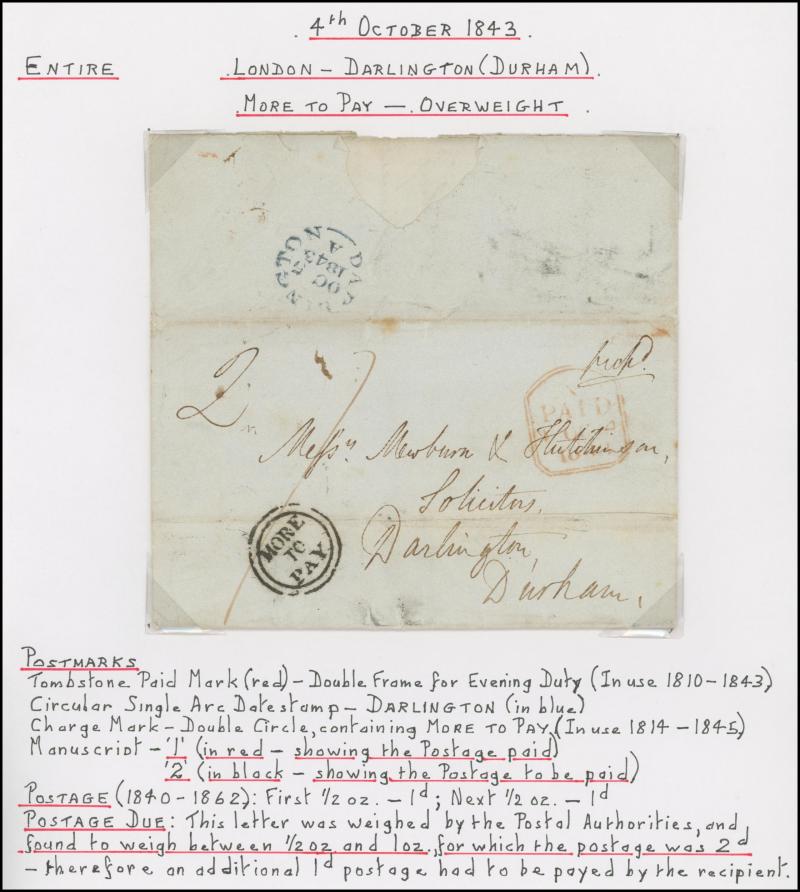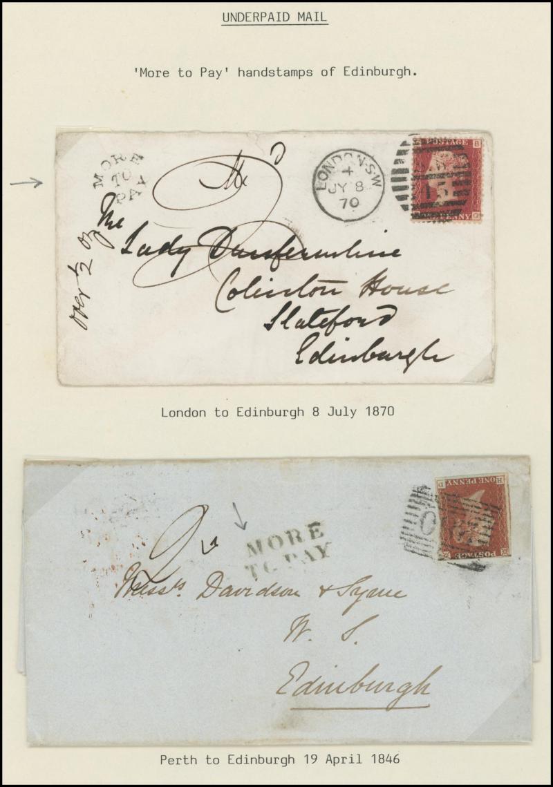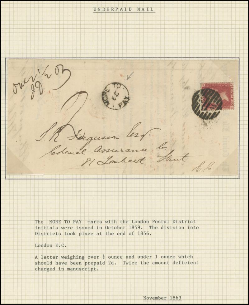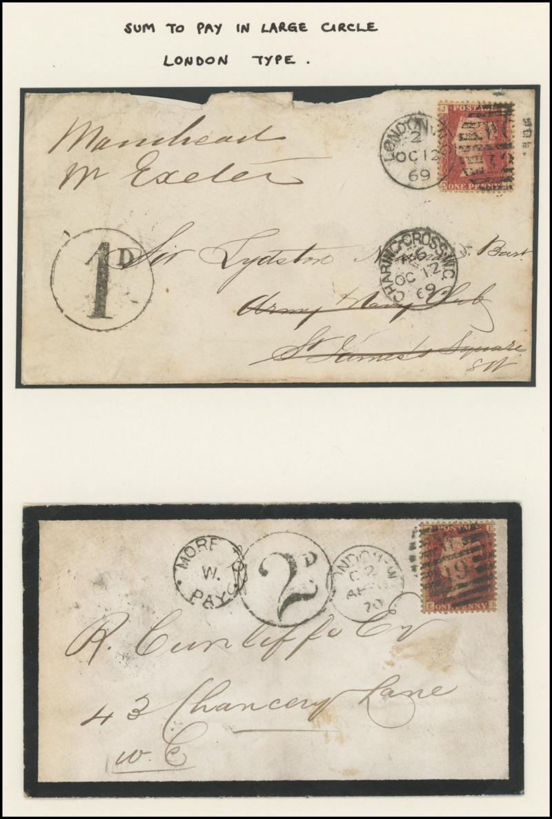 Taxed Mail 19th Century group many on annotated display pages from 1838 to London with 'MORE/TO/PAY' double-ring cachet, 1854