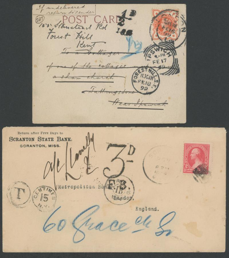 pair, USA 1884 with ½d green, 1d lilac pair & 2d rose (SG 168; Cat £300 on cover) and 1898 with 1d lilac x4 and Inland Revenue Postal Fiscals 1d lilac strip of 3 (SG F11; Cat £160 for single on cover), etc, various instructional markings, potential