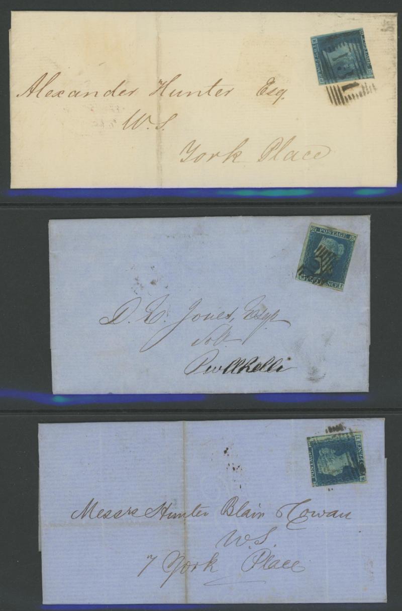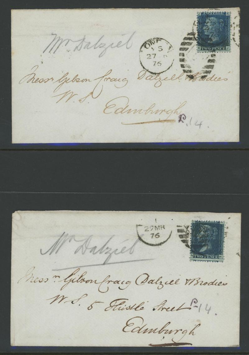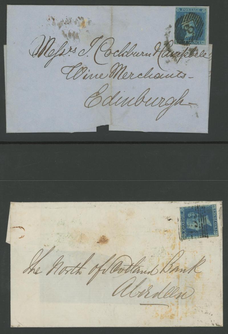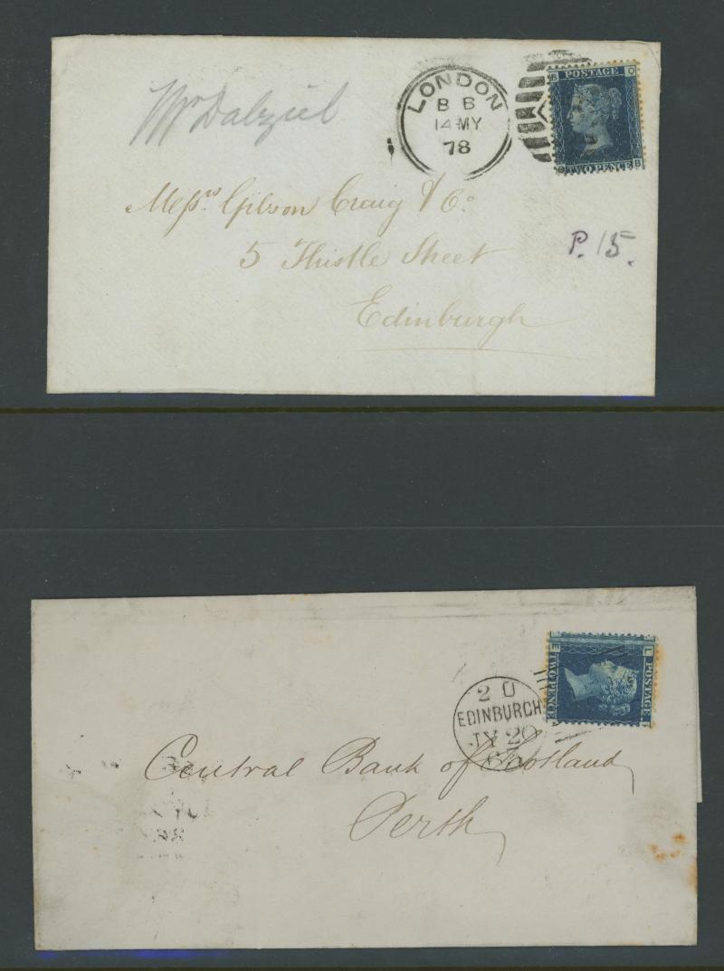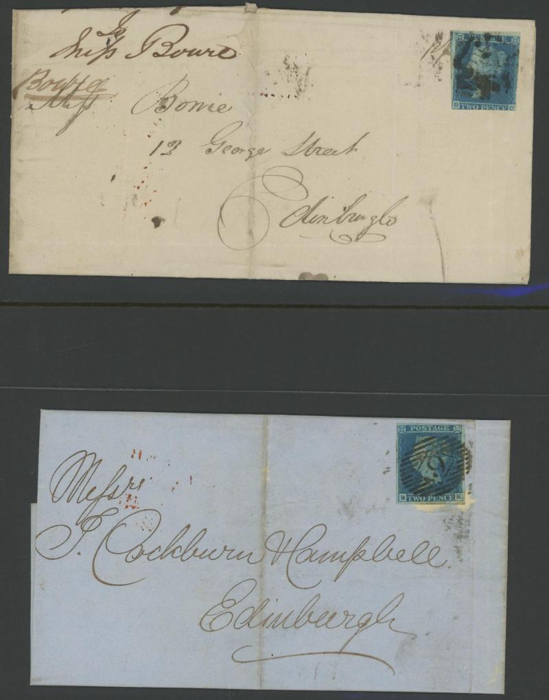 envelopes x19 including a strip of 3 [CD-CF; CE Re-Entry] (slightly cut-into at top) tied by Edinburgh Numeral '131' cancels on entire to Bridge of Earn, vertical pair [KA-LA] (slightly cut-into at right) on entire from Cupar to Kirkaldy with 'TOO