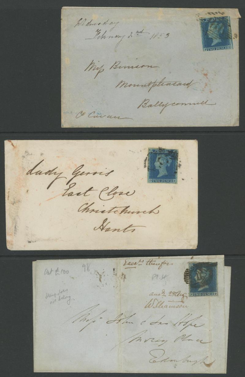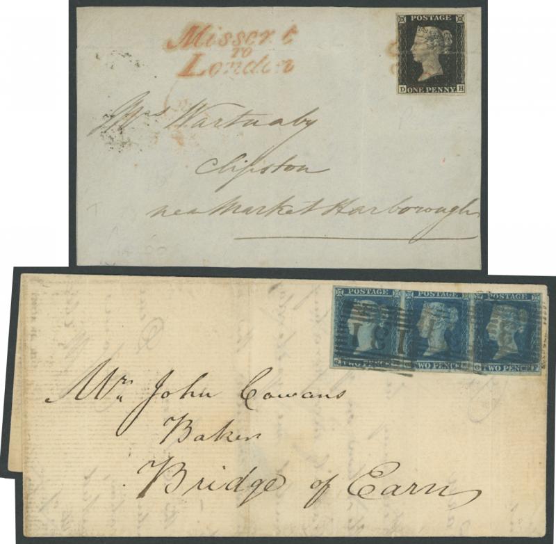 black plus with Maltese Cross cancels in red on outers or entires x3 and on front with 'Missent/TO/London' cachet alongside (this stamp 4 margins with light file fold; the others mostly with 3 margins), and 1841 Tuppence Blue White Lines entires &