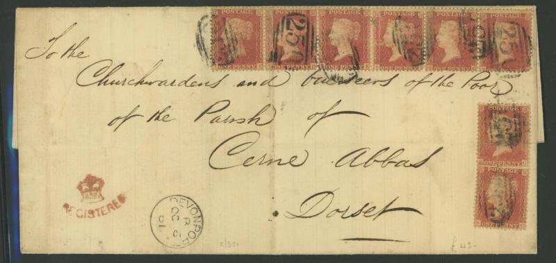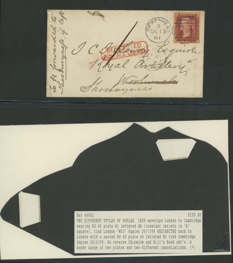 re-posted with 1d Plate 44 tied Cambridge sideways duplex, 1861 Birkenhead to 'Royal Artillery, Woolwich' redirected with manuscript "1"[d] to pay and very fine 'REDIRECTED/POSTAGE UNPAID' handstamp in red, 1861 registered Devonport to Dorset with 1d
