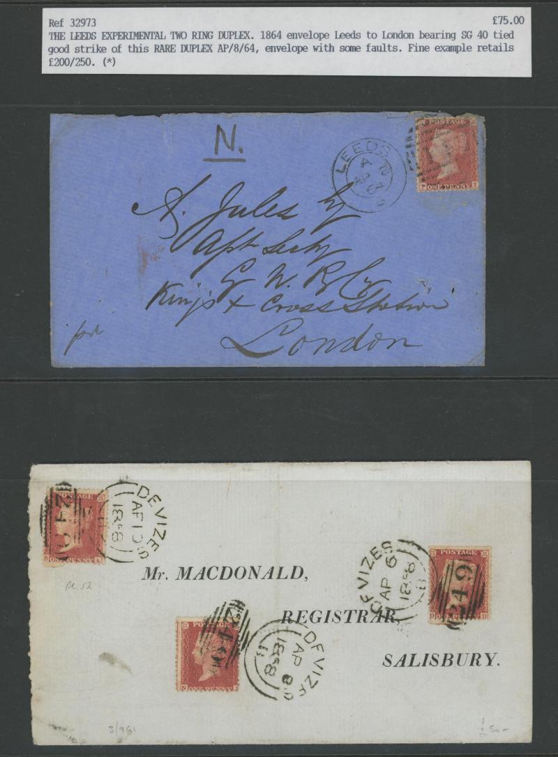 Receiving House 'DUKE STREET' multiple strikes on 1d horizontal strip of 4, Leeds 1864 double-ring duplex, 'Spoon' duplexes of Bristol, Birmingham x2 (one sideways) & Hull x2 (one sideways), etc, condition a little variable with some file folds &
