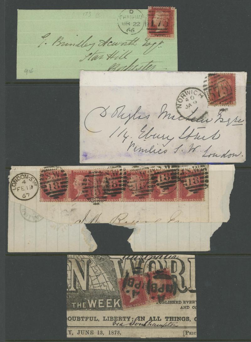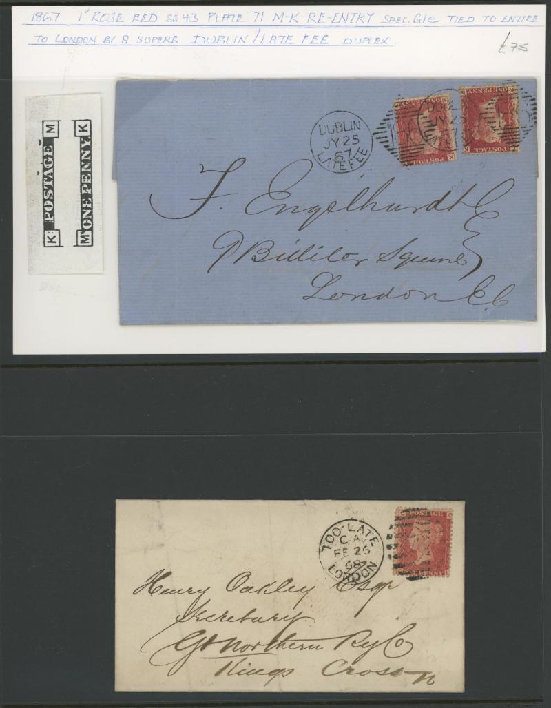 horizontal strip of 3 tied by London duplex cancels and 'NEWPORT-I-W' arrival backstamp, 1867 entire to London with 1d x2 [KL & MK with Re-Entry] tied 'DUBLIN/LATE FEE' duplex cancels, 1867 re-addressed local London envelope with