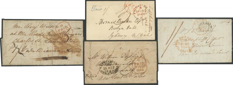 '1JA1/1847' to the prominent businessman & politician "Thomas Barker/Roslyn Hall/Sydney", poor Sydney backstamp of 'MY*25/1847', very fine; and 4) 45th Sailing per 'Alert' lengthy entire letter - Colin Tabeart states only 153 letters carried - with