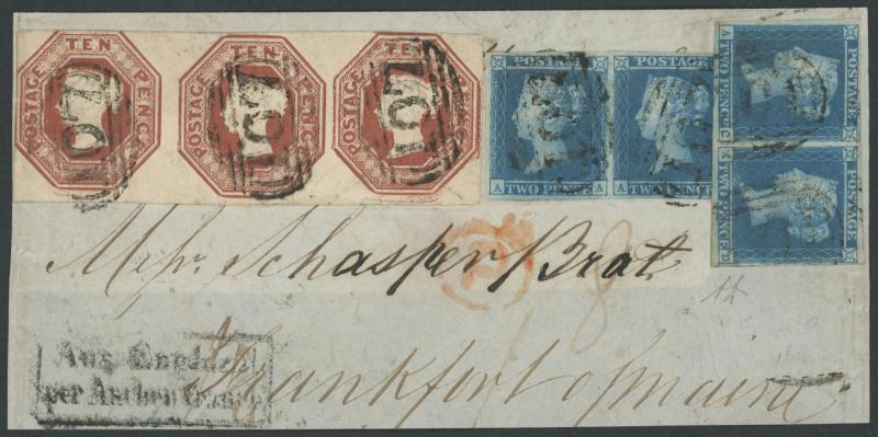 1849 large-part outer to Germany with exceptional franking of QV Line-Engraved Imperf 2d blue White Lines pairs [AA-AB] and [AC-AD]