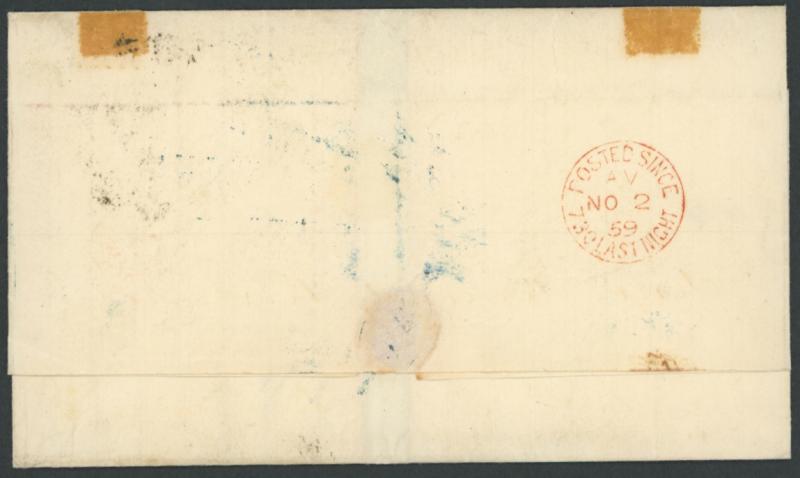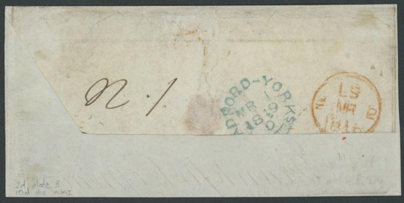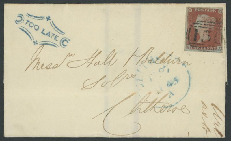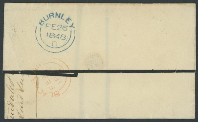 & below in blue on the face, 'BLACKBURN' transit backstamp in red and light but legible 'CLITHEROE/FE27/1848/ A ' arrival cds in blue on the face, light file folds clear of the adhesive & markings. Graham Hayward states that this Too Late marking is