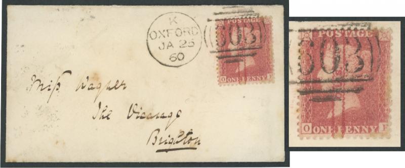 Line-Engraved Stars 1d red 'O.U.S.' [Oxford Union Society] vertical overprint in red solo tied by largely very fine 'OXFORD - 603' duplex cancel, Brighton arrival backstamp of the next day, minor blemishes, SG Specialised PP220, Cat £200 on cover. (Image1) (Image2)
